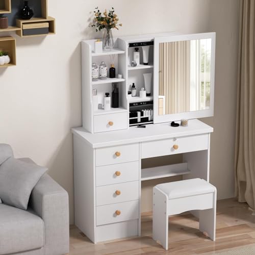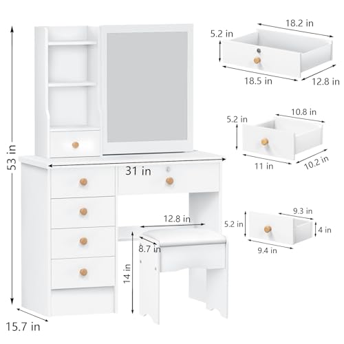 Tavolo da trucco bianco con specchio, 6 cassetti e ripiani aperti, elegante tavolo da toeletta in legno per camera da letto : Amazon.it: Casa e cucina