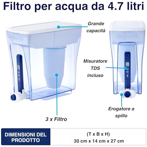 ZeroWater Combo Distributore di acqua filtrata 4,7 L, 3 filtri e misuratore della qualitá dell'acqua inclusi, Plastica priva di BpA e certificato per la Riduzione di Piombo e Altri Metalli Pesanti : Amazon.it: Casa e cucina