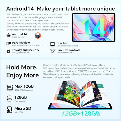 TECLAST P30 Android 14 Tablet 10.1 Pollici, 12GB RAM 128GB ROM(TF 3TB), 2GHz Octa Core, Widevine L1/5GHz WiFi/GPS/OTG/BT5/6000mAh/Tablet con Custodia Tastiera Penna 3.5mm Auricolari, 8 Accessori 2025 : Informatica
