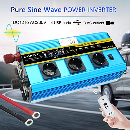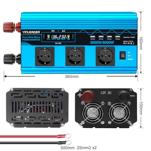 Inverter 3000 W/6000 W, convertitore di tensione sinus puro 12 V, 230 V, con 3 prese europee e 4 porte USB, indicatore di tensione LCD : Amazon.it: Elettronica