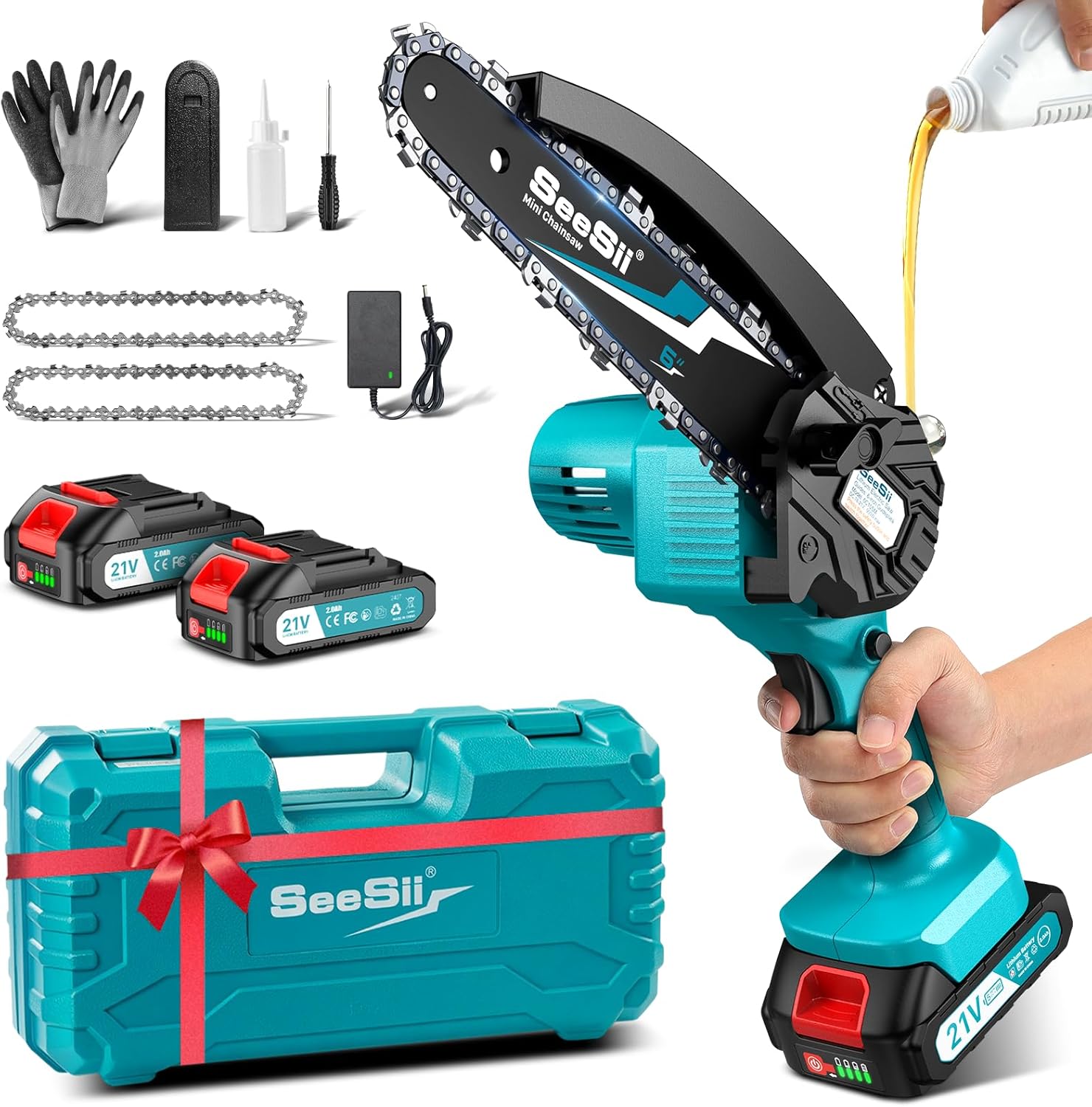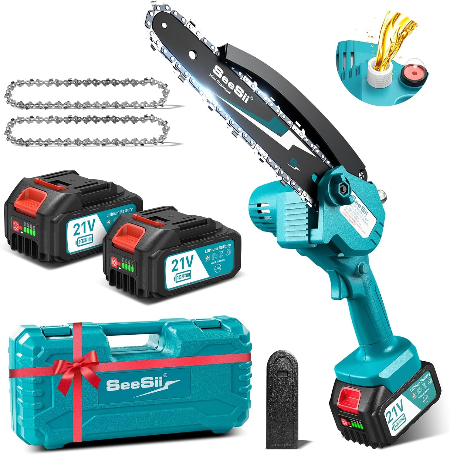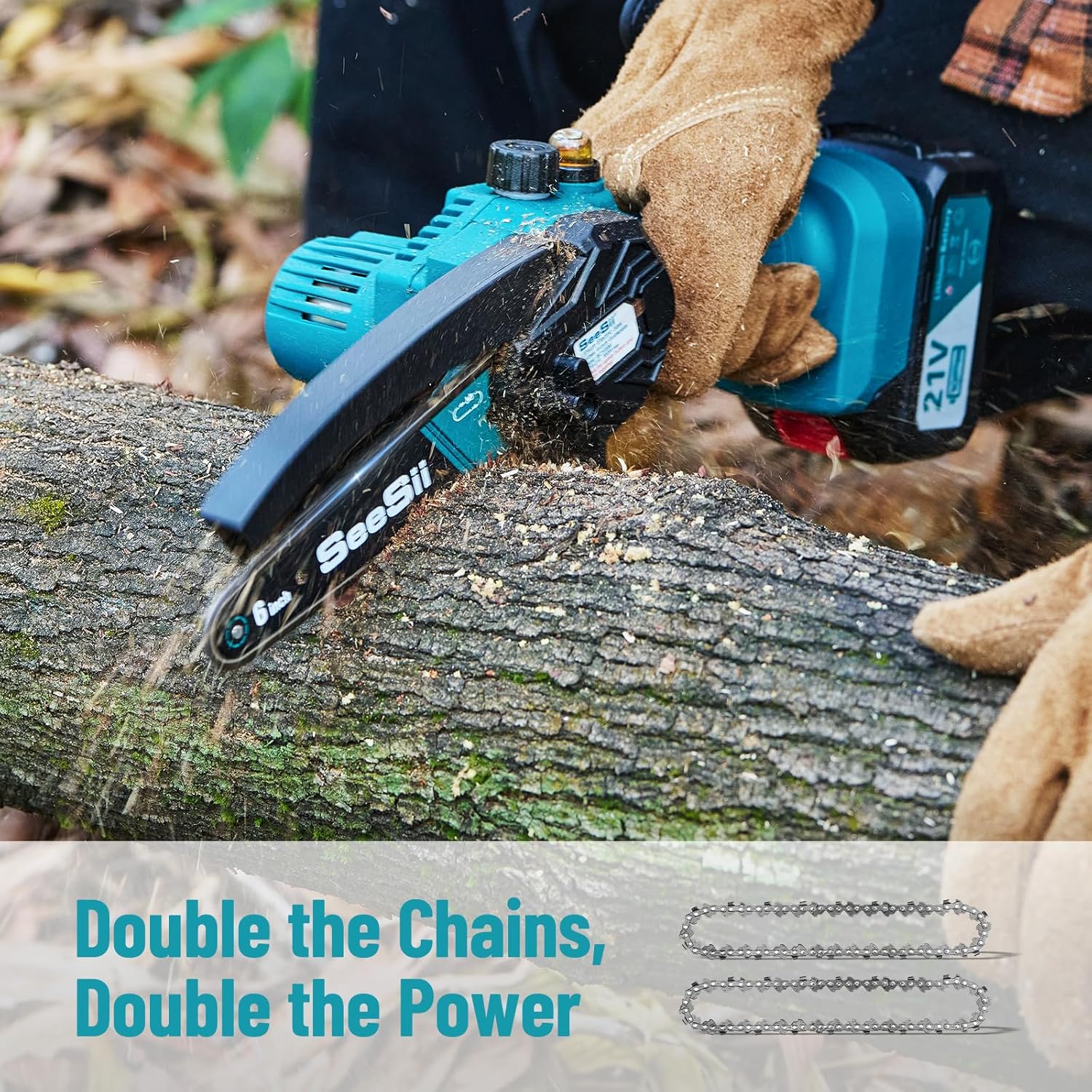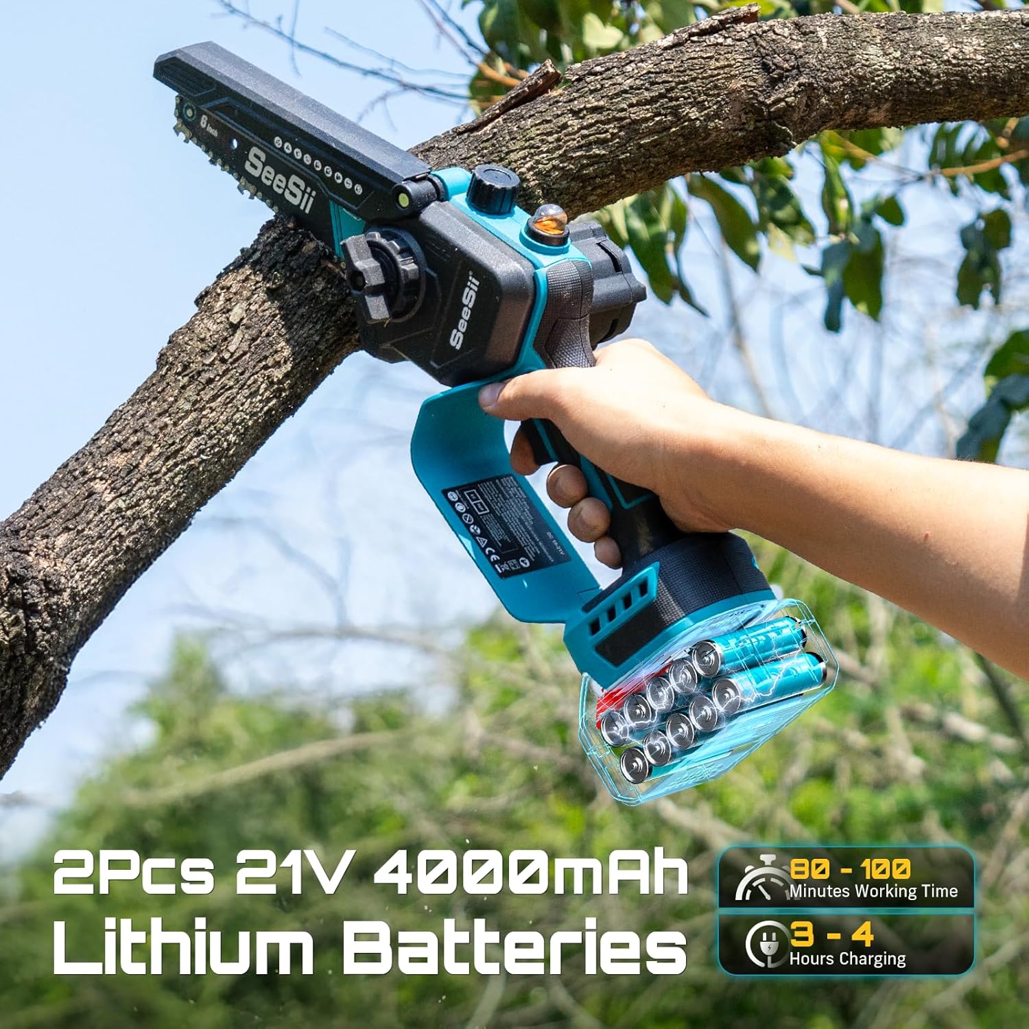 SEESII Mini Motosega a Batteria 8000mAh, 900W 6 Pollici Motosega Elettrica per Potatura con Pompetta Olio e Catena di Ricambio, Motosega da Potatura per il Taglio del Legno Giardini, 6C10SM