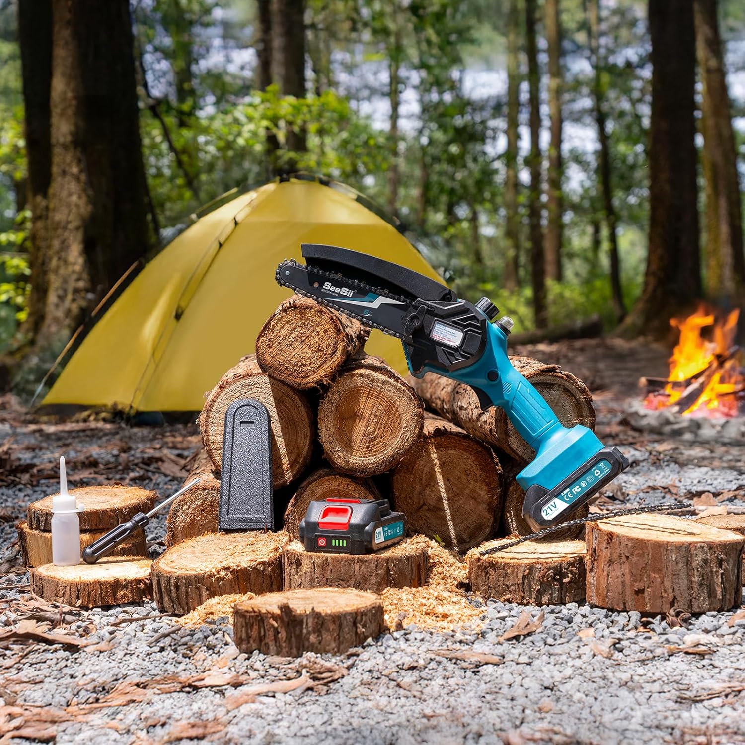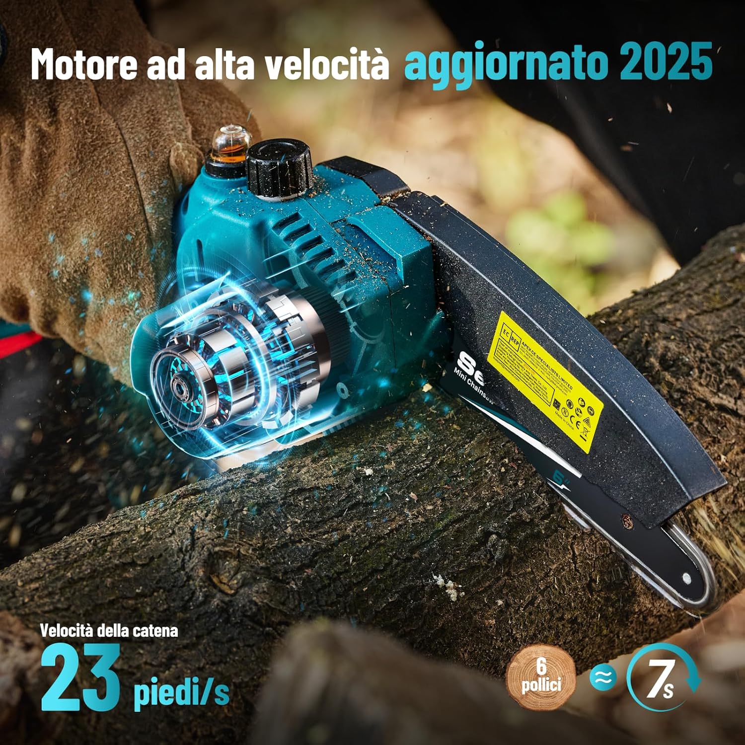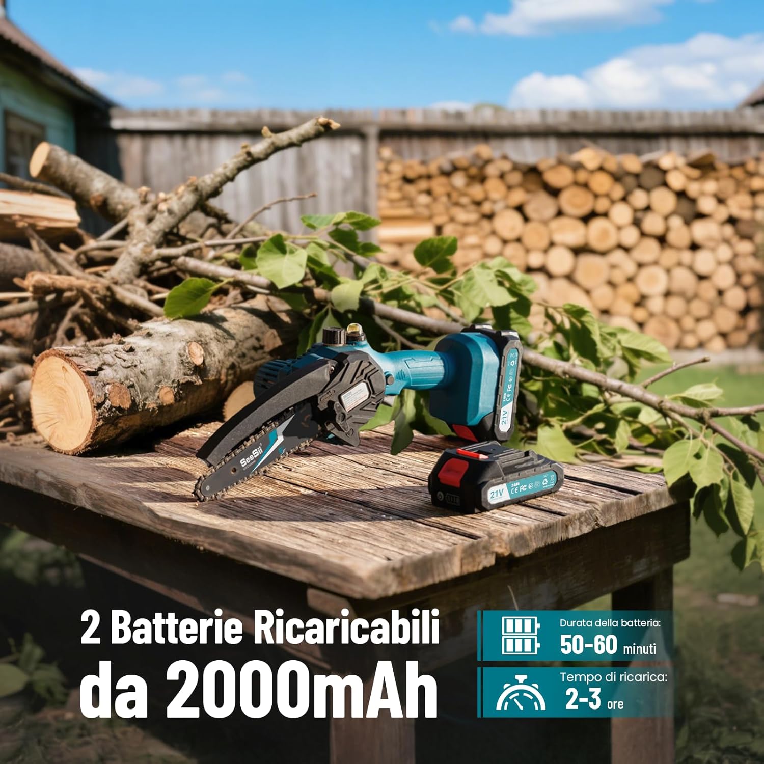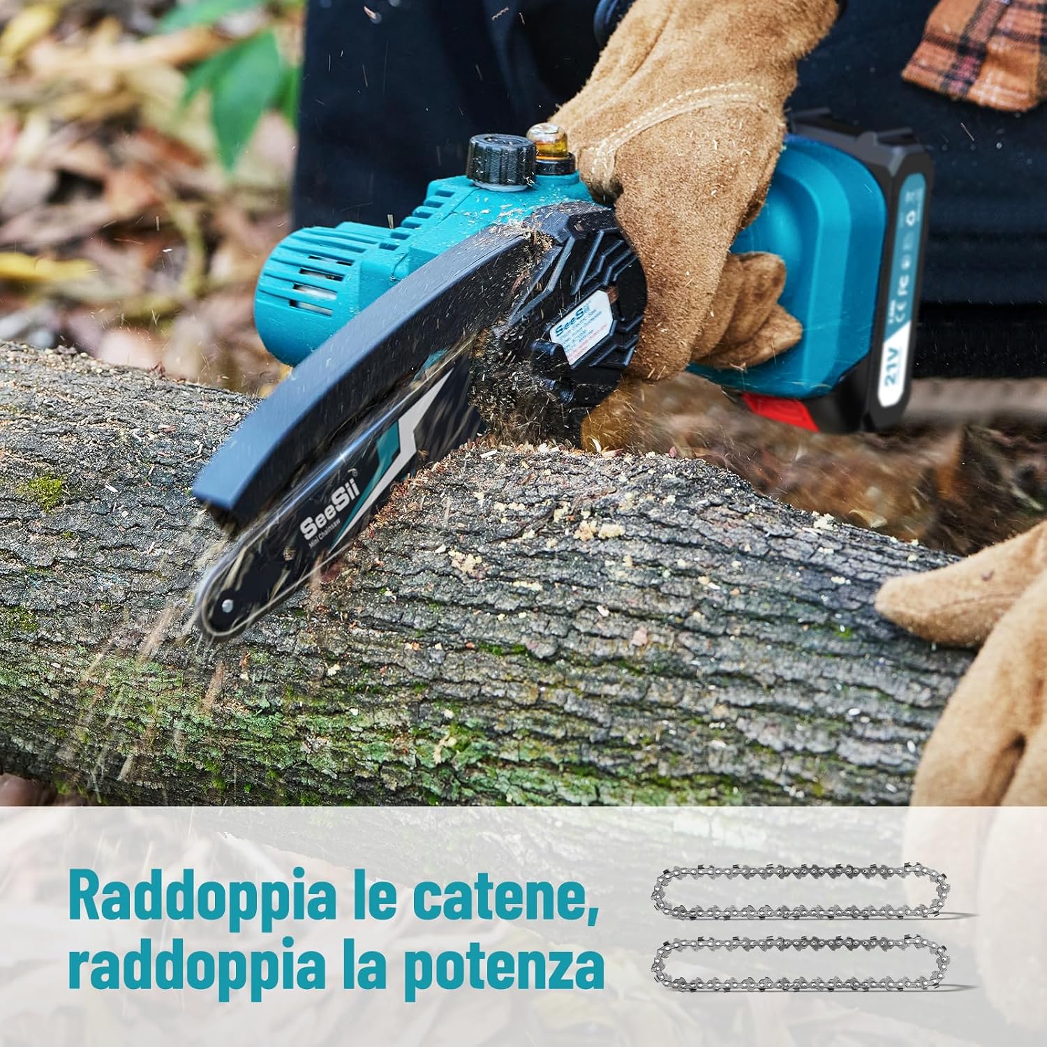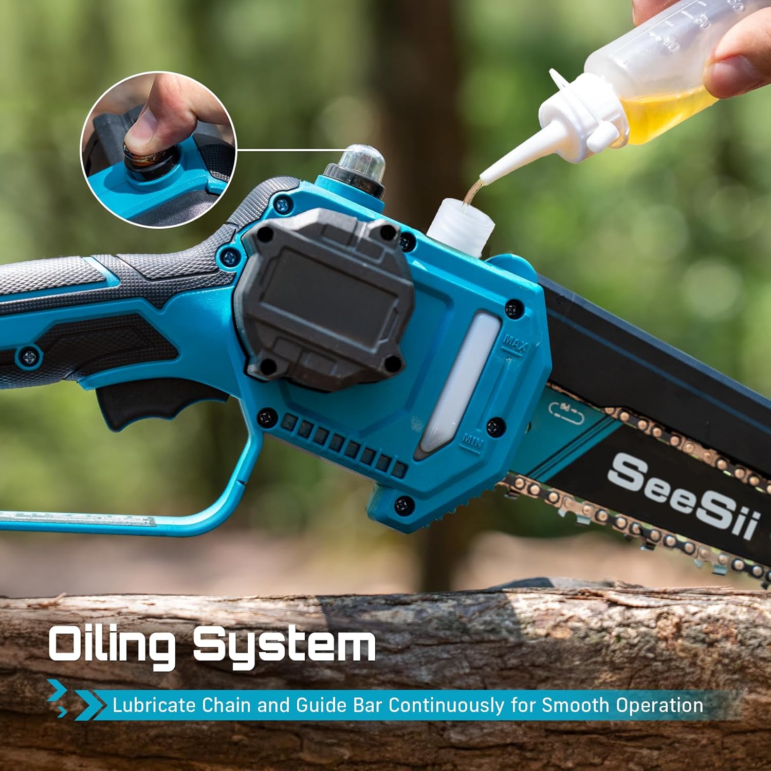 SEESII Mini Motosega a Batteria 8000mAh, 900W 6 Pollici Motosega Elettrica per Potatura con Pompetta Olio e Catena di Ricambio, Motosega da Potatura per il Taglio del Legno Giardini, 6C10SM