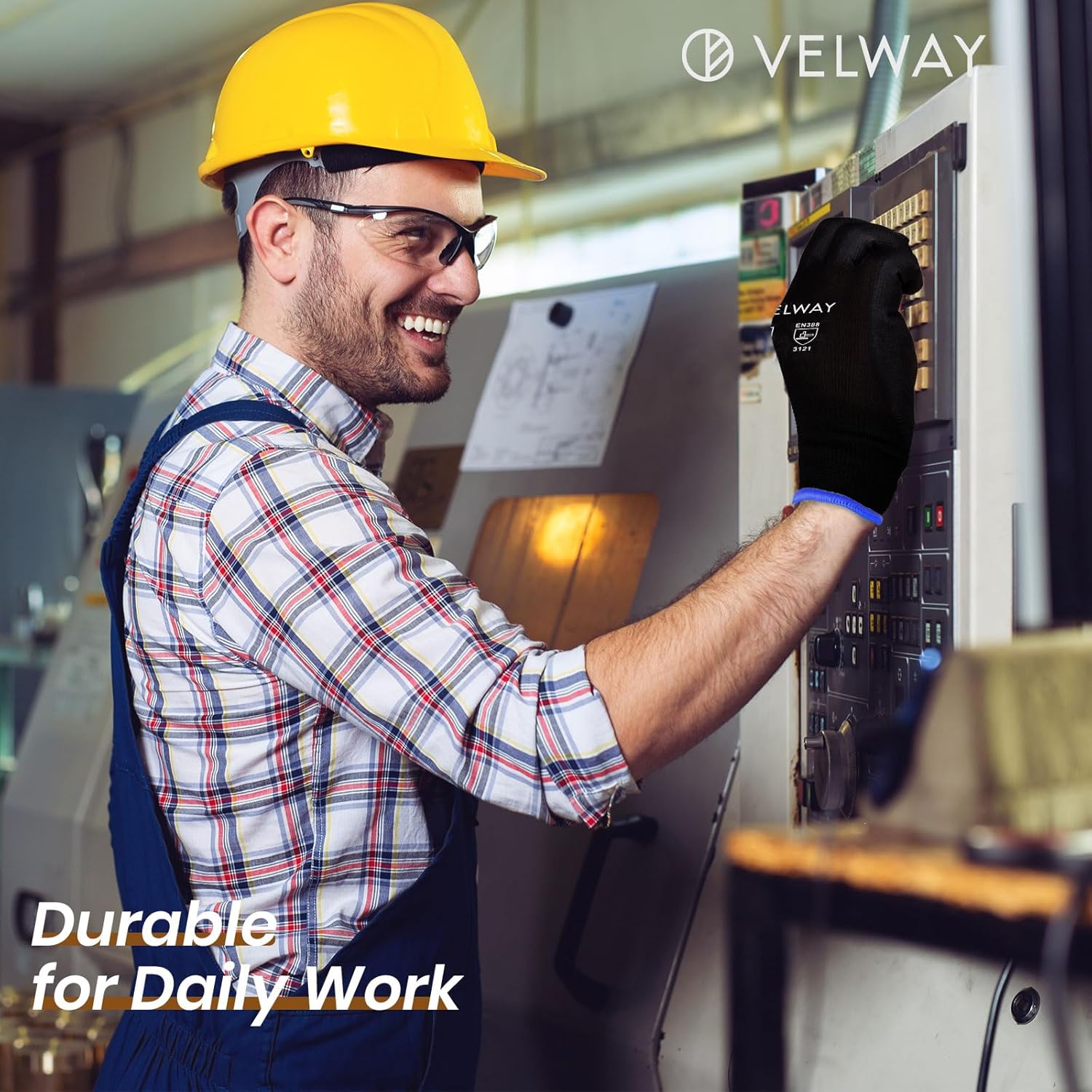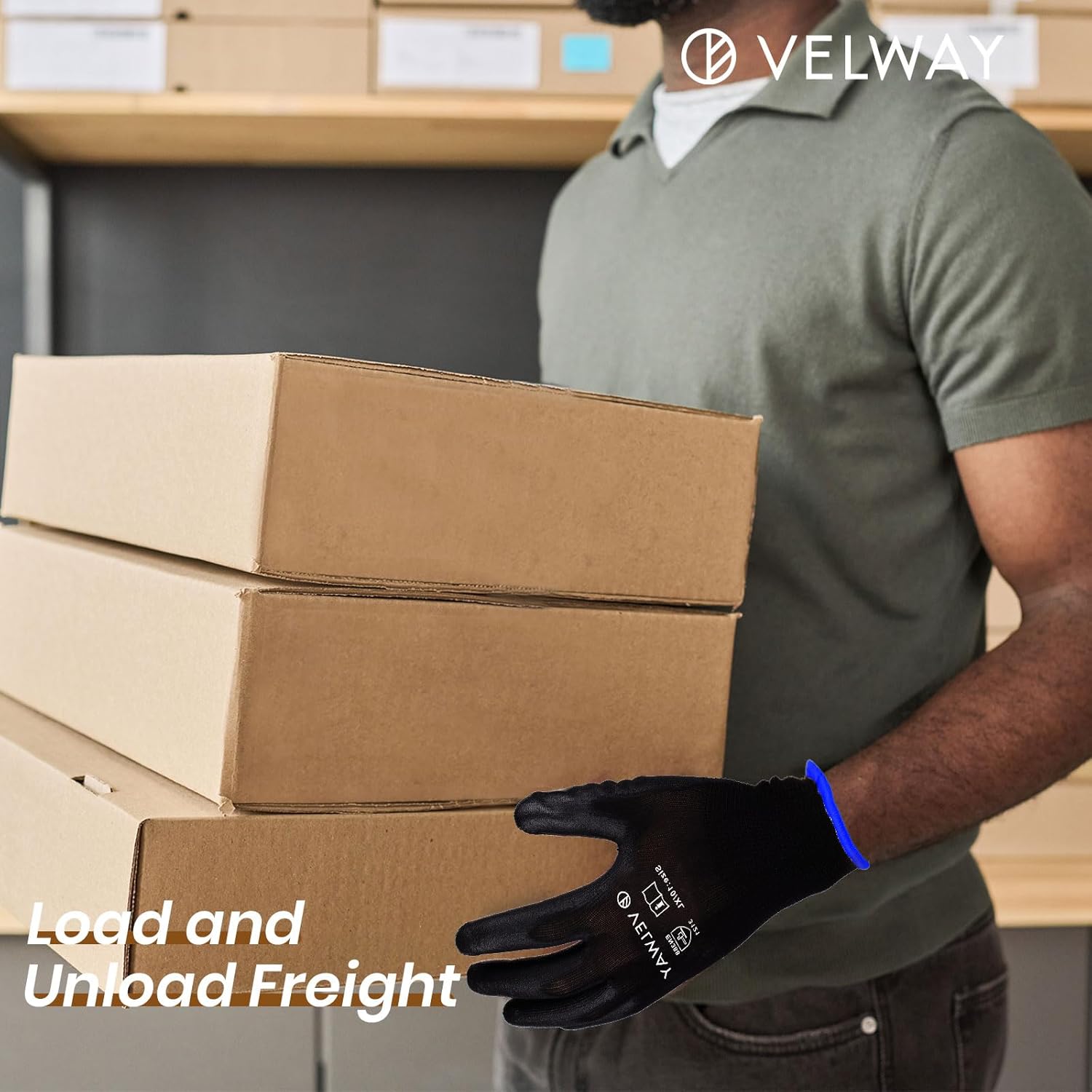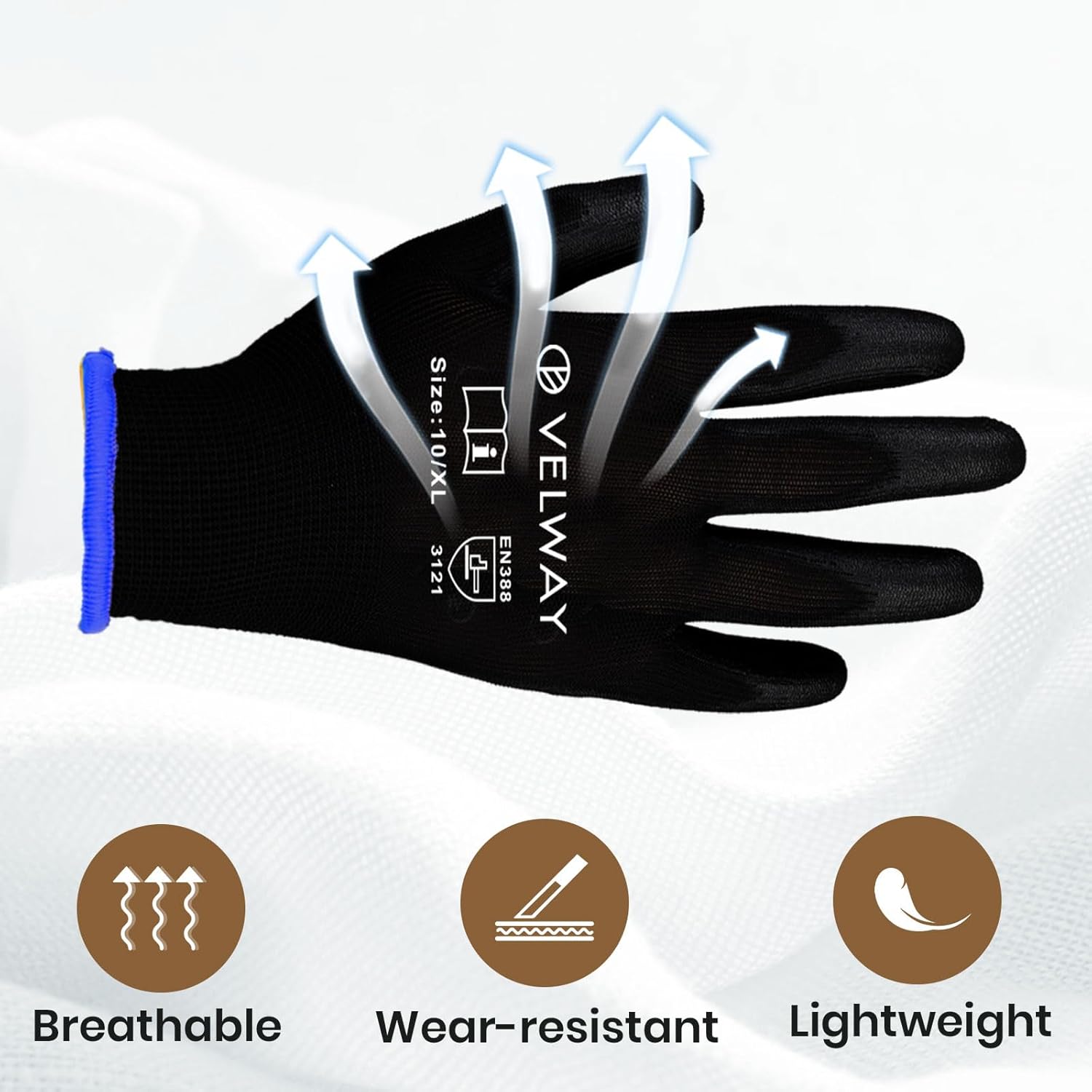 Velway Guanti da Lavoro Protettivi 12 Paia - Resistenti all'Abrasione - Fibra Poliestere con Rivestimento in PU - Versatile Protezione Meccanica Industriale Giardinaggio Montaggio - Nero Taglia 10/XL