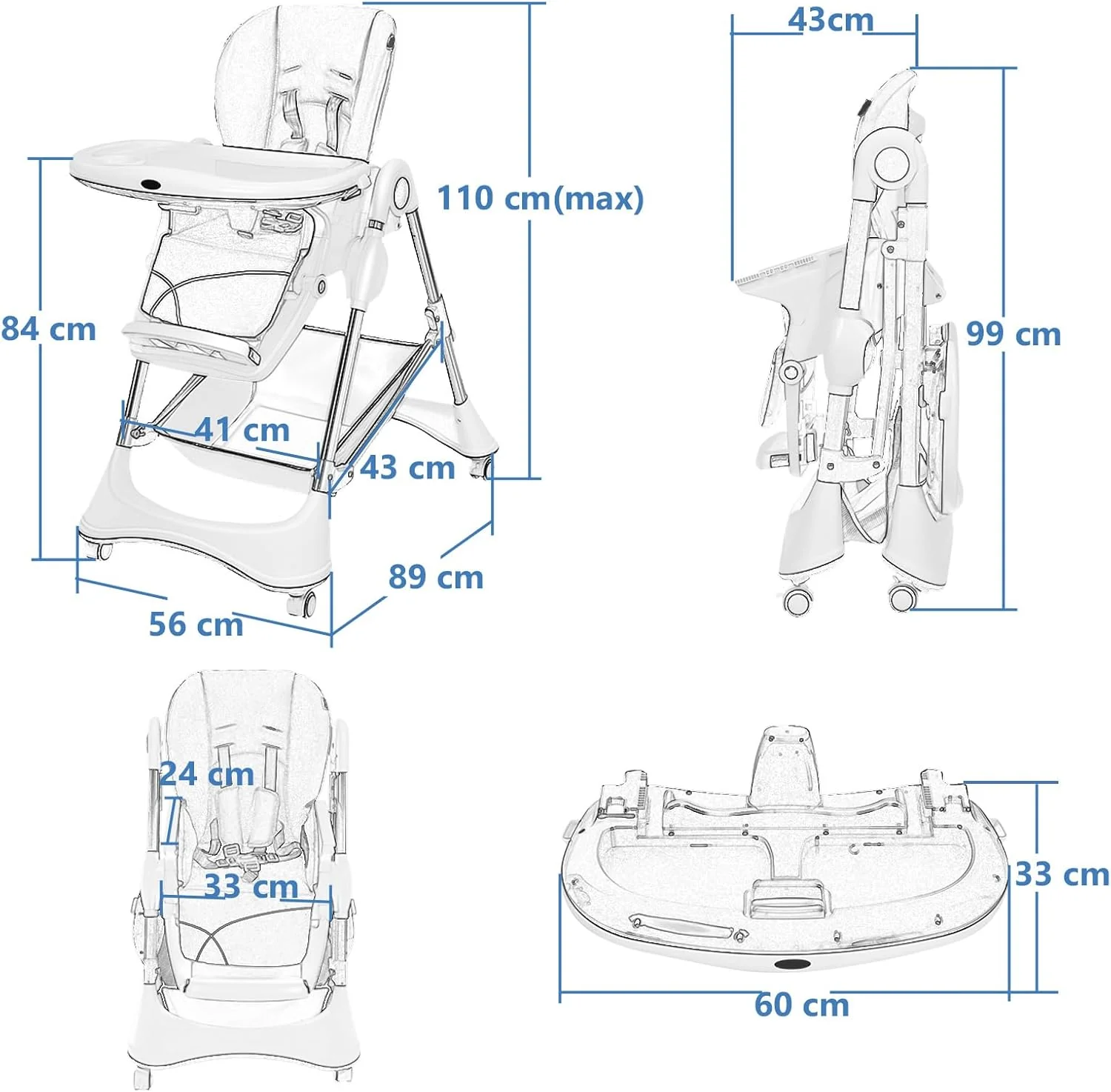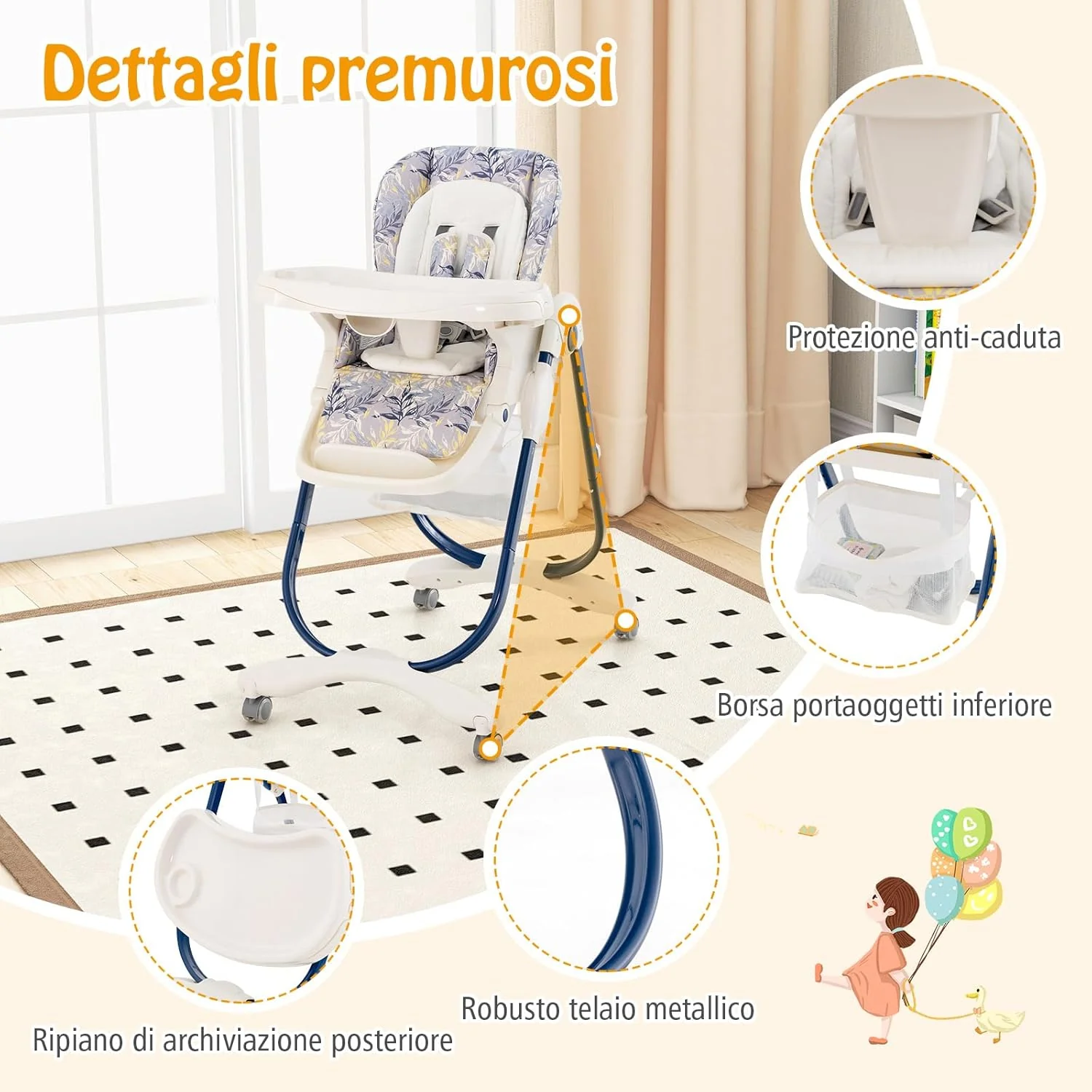 Seggiolone Pappa per Bambini e Neonati, Seggiolone Pieghevole Multifunzione con Ruote, Altezza Regolabile, Poggiapiedi e Schienale, Vassoio Rimovibile, per 6-36 Mesi (Blu)