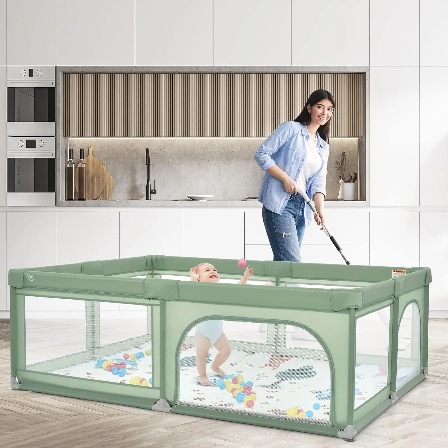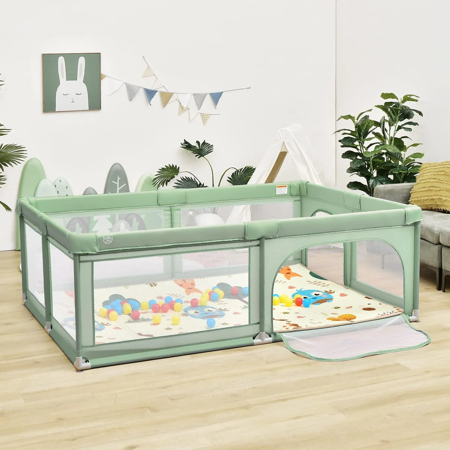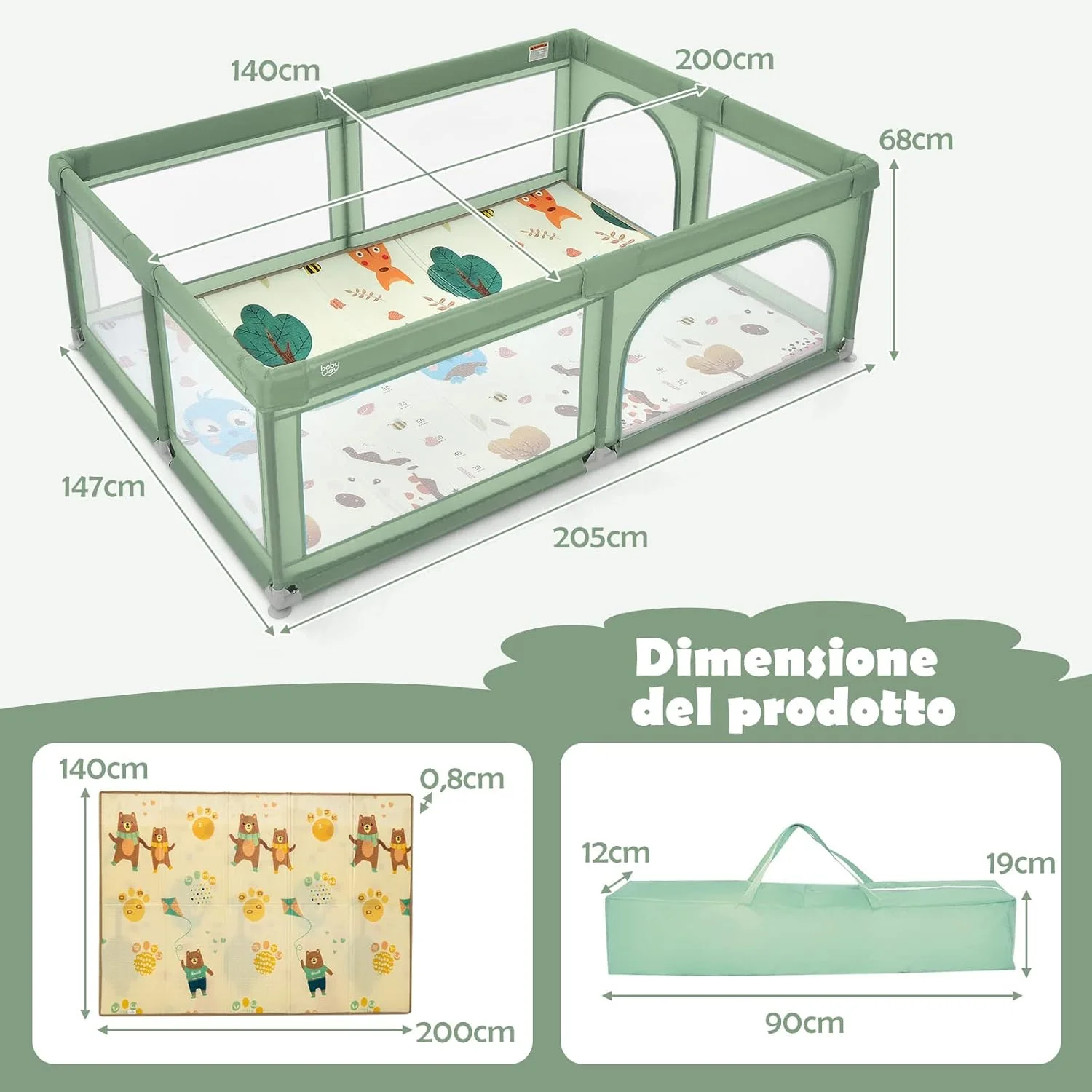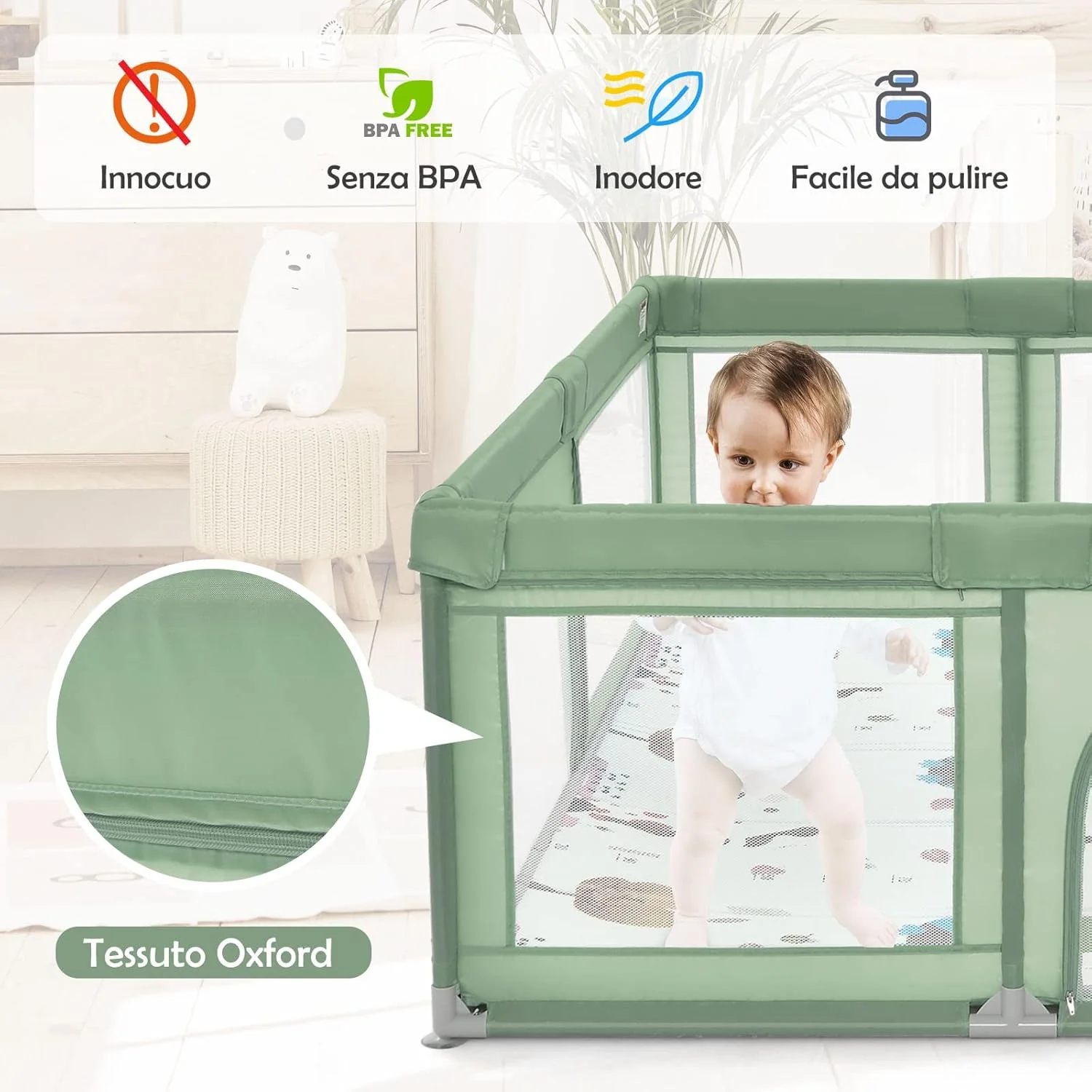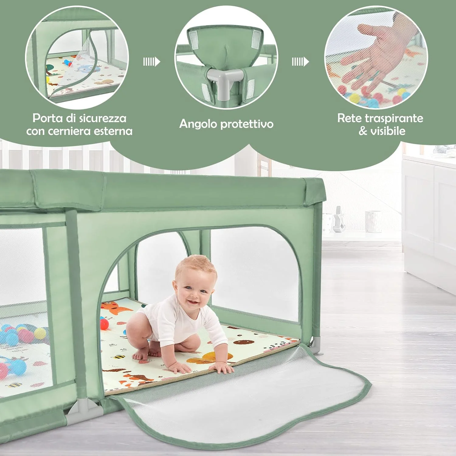 Recinto per Bambini con Materasso, Box per Bambini con Tappetino, Rete Traspirante e Apertura a Cerniera, Box Giochi con Borsa, 4 Impugnature e 50 Palline, per Bambibi 0-3 Anni (Verde)