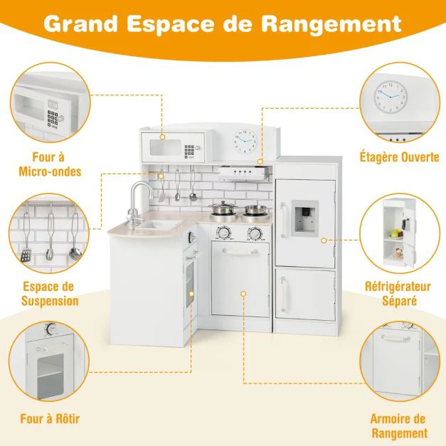 Angolo cottura per bambini frigorifero fornello giocattolo in legno con distributore d'acqua cappa lavello utensili