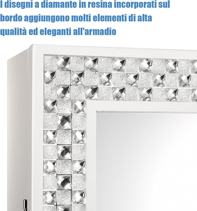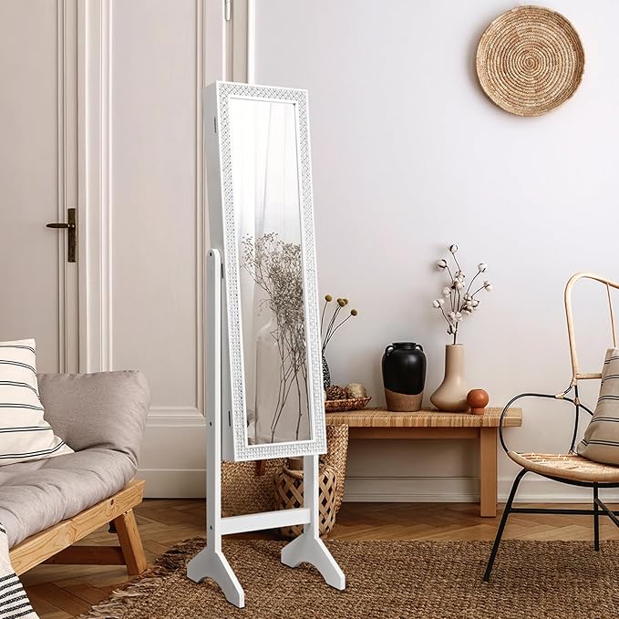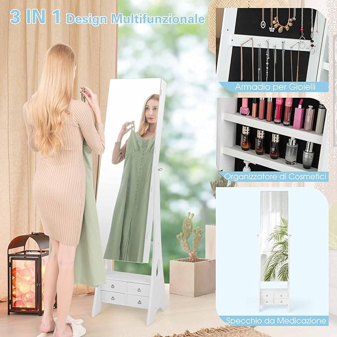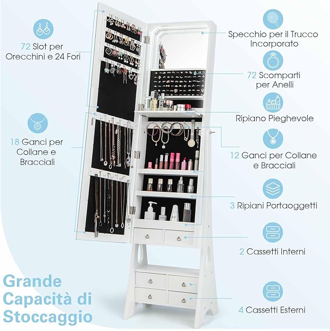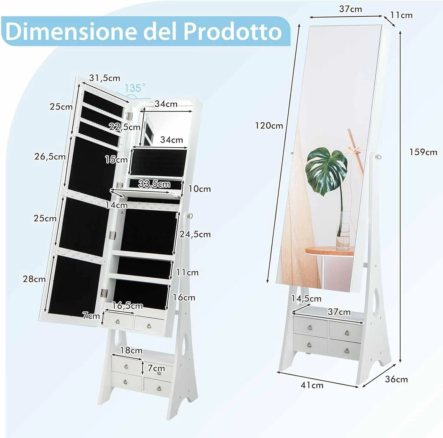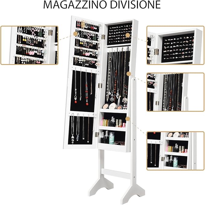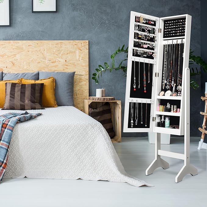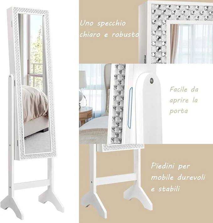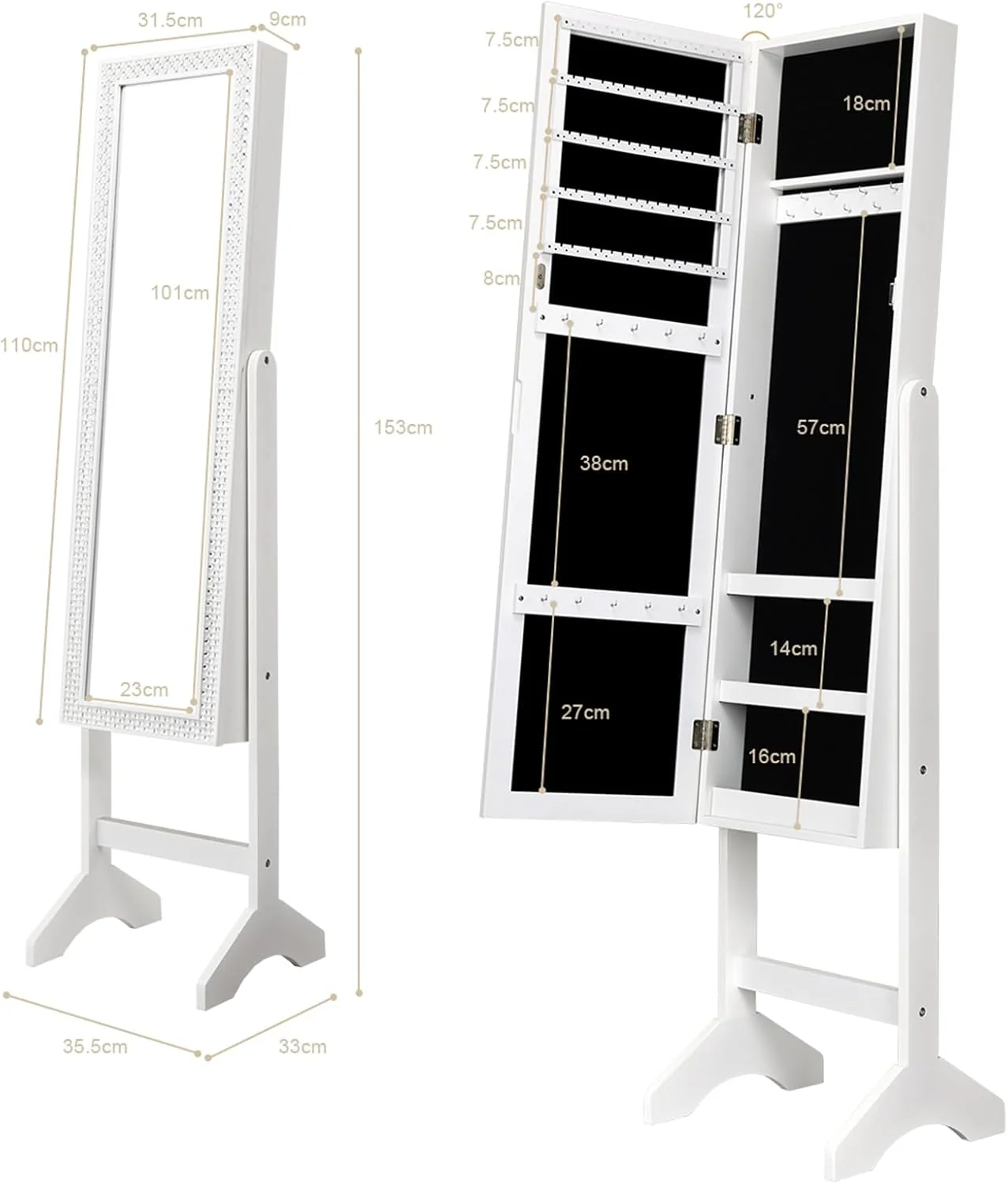 Armadio per Gioielli, Armadietto Portagioie con Specchio a Figura Intera, Organizer Spazioso per Gioielli, per Camera da Letto e Salotto, 35,5 x 33 x 153 cm (Bianco)