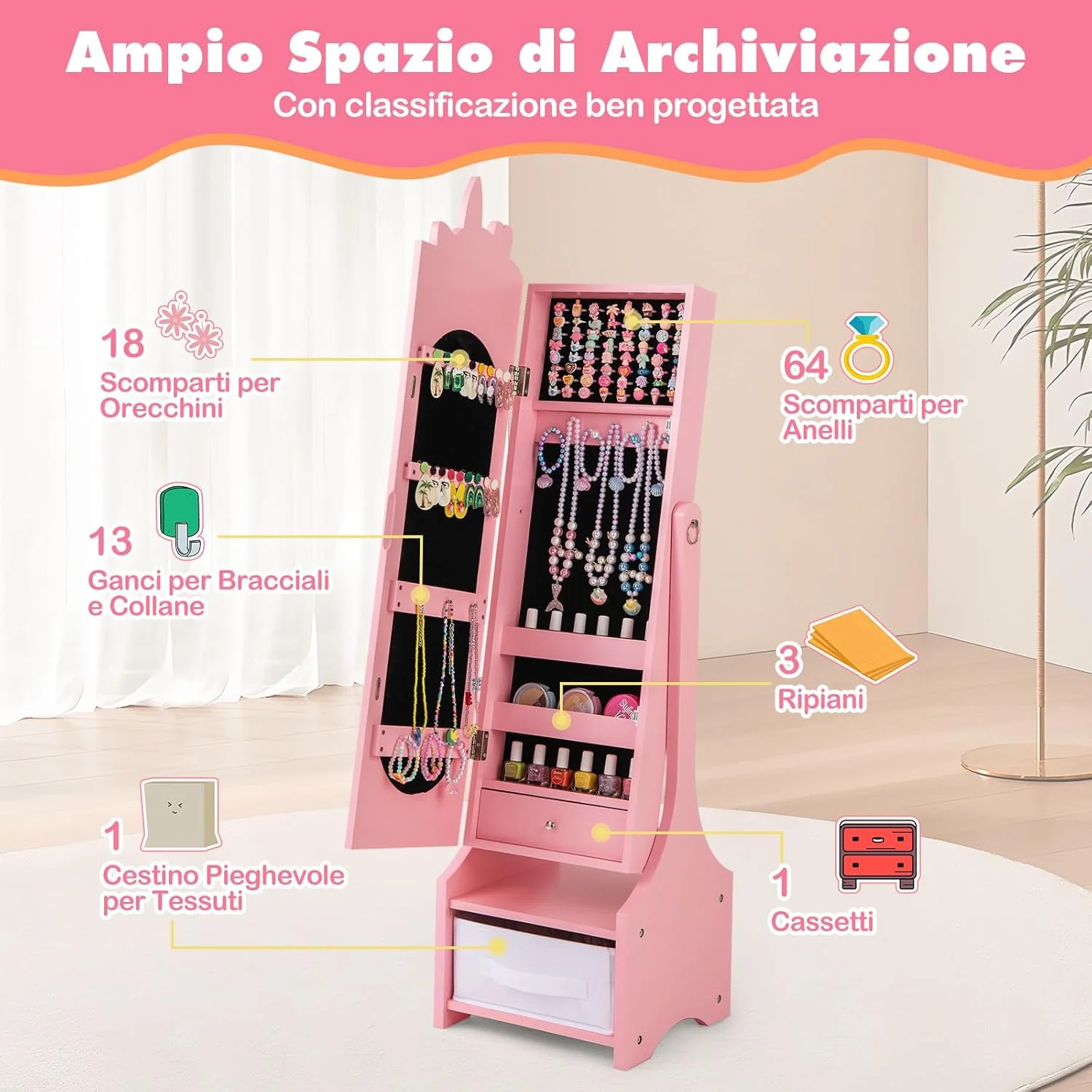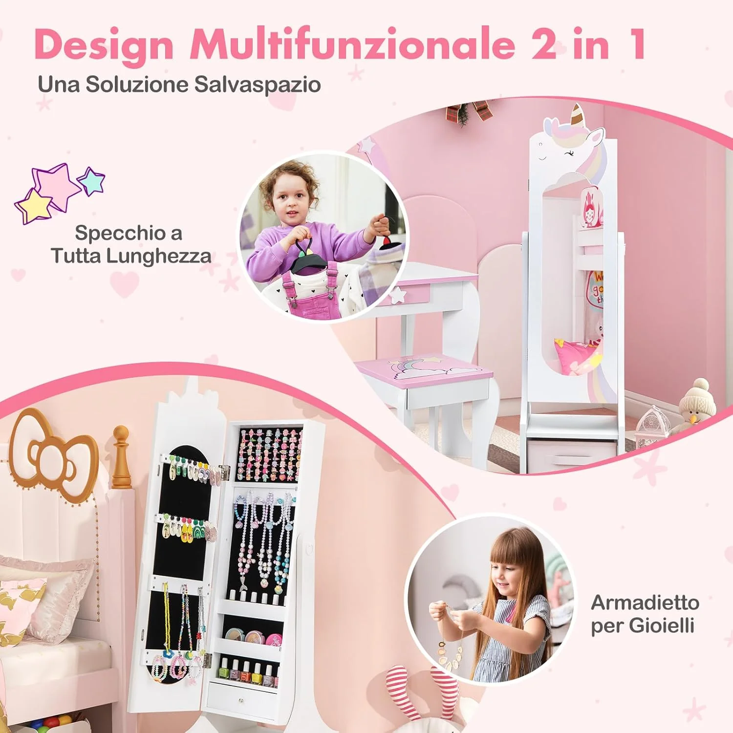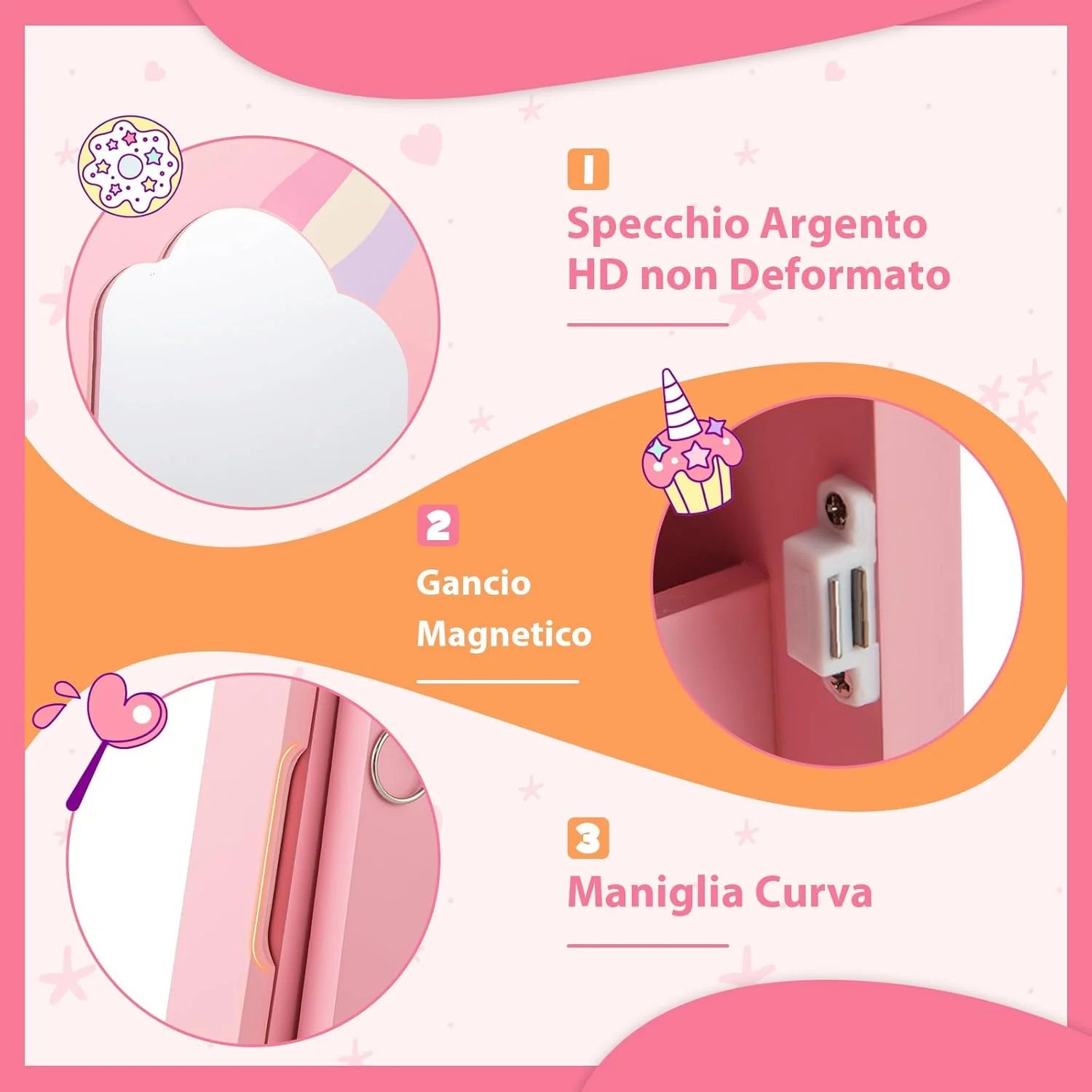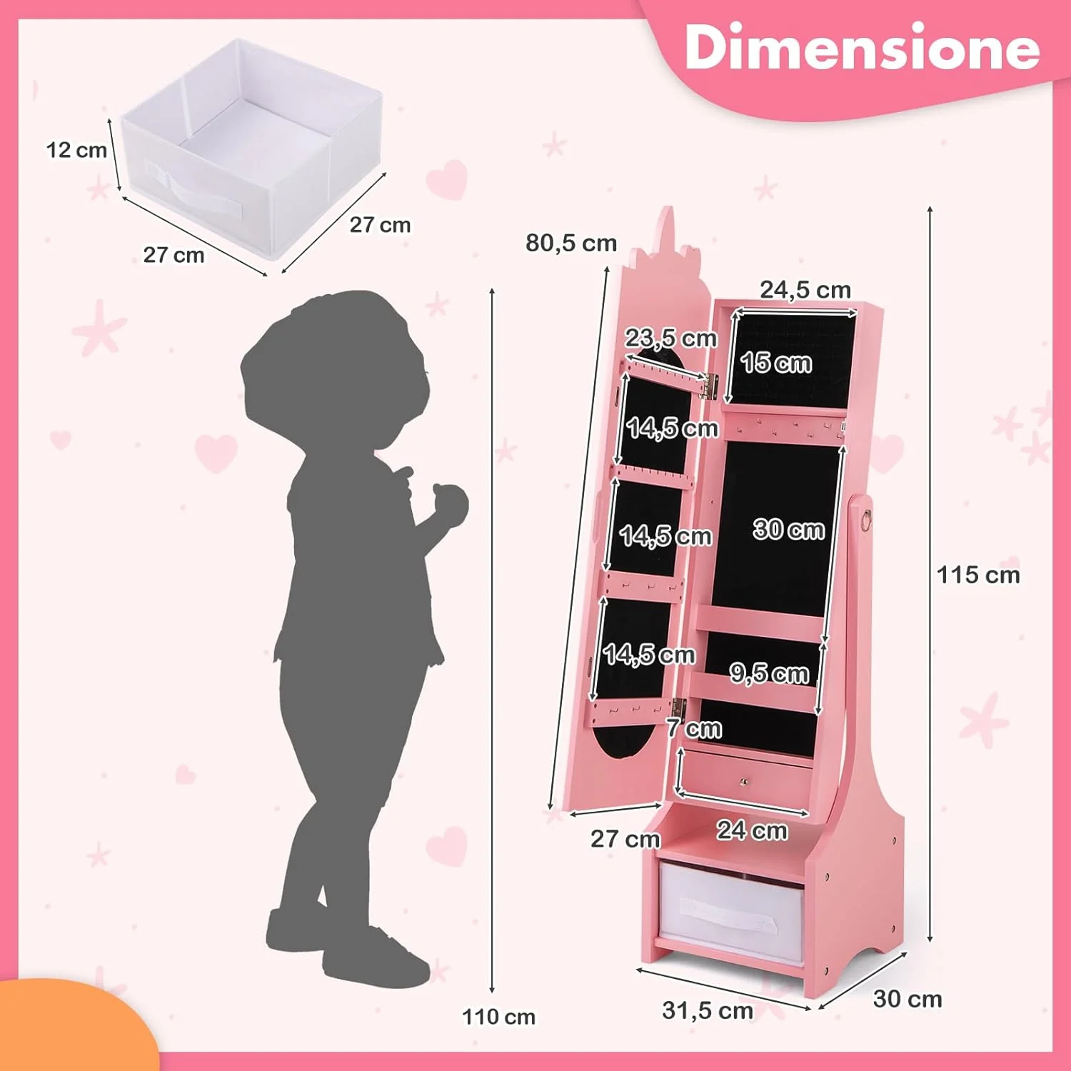 Armadietto Portagioie per Bambini 31,5 x 30 x 115cm, Specchio a Figura Intera a Forma di Unicorno con Ganci, Ripiani e Cassetti, Specchiera da Toeletta per Cameretta, Bianco (Rosa)