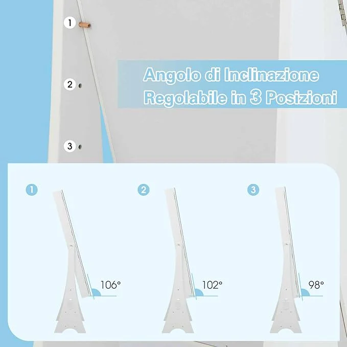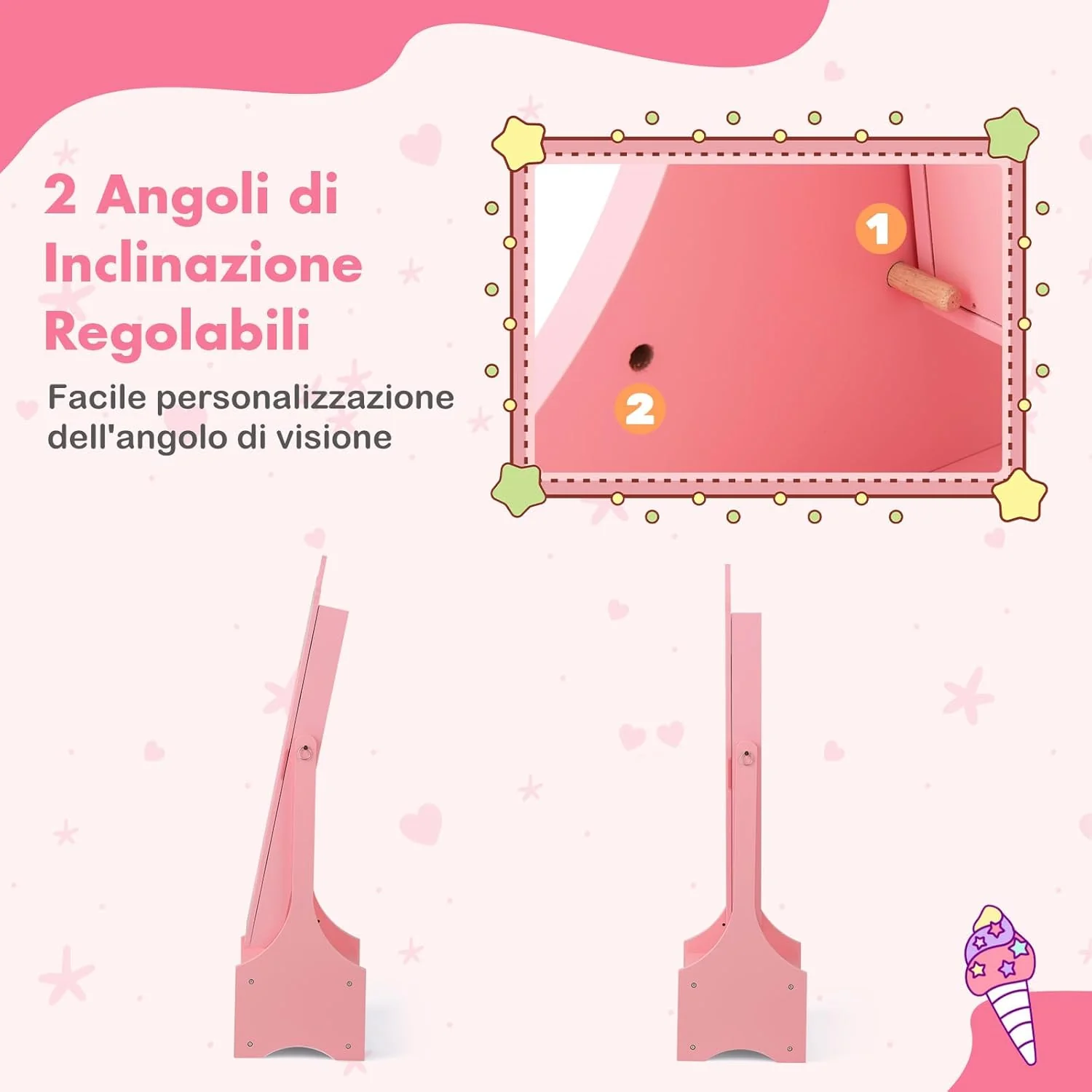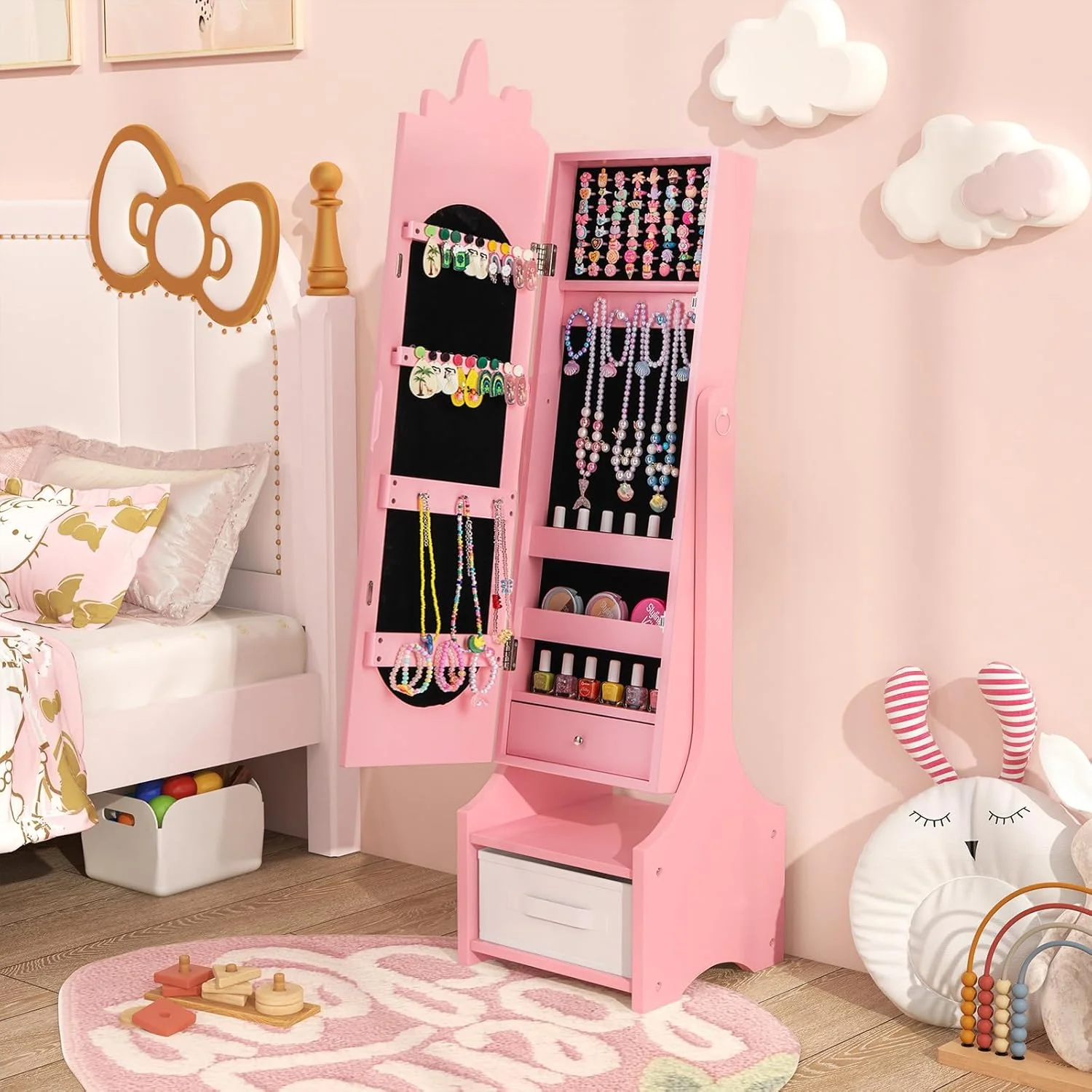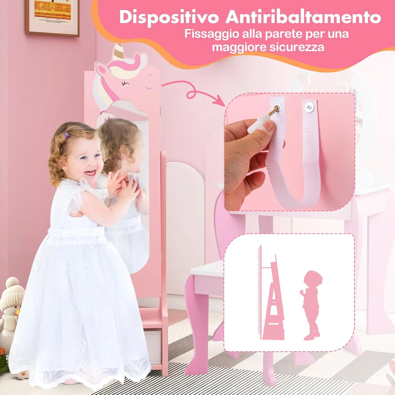 Armadietto Portagioie per Bambini 31,5 x 30 x 115cm, Specchio a Figura Intera a Forma di Unicorno con Ganci, Ripiani e Cassetti, Specchiera da Toeletta per Cameretta, Bianco (Rosa)