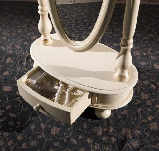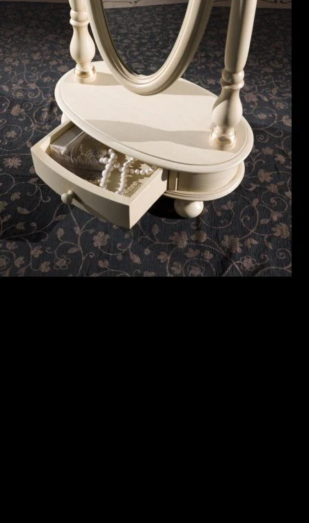 Specchiera girevole ovale laccata avorio con particolari foglia oro misure: l. 62 x h. 169 x p.37