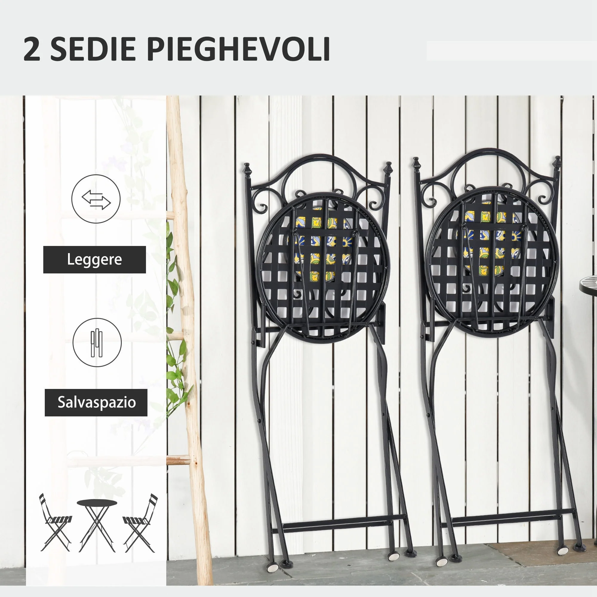 Easycomfort Set Tavolo e Sedie da Balcone 3 Pezzi, Set da Giardino Pieghevoli in Metallo con Maioliche Colorate, Multicolore