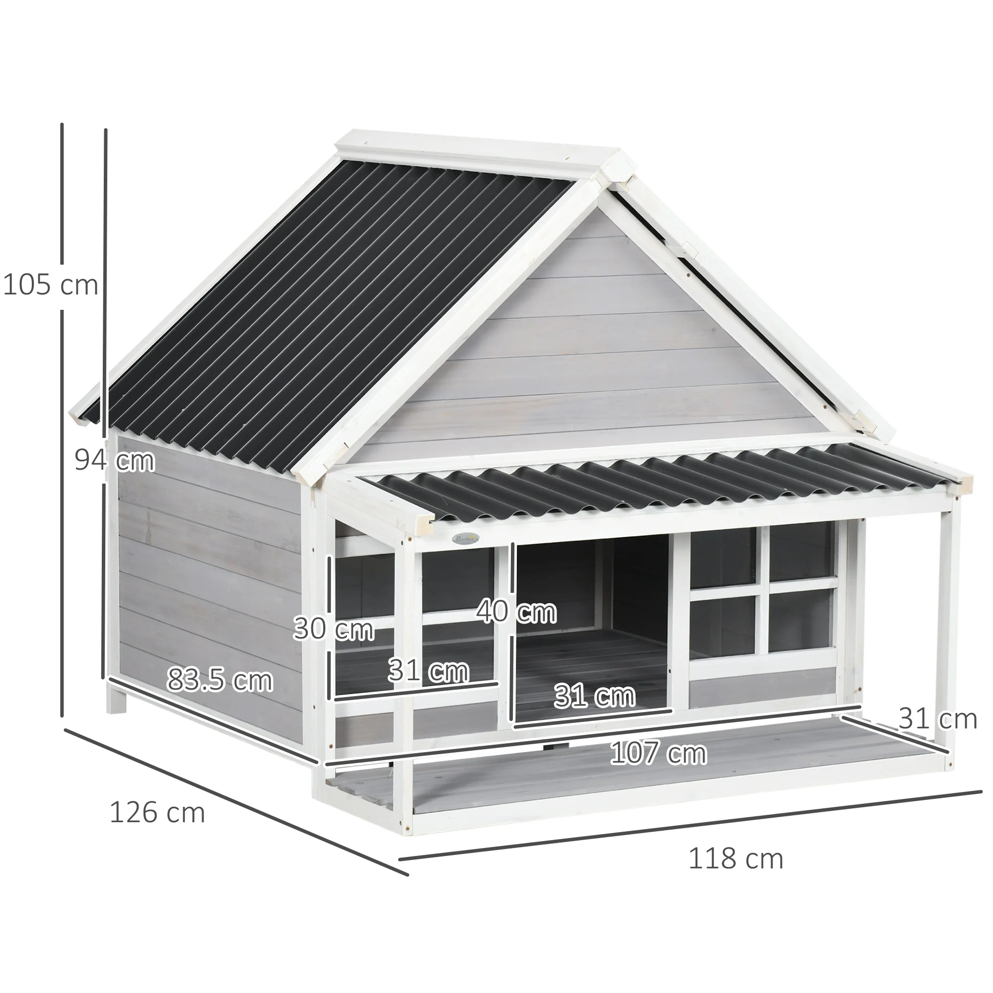 Easycomfort Cuccia per Cani da Esterno in Legno e PVC con Portico e Finestre, 126x118x105cm, Grigio