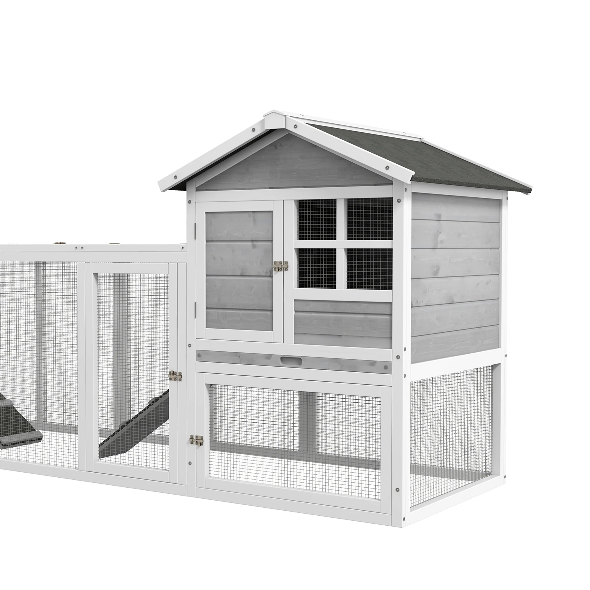 Easycomfort Conigliera in Legno da Esterno con 2 Casette e Area Aperta Recintata con Porte e Rampe, 259x64x92 cm, Grigia