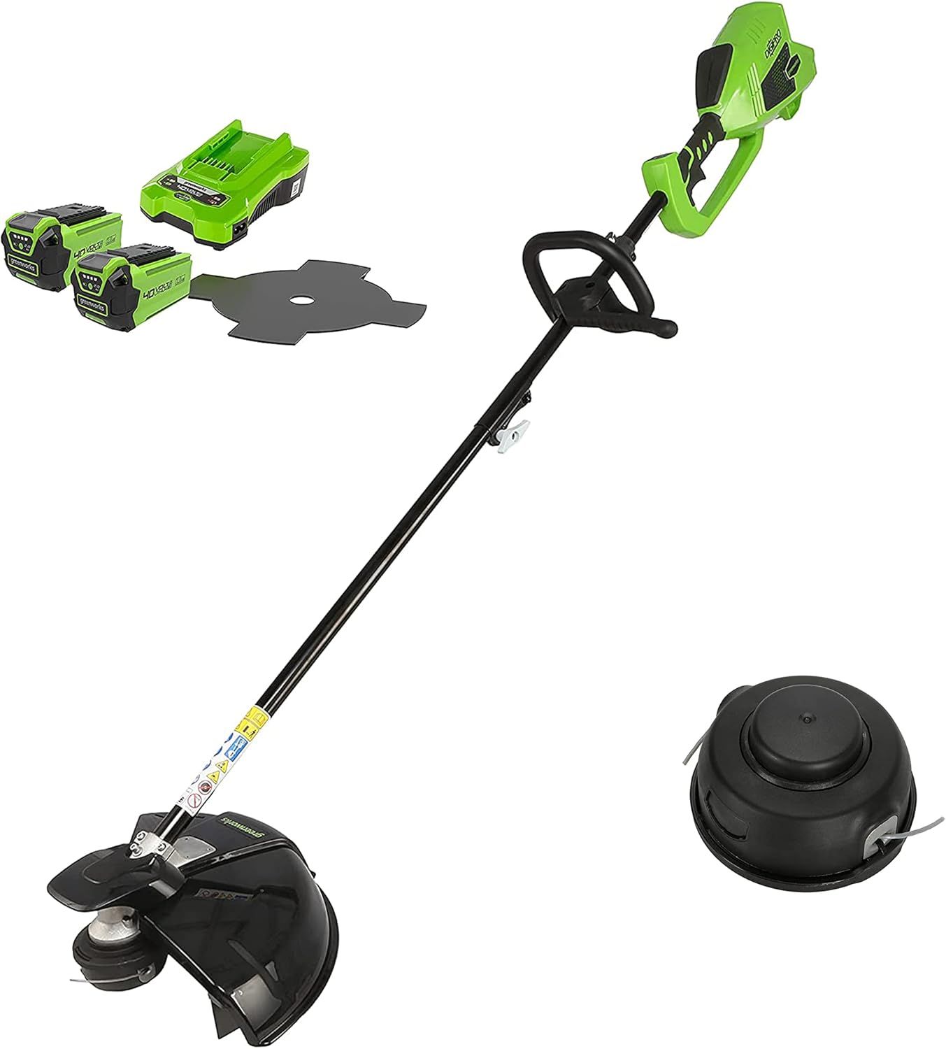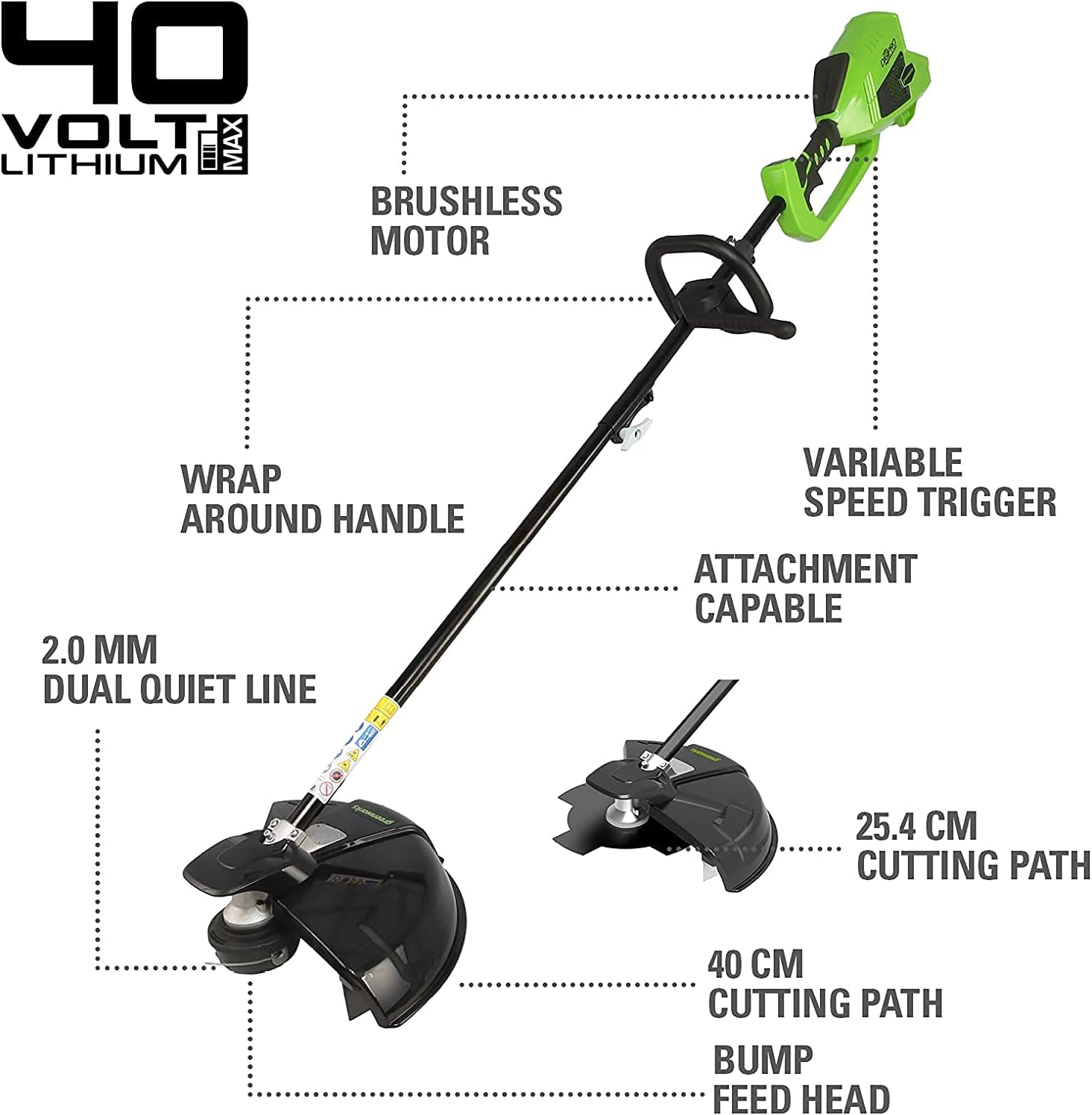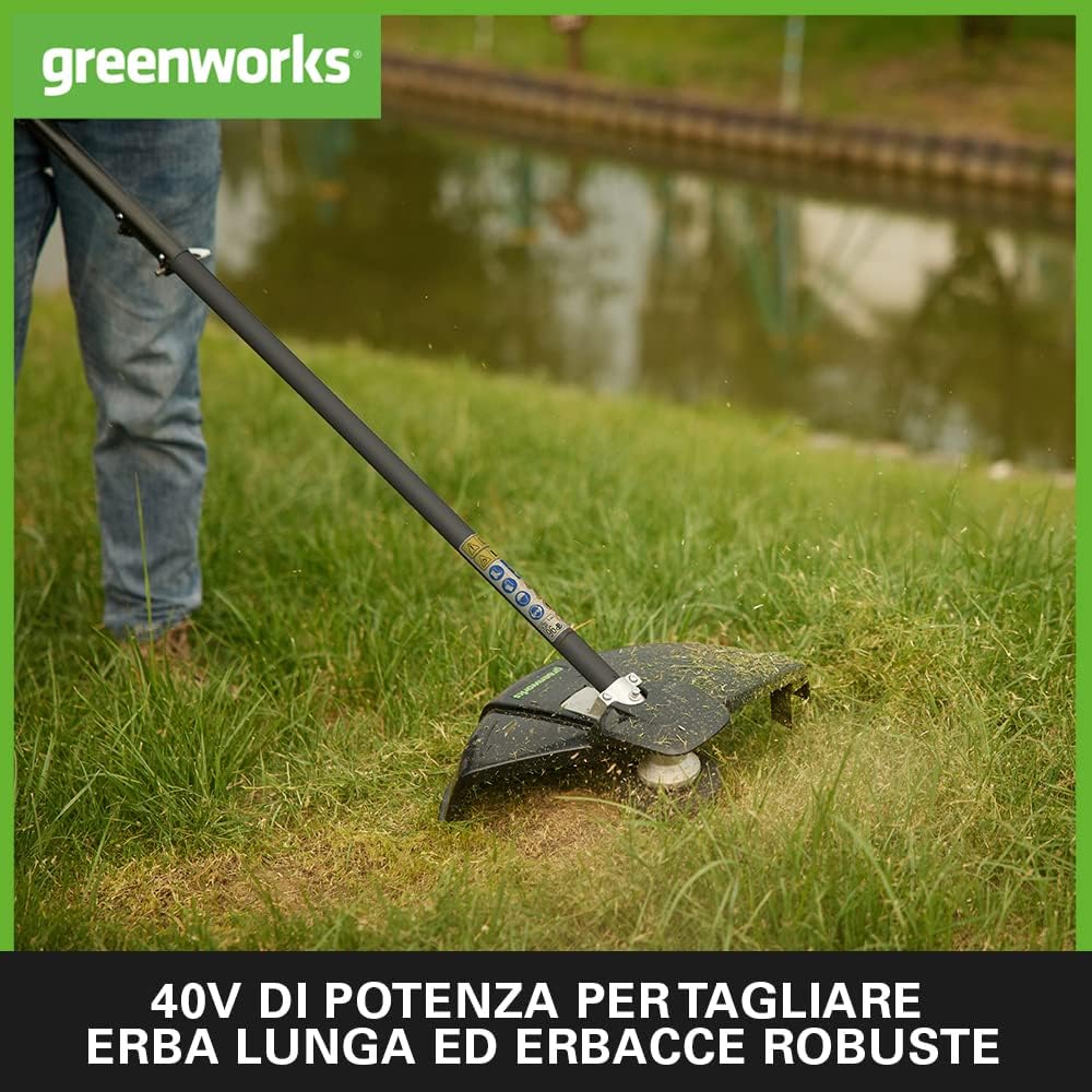 Greenworks 40V Decespugliatore a Batteria con motore Brushless, Imbracatura, Altezza Regolabile, Ampiezza Taglio 40cm, Filo Nylon 2mm, Lama 25cm, 2 Batterie 40V e Caricabatterie GD40BCK2X