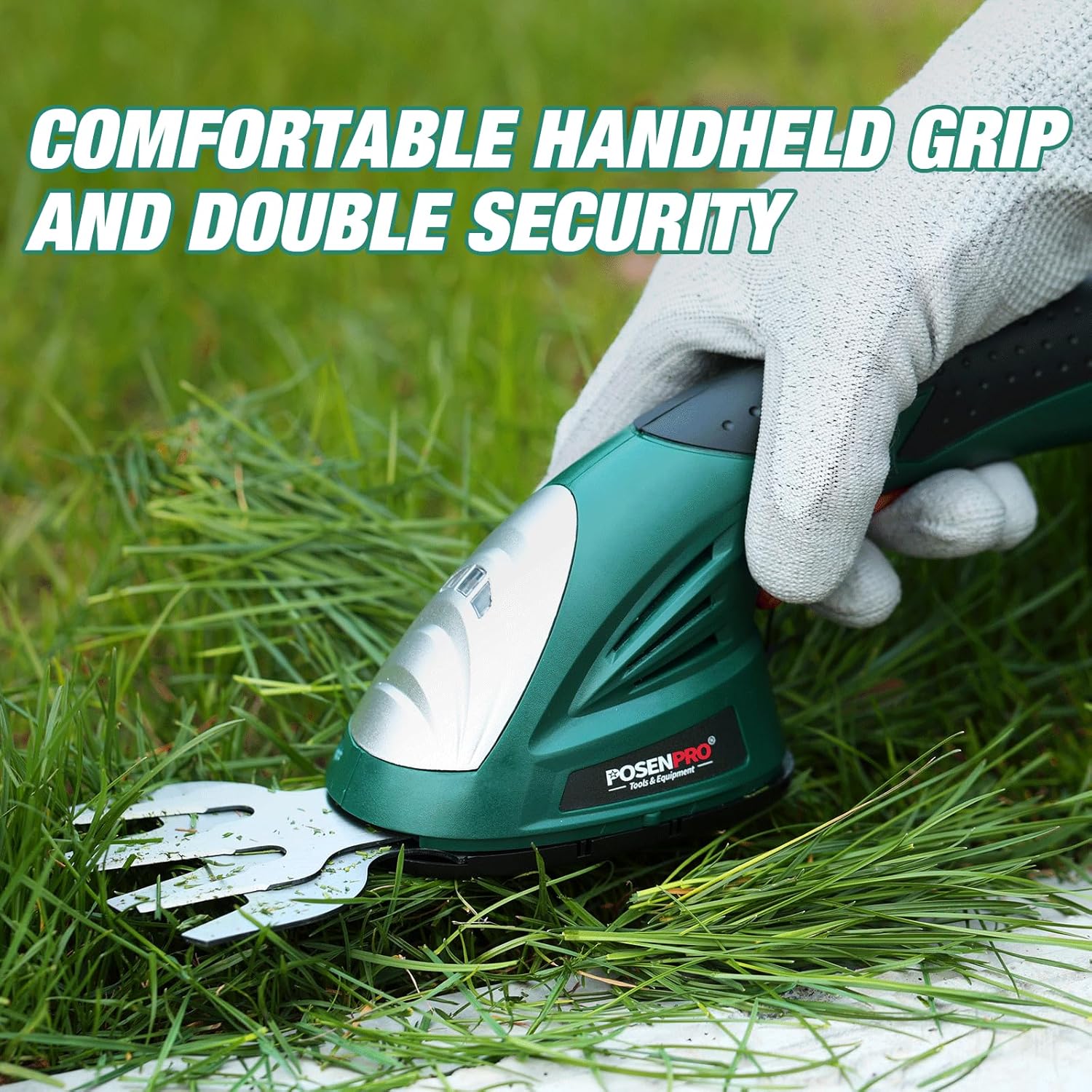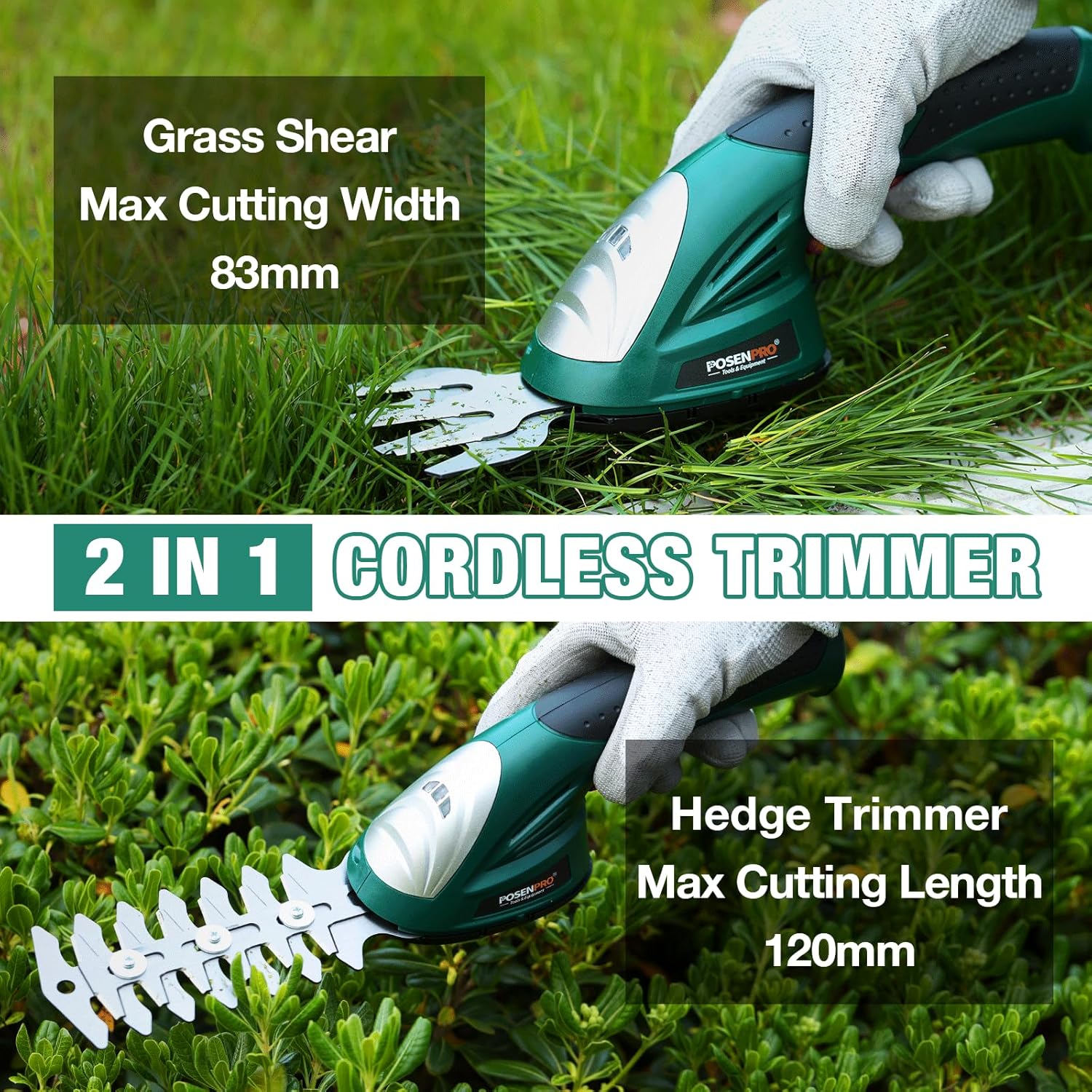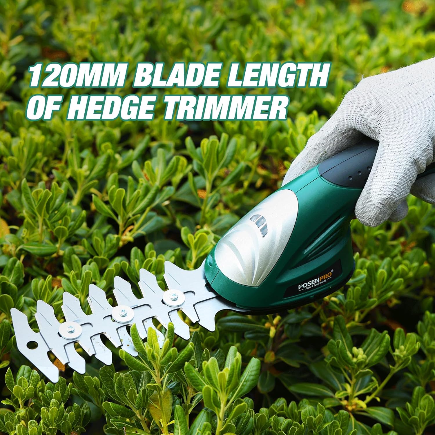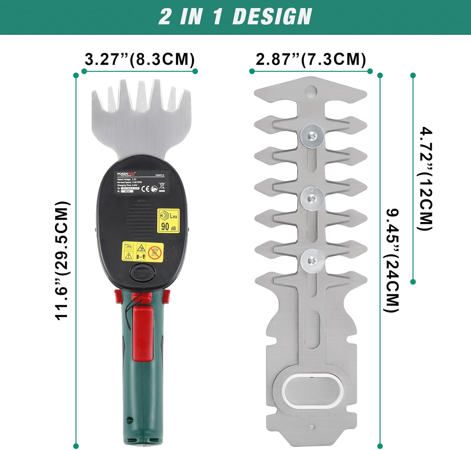 POSENPRO 7.2V Hedge Trimmer, Electric Shears, 2 in 1 Cordless Shears/Hedge Trimmer, Built-in 1.5Ah Battery, 2 Blades, Electric Hedge Trimmer with Safety Key, Grass Trimmer/Shrub
