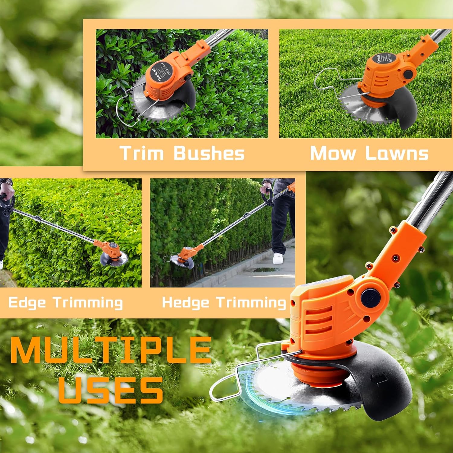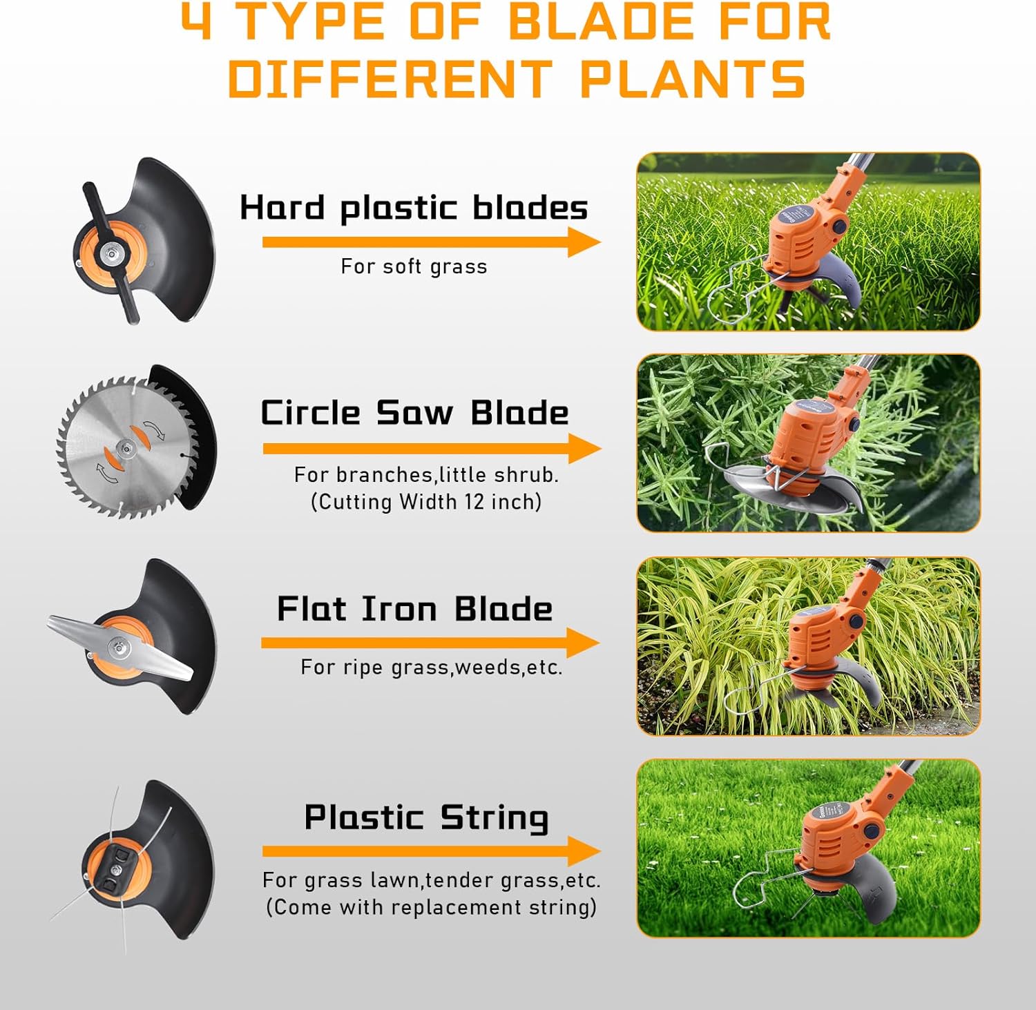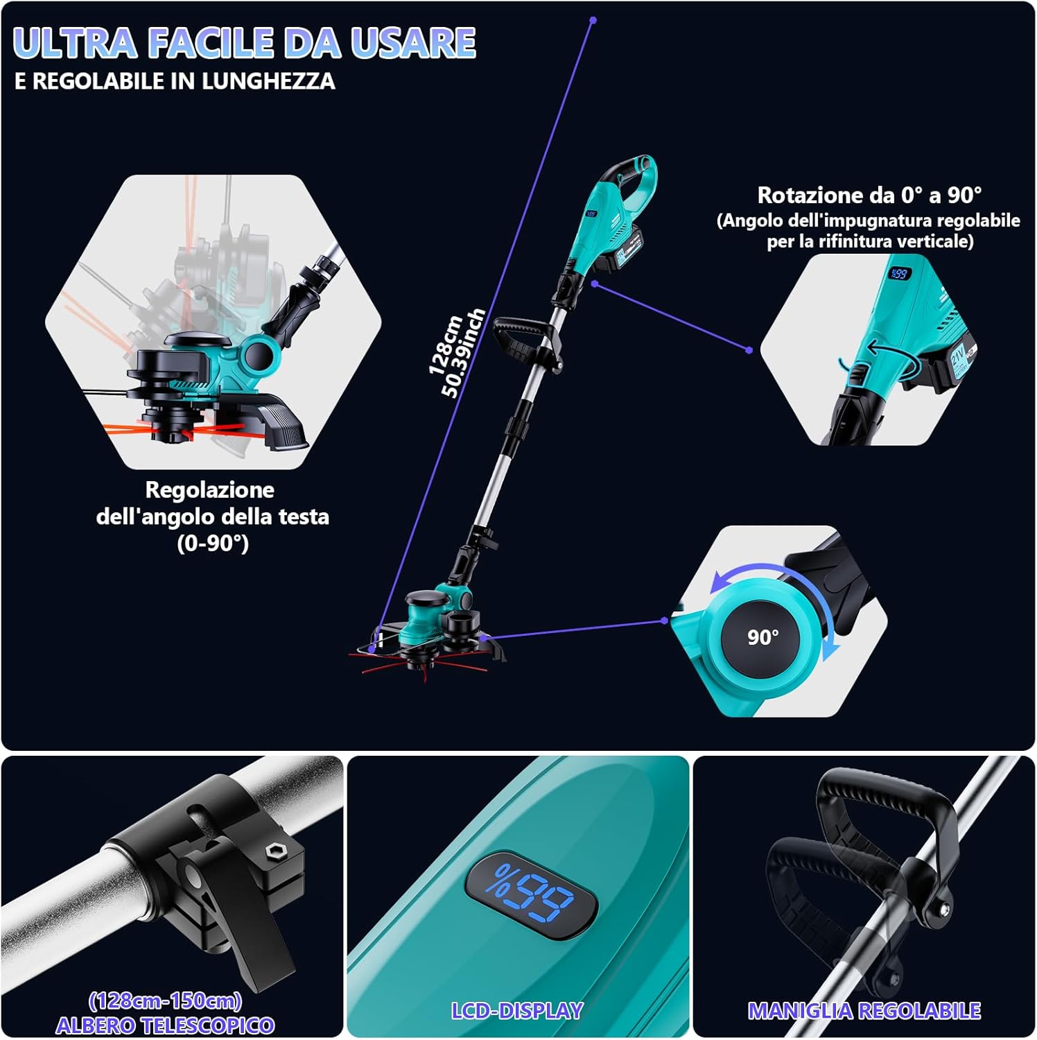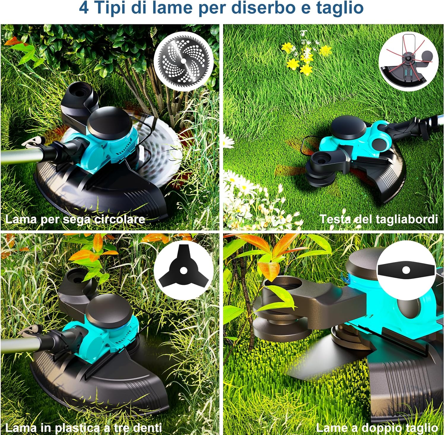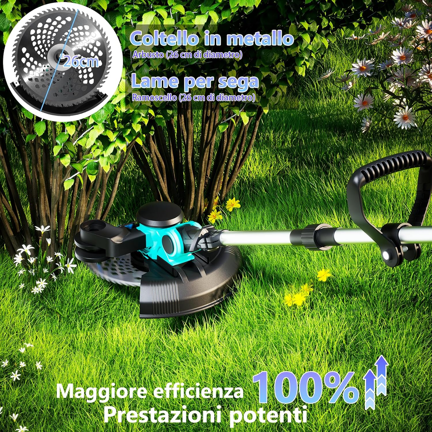 Decespugliatore a batteria,Tagliaerba a Batteria, Decespugliatore Elettrico, Tagliabordi a Batteria con 2 batterie, 4 Tipi Lame,Testata Regolabile e Maniglia Telescopica Tagliaerba per Giardino