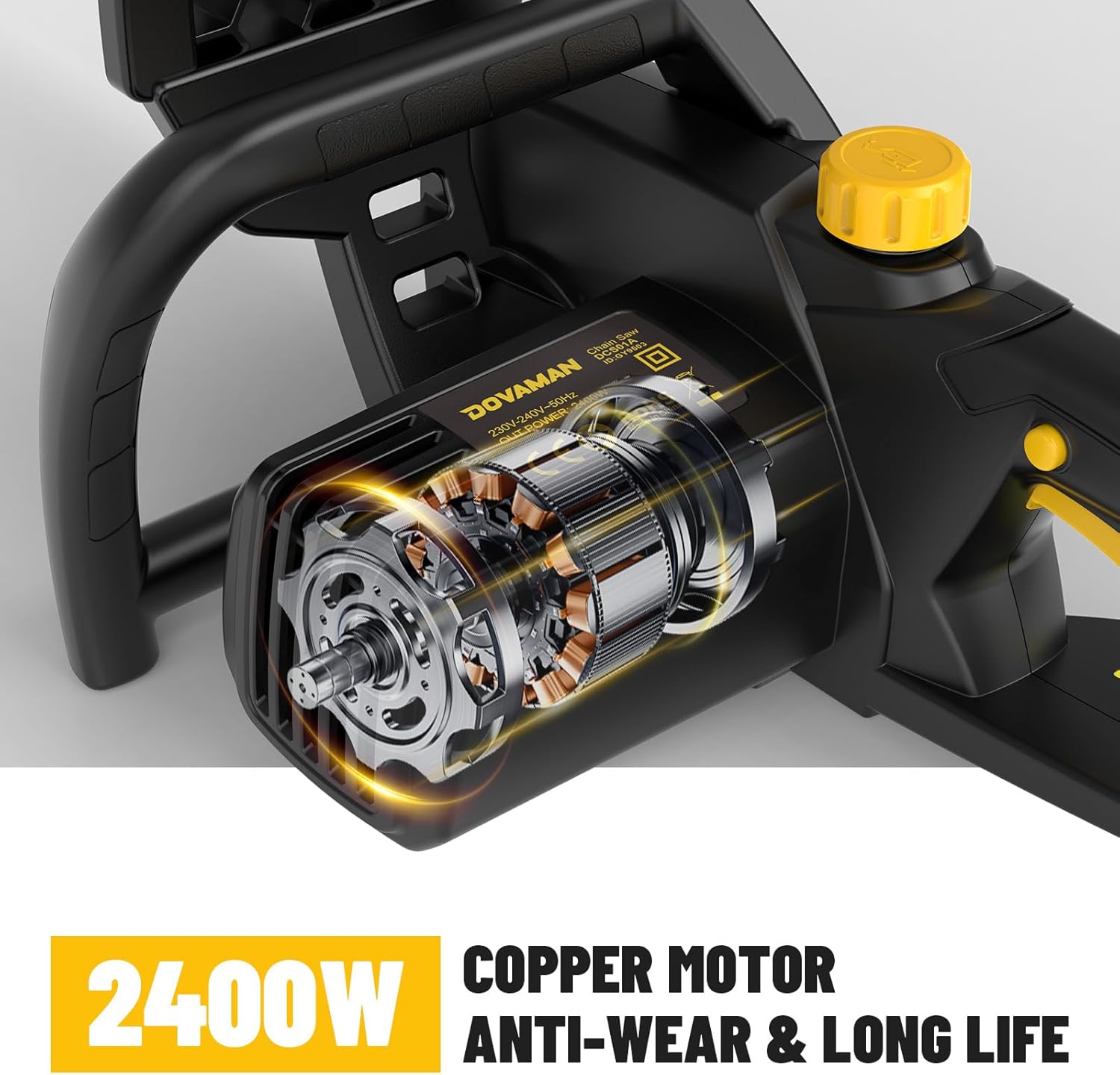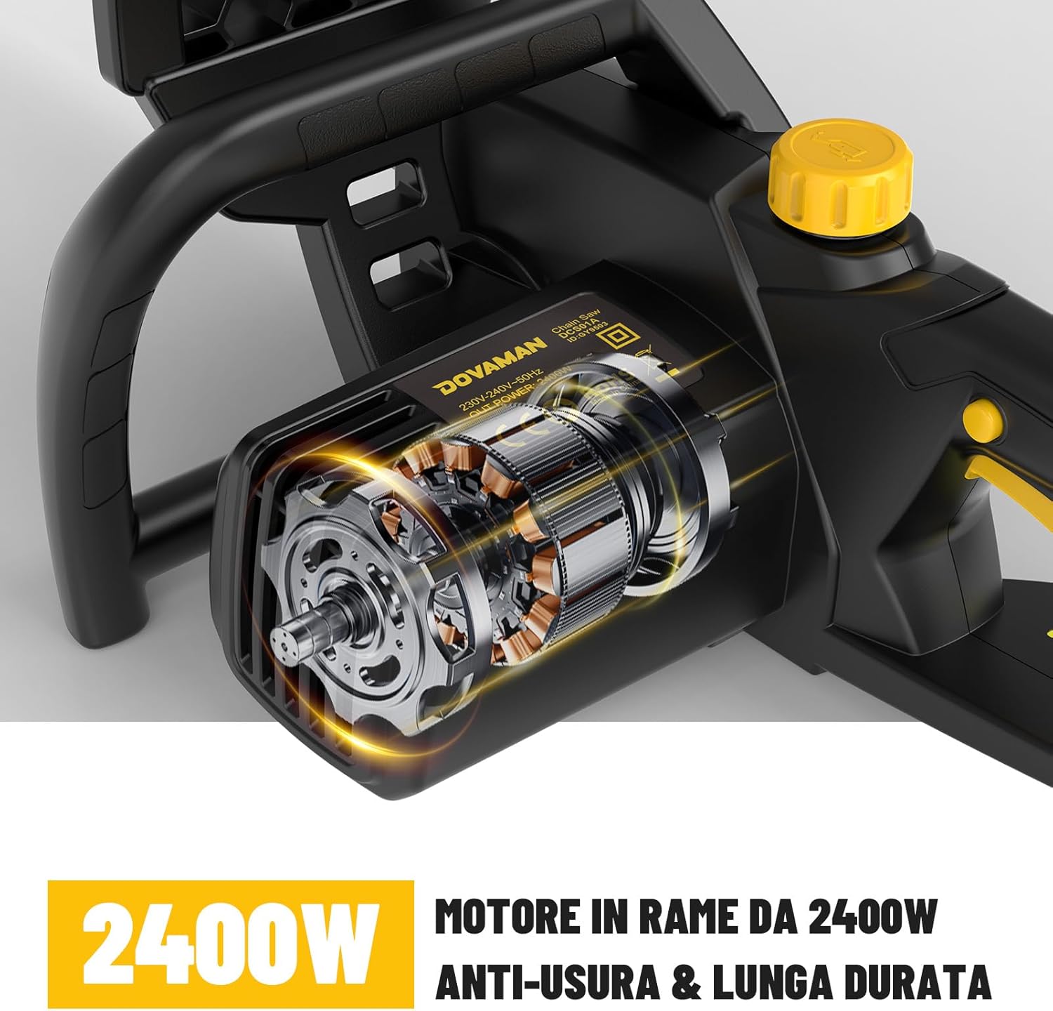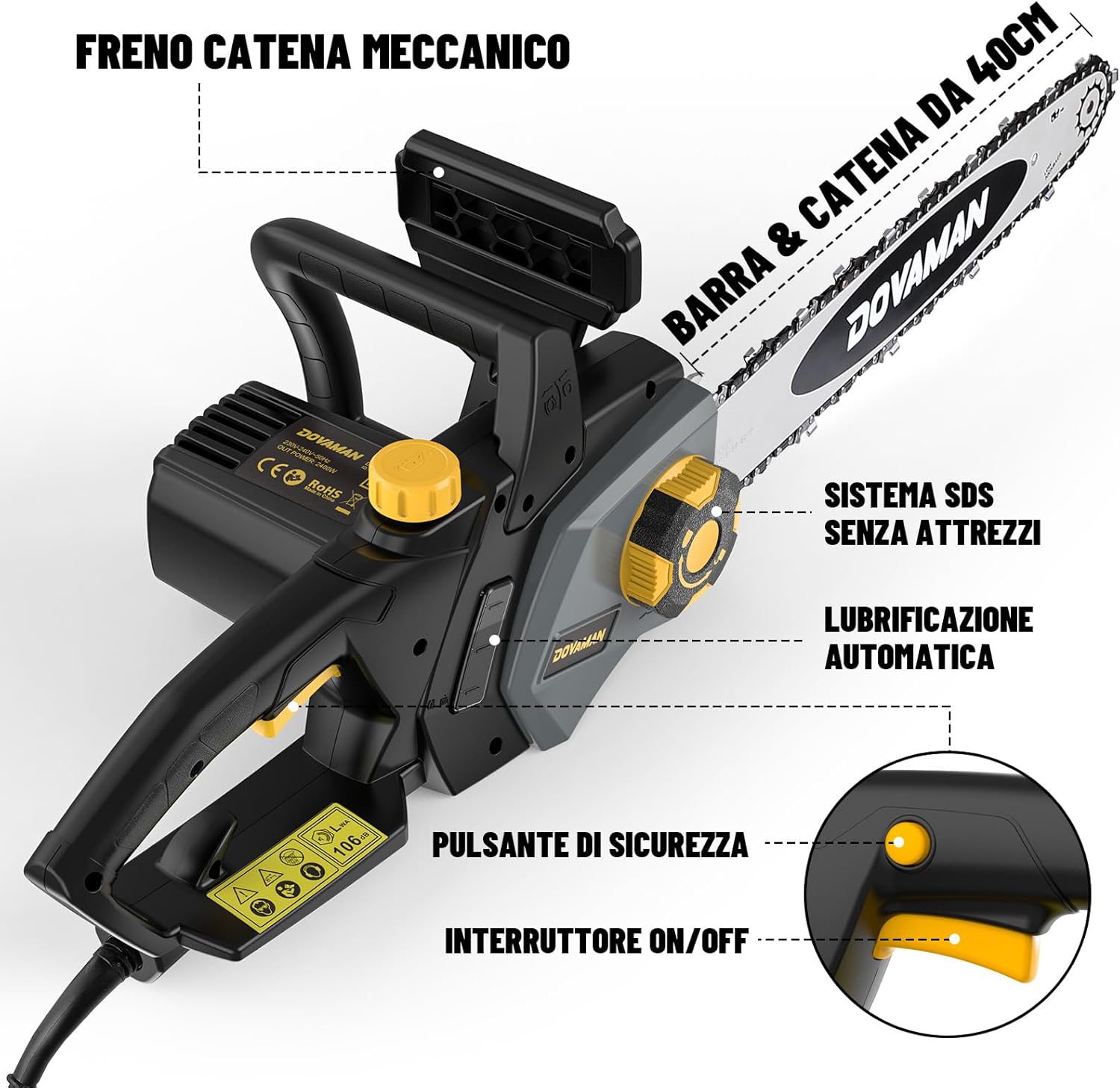 DOVAMAN 2400W Motosega Elettrica, 40cm Barra e Catena Oregon, Tensionamento Senza Attrezzi, Freno Sicurezza, 1 Catena Oregon e 1 Extra, Ideale per Legna da Ardere, Potatura e Uso in Giardino - DCS01A