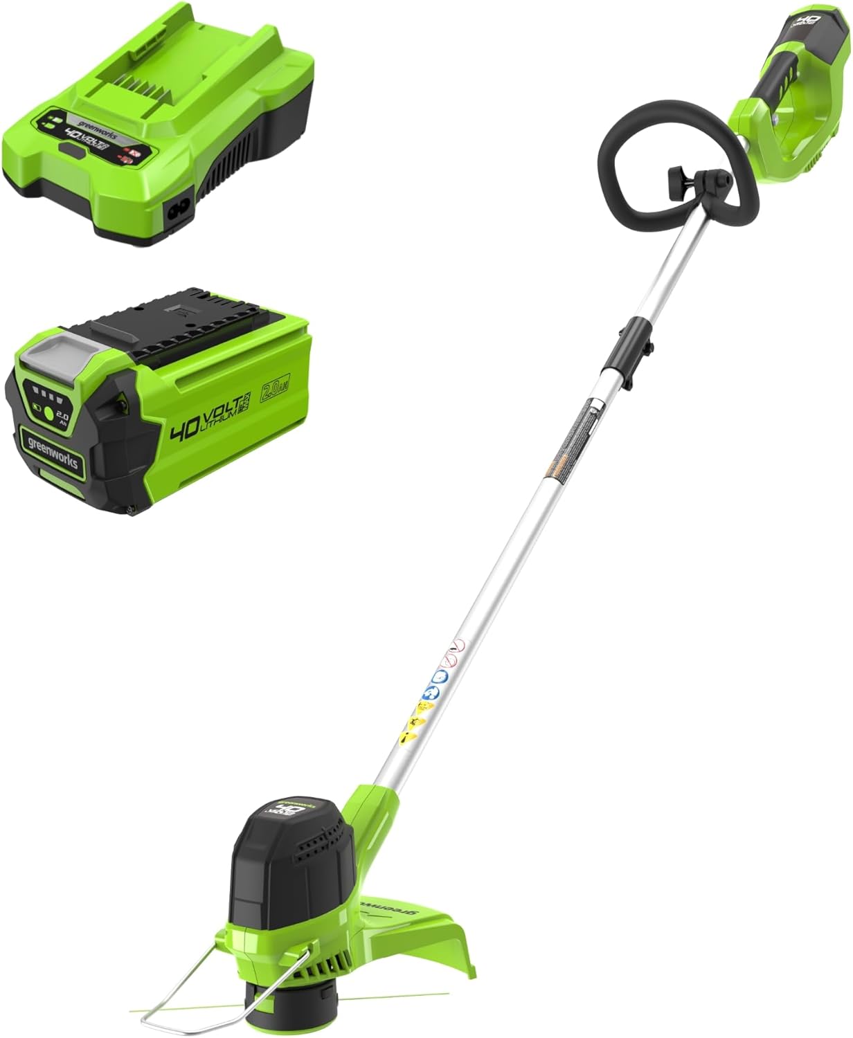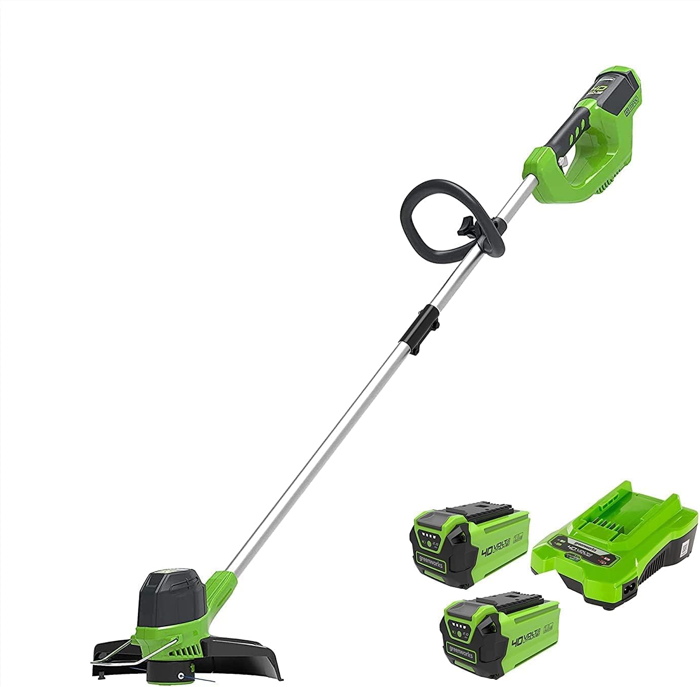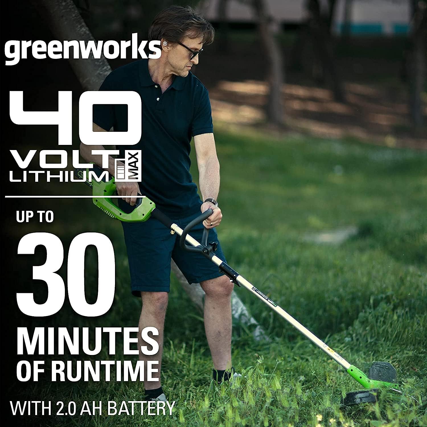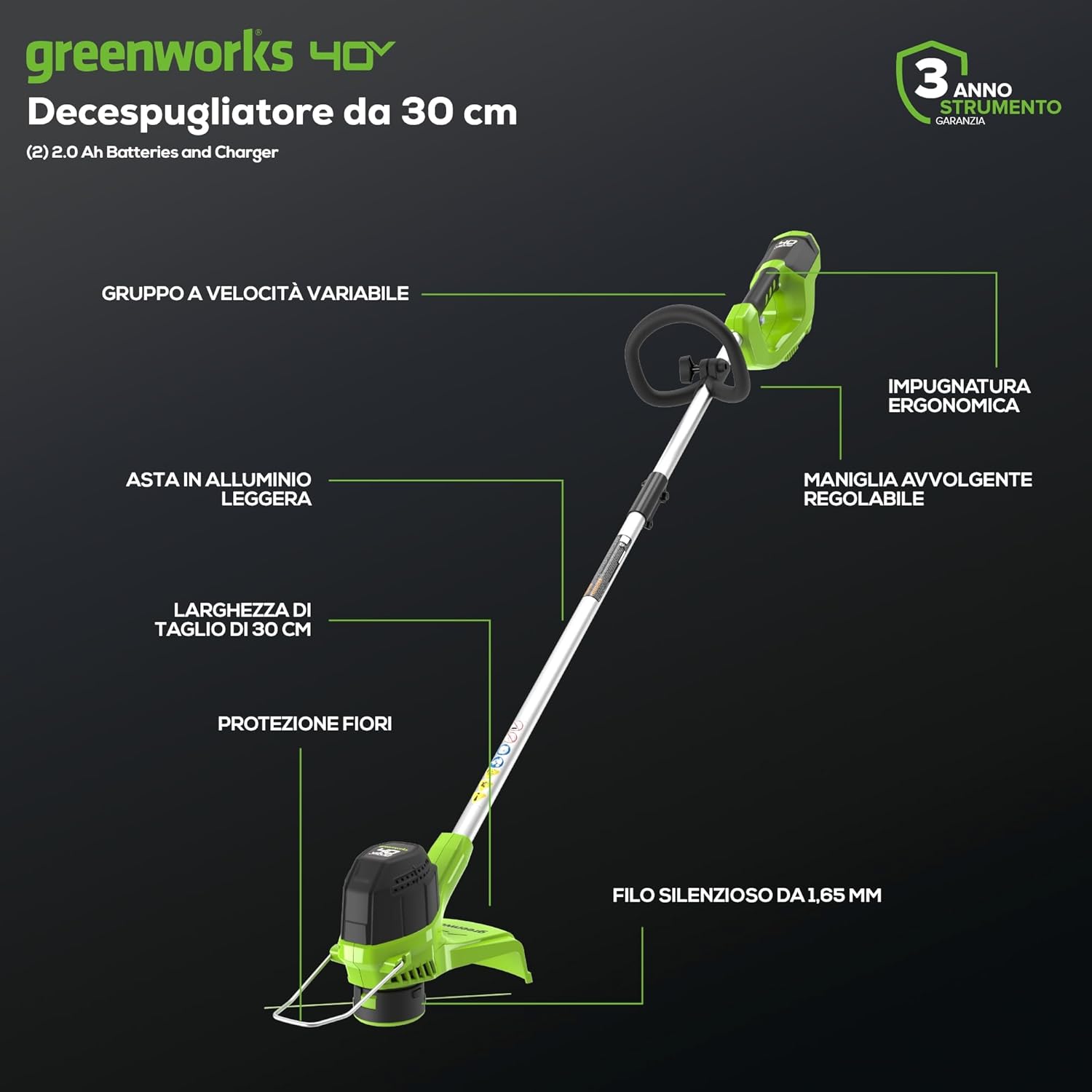 Greenworks 40V Battery Trimmer for Medium Gardens, Adjustable Height, 30 cm Cutting Width, 1.65 mm Nylon Wire with Autofeed, 2 x 40V 2Ah Batteries and G40LTK2X Charger