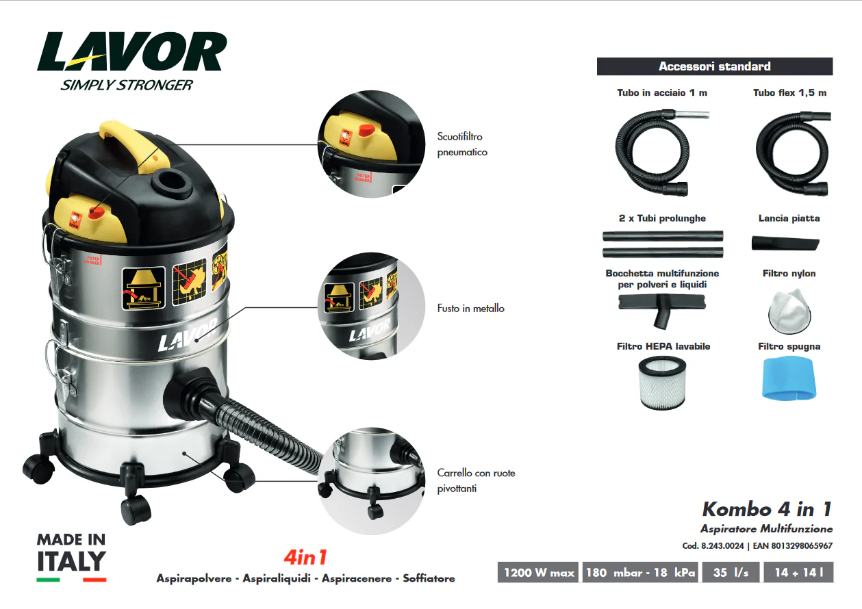 Aspirapolvere - Aspiracenere - Aspiraliquidi LAVOR Ashley Kombo 1200W (4 in 1)