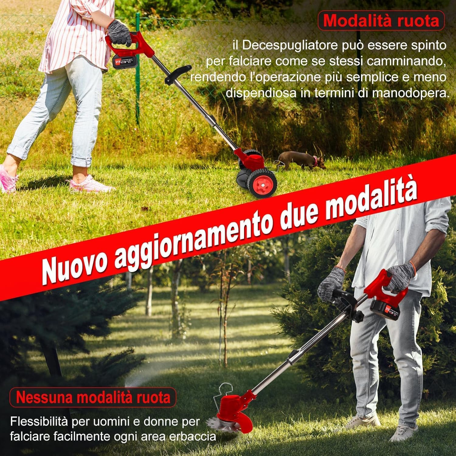 Decespugliatore a Batteria 21V Tagliabordi a Batteria, Tagliabordi Elettrico con 2 4.0Ah Batterie e 4 Tipi di Lame, Ruote Rimovibili, Decespugliatori da Giardino Altezza Regolabile per Prati, Arbusti