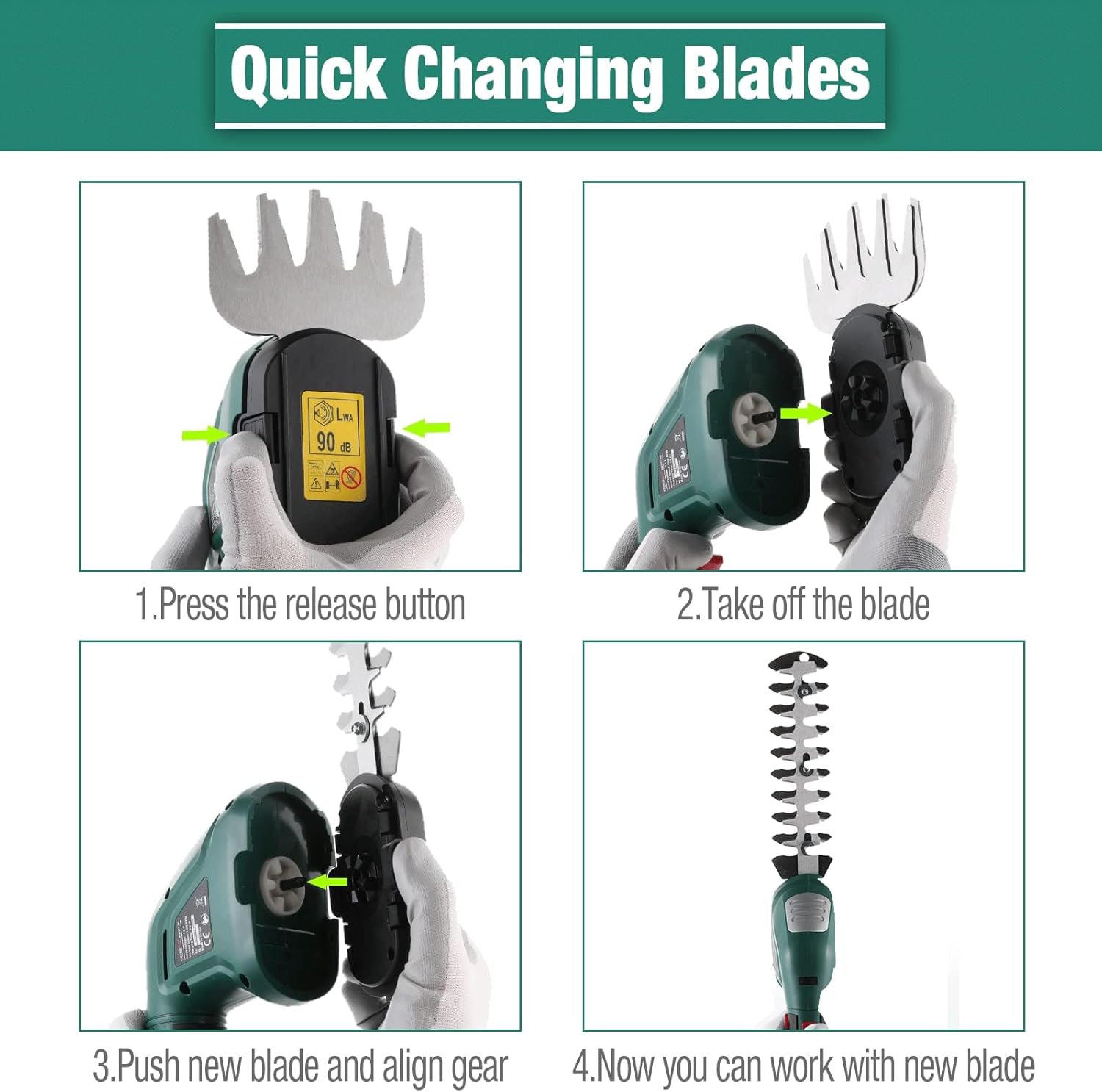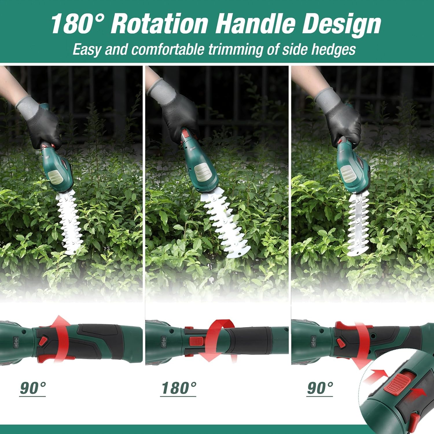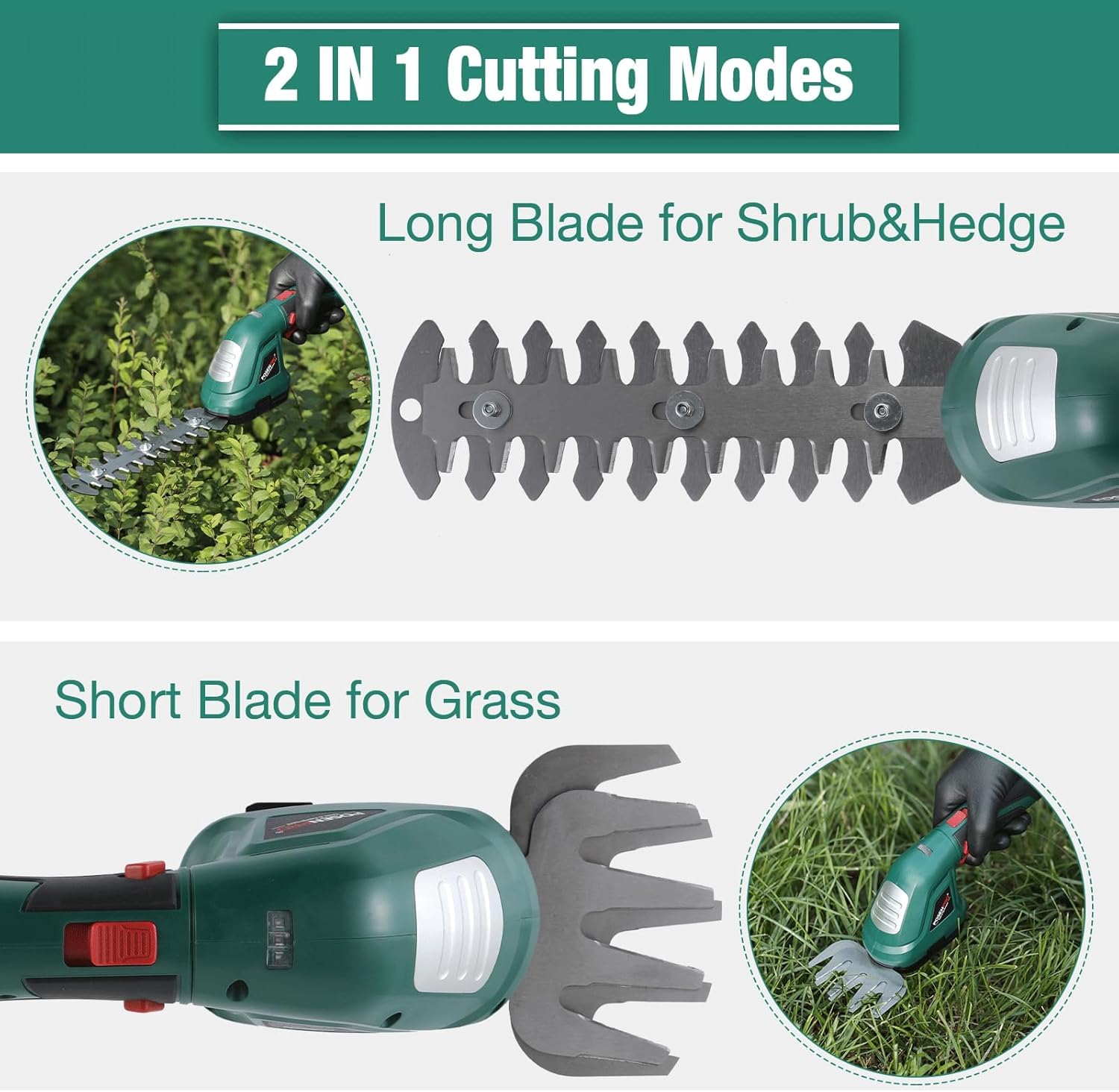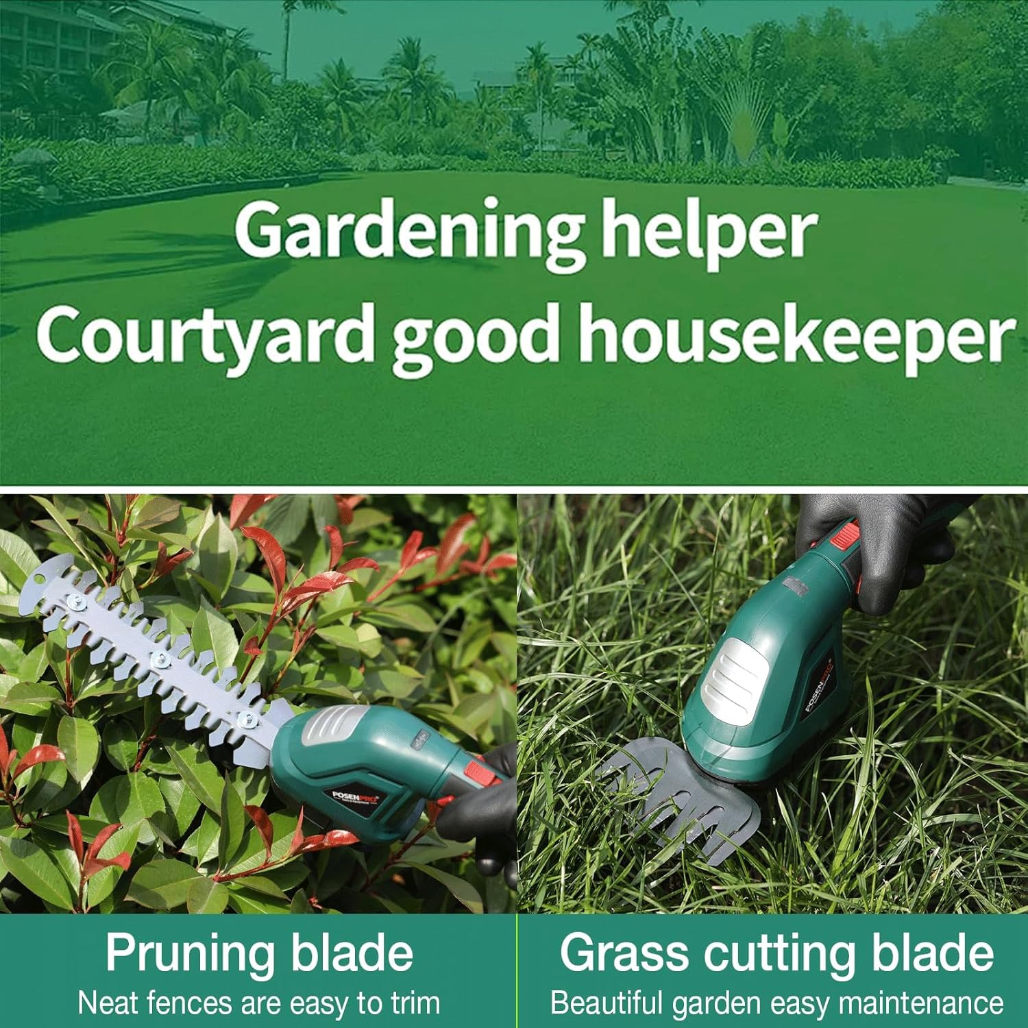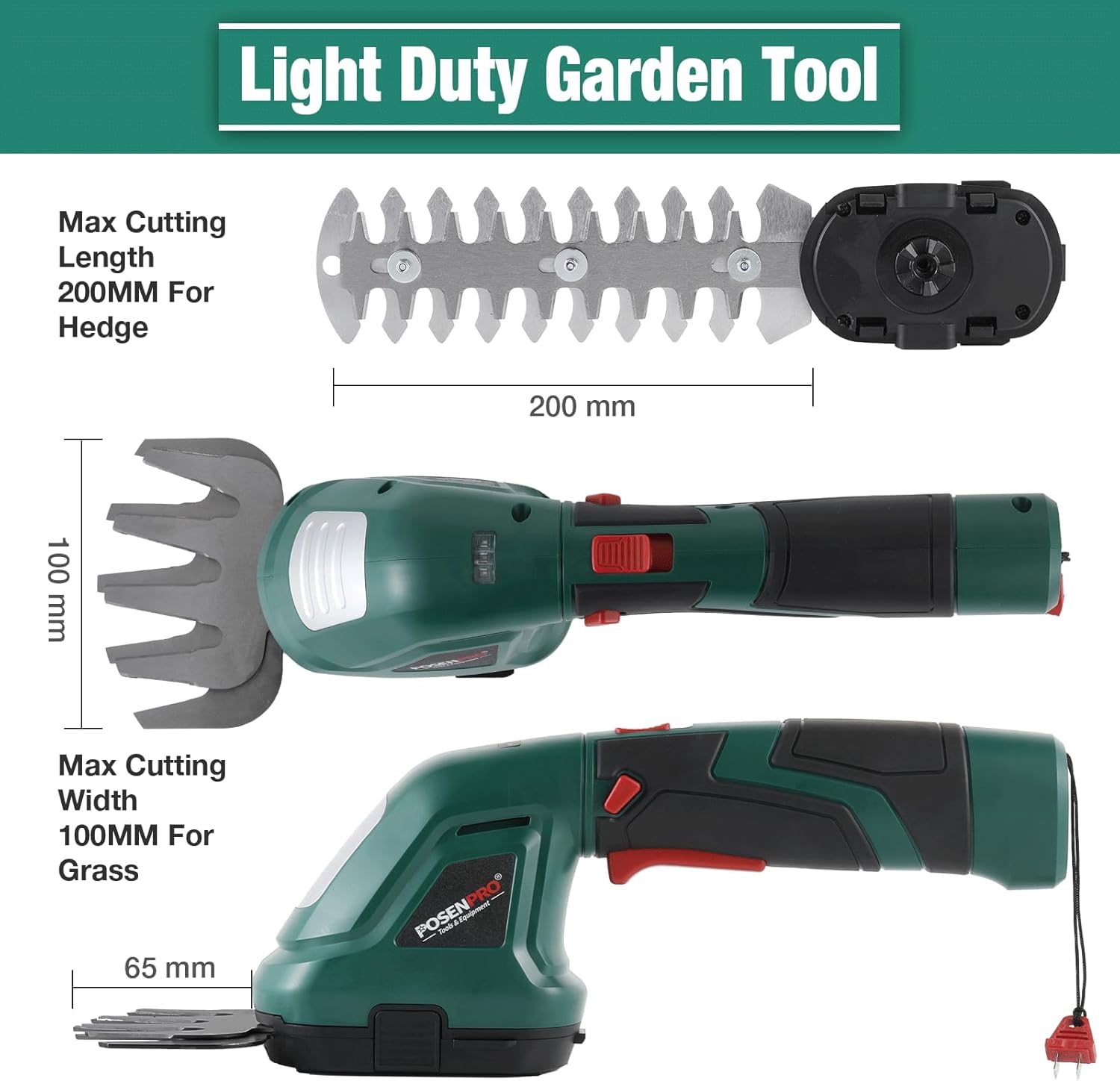 POSENPRO Forbici a Batteria 7,2V, 2 in 1 Tosaerba e Tagliasiepi a Batteria, Tagliasiepi Elettrico con Maniglia Rotante a 180°, Larghezza di Taglio 100mm, Lunghezza di Taglio 200mm