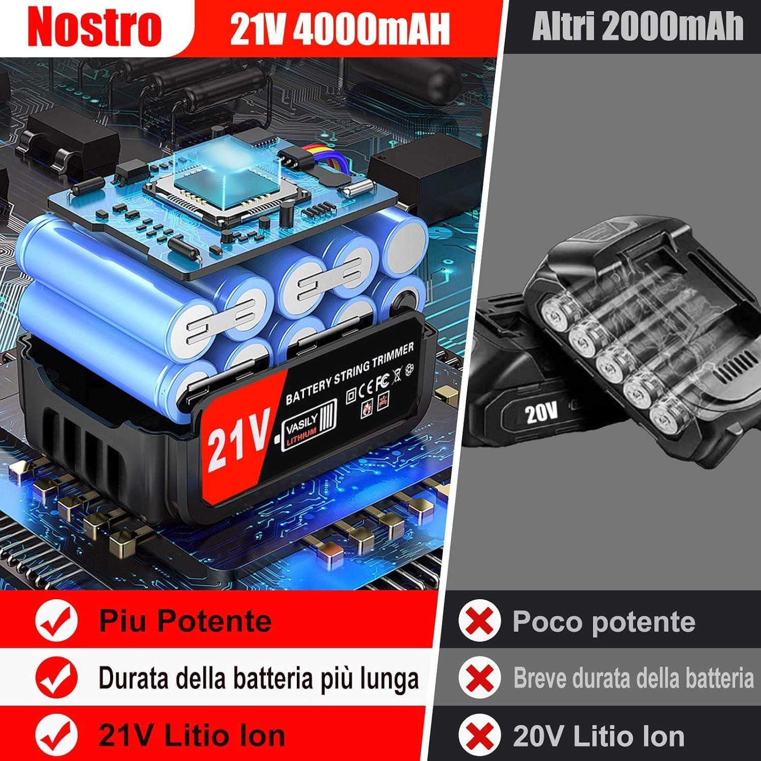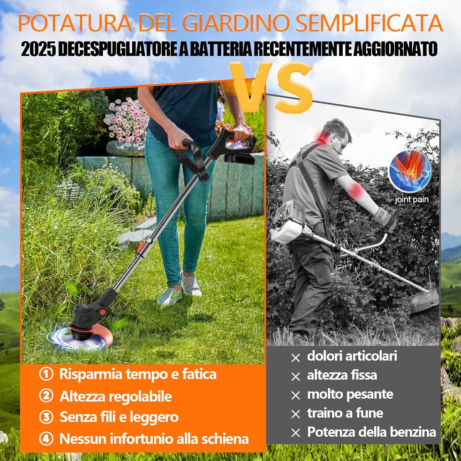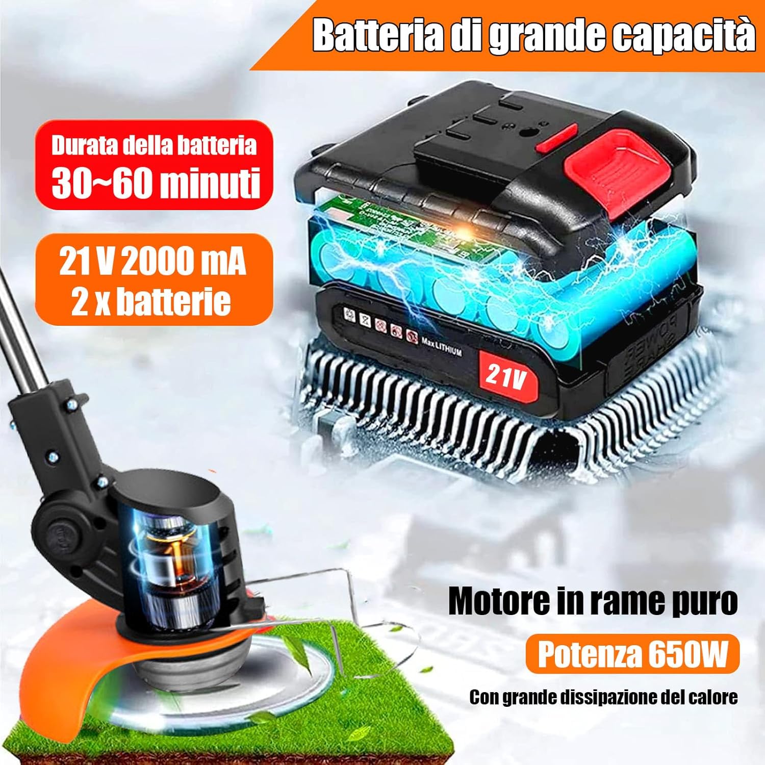 Decespugliatore a Batteria, Decespugliatore Elettrico Con Lama in Metallo, Tagliabordi a batteria Con 2 Batterie da 21V 2000 mAh, Maniglia a scomparsa e rotazione della testa di 90°