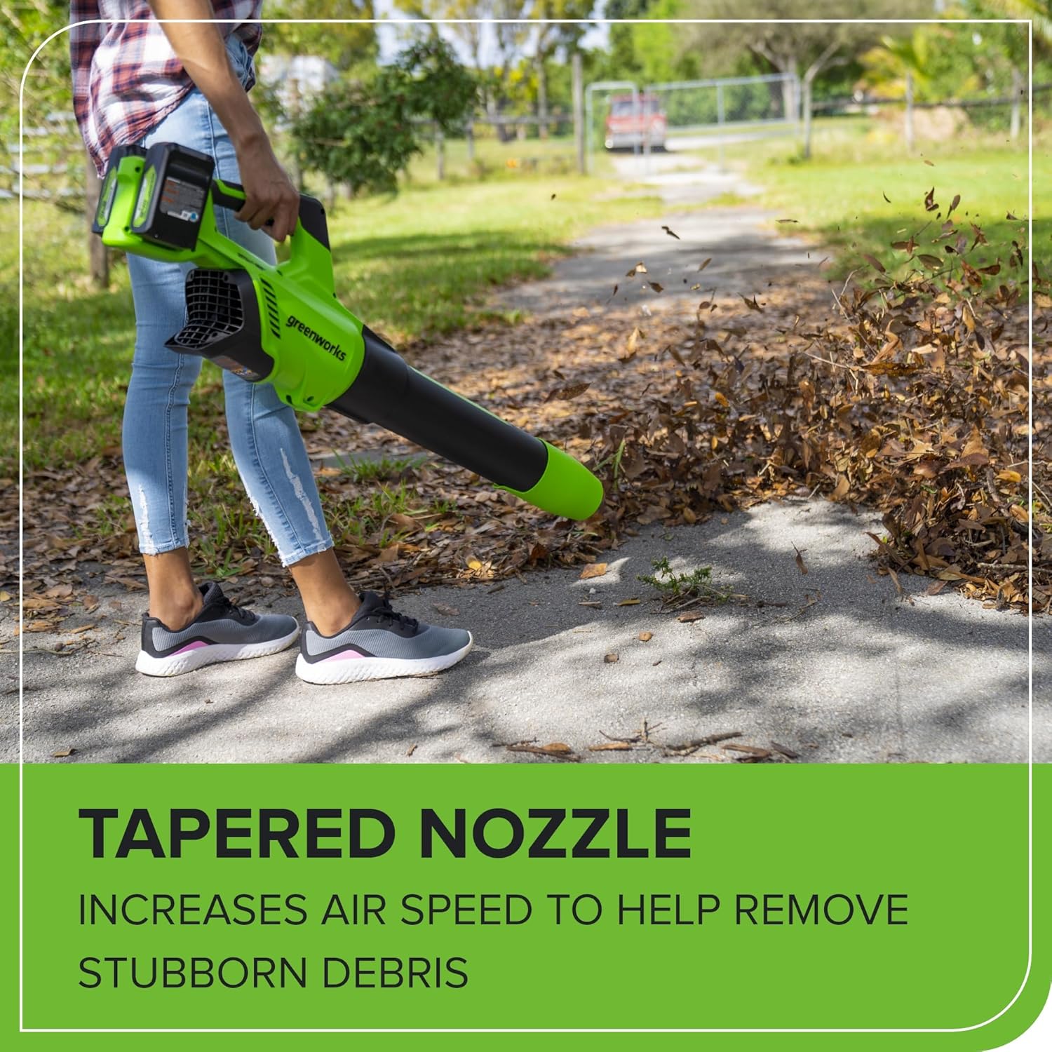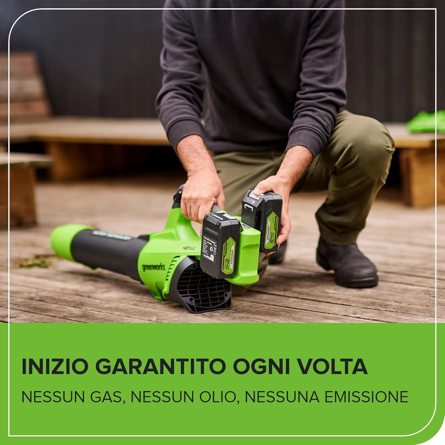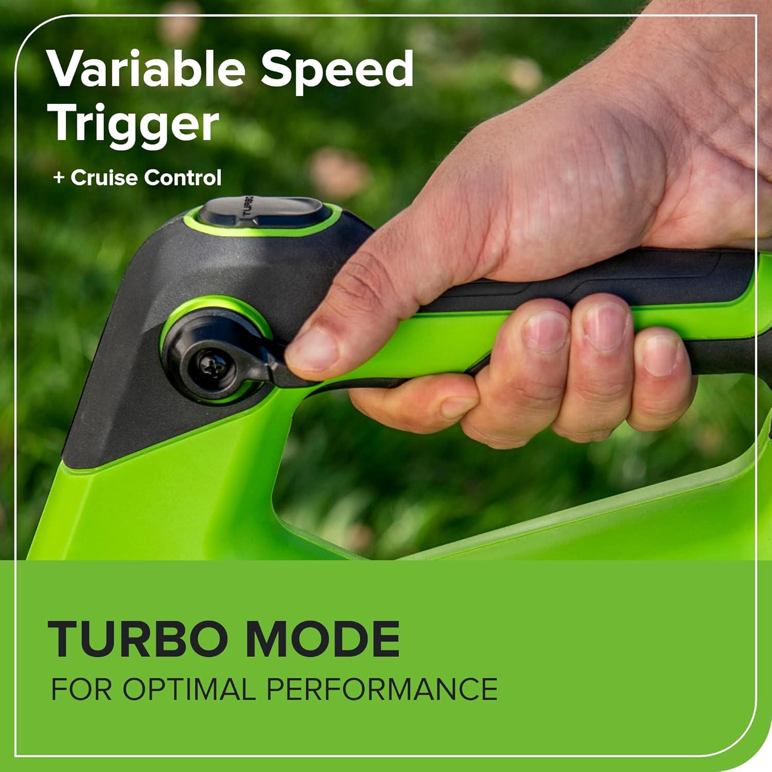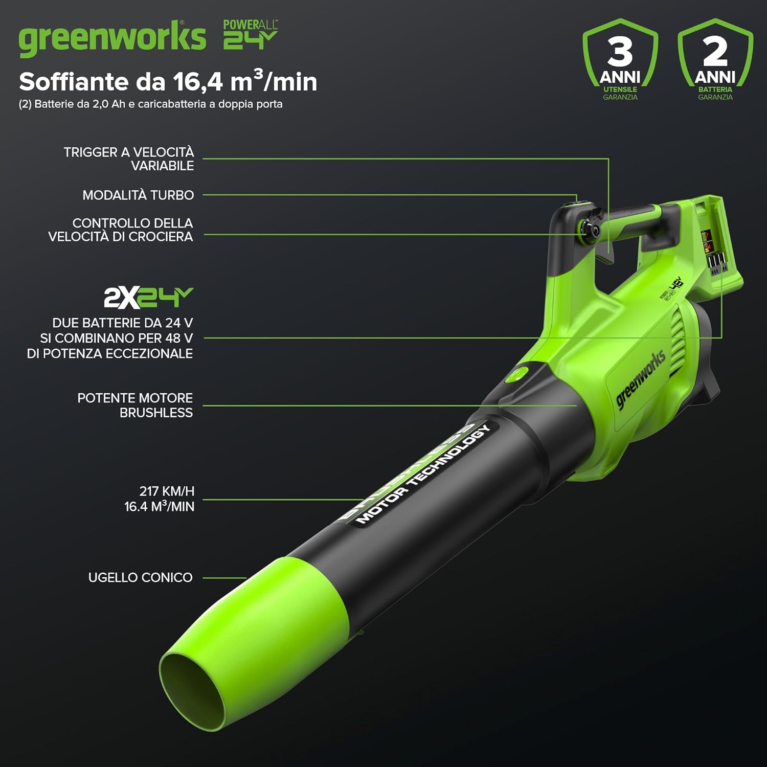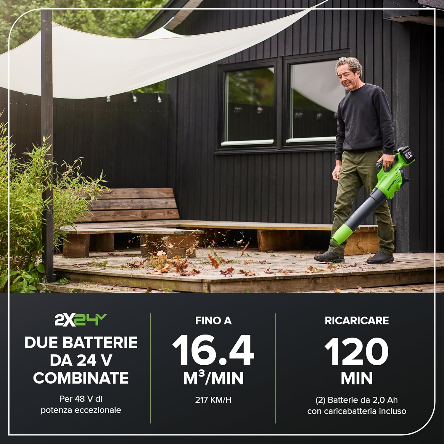 Greenworks 48V(2x24V) Battery Axial Leaf Blower with Brushless Motor, Turbo Function, 217 km/h, 16.4m³/min, with 2 24V 2Ah Batteries and Charger, 3 Year Warranty GD24X2ABK2X