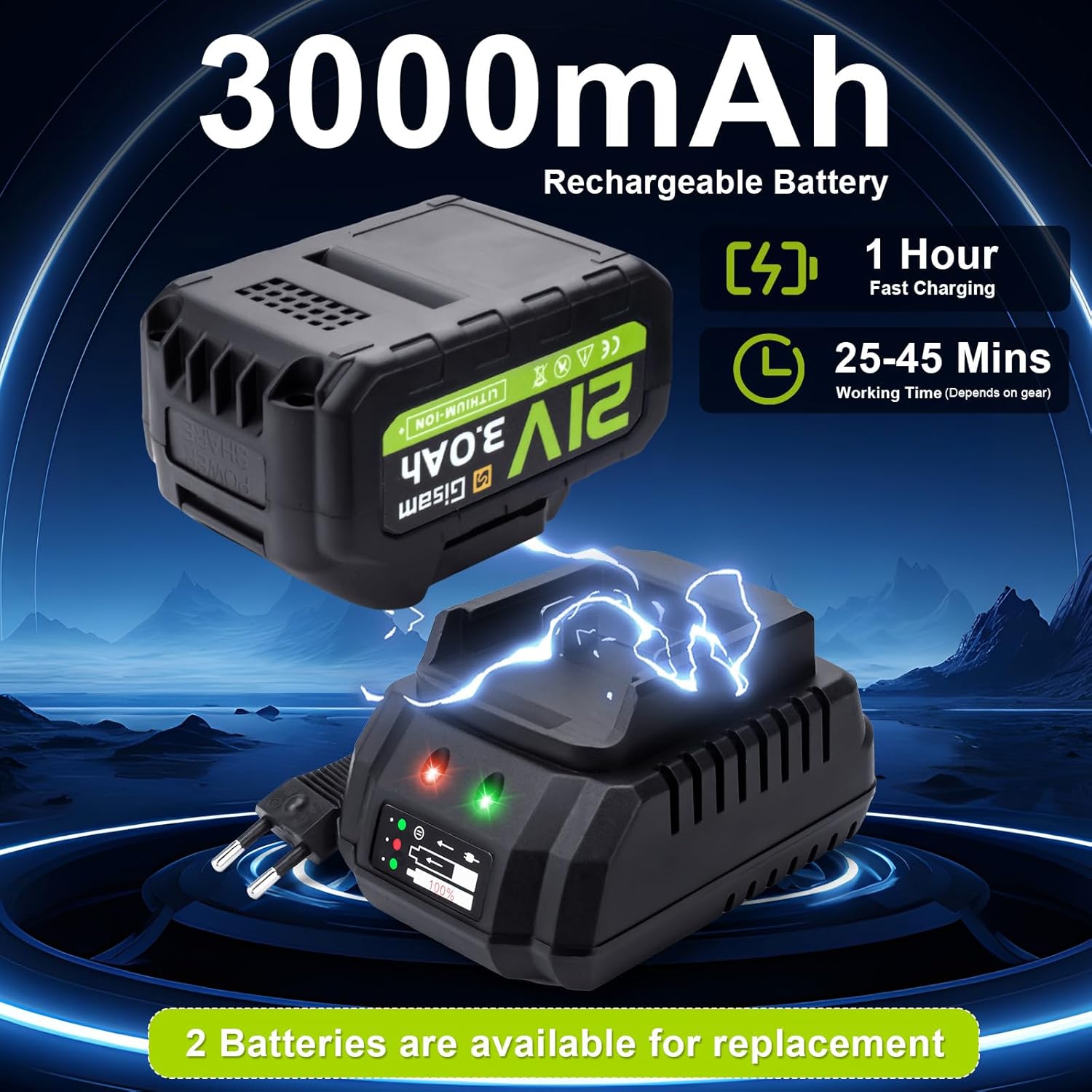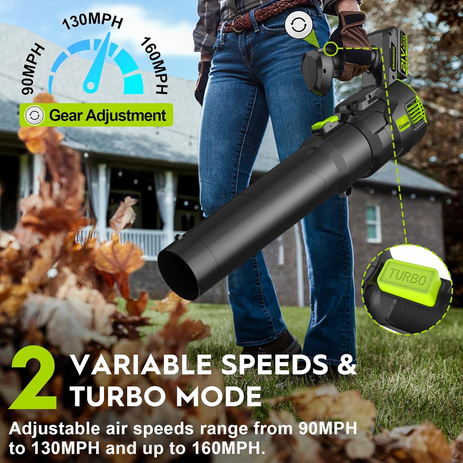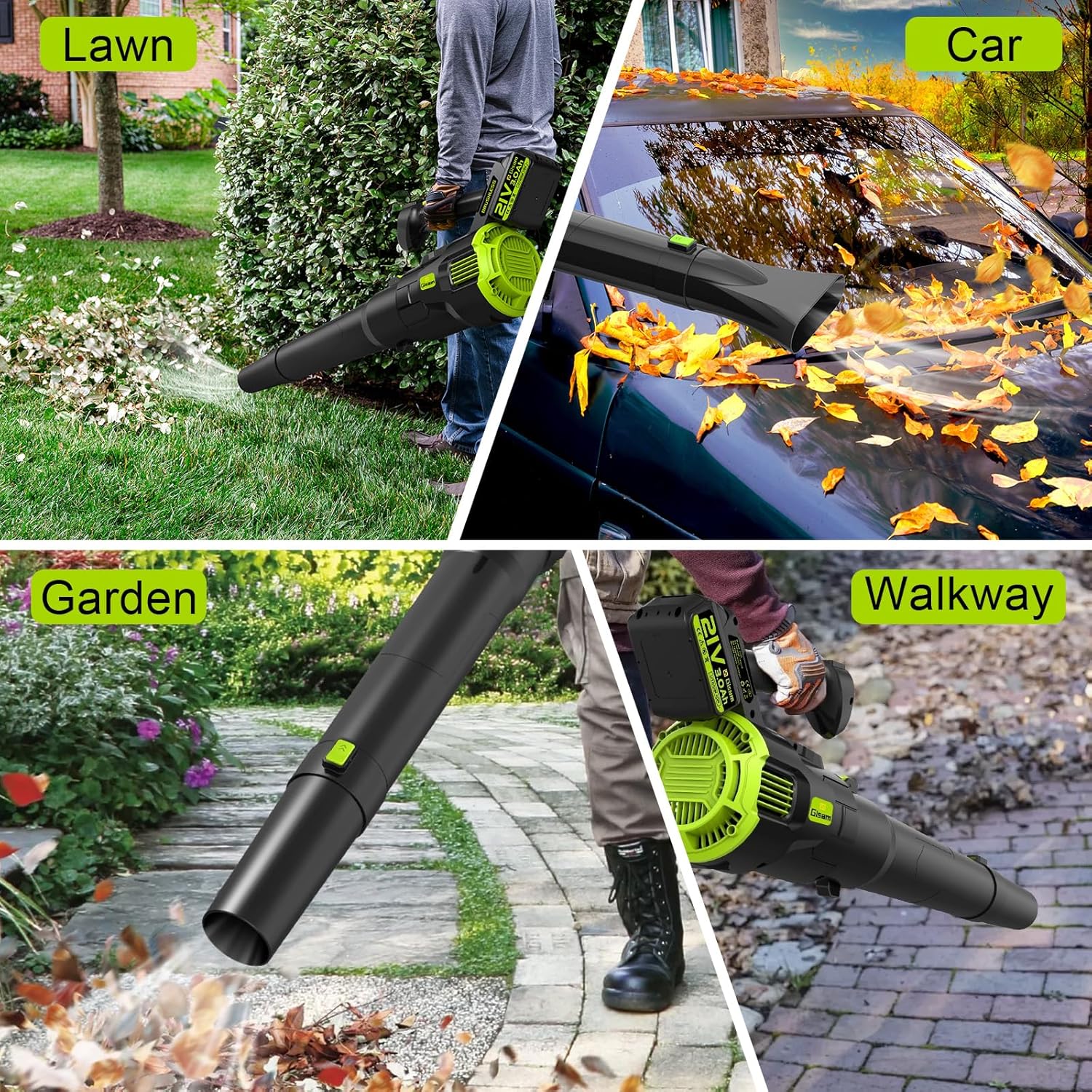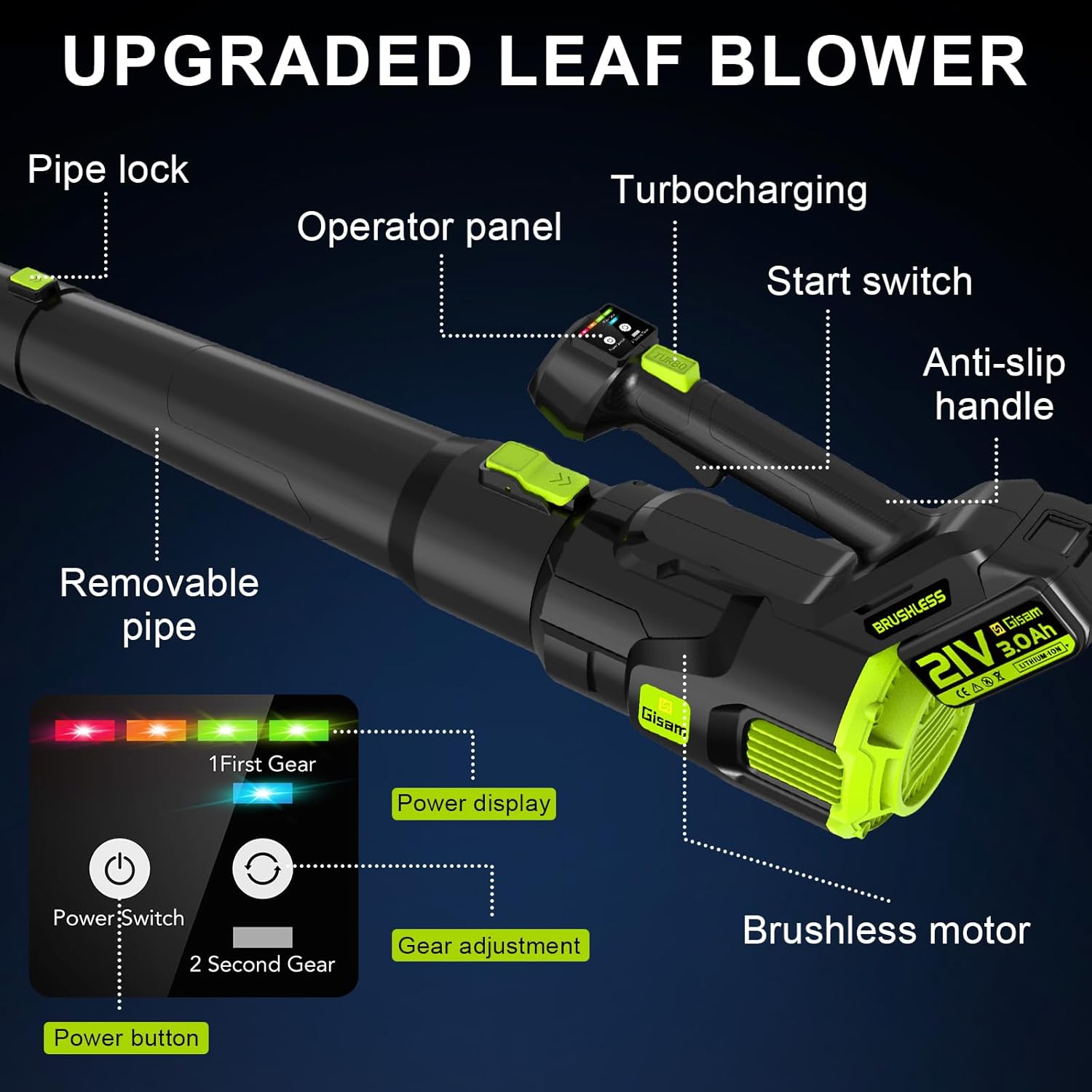 Battery Blower, Gisam Brushless Electric Blower with 2 x 3.0Ah Batteries, Leaf Blower 2 Speeds+Turbo Max Mode 25000RPM, Air Volume 750m³/h for Garden