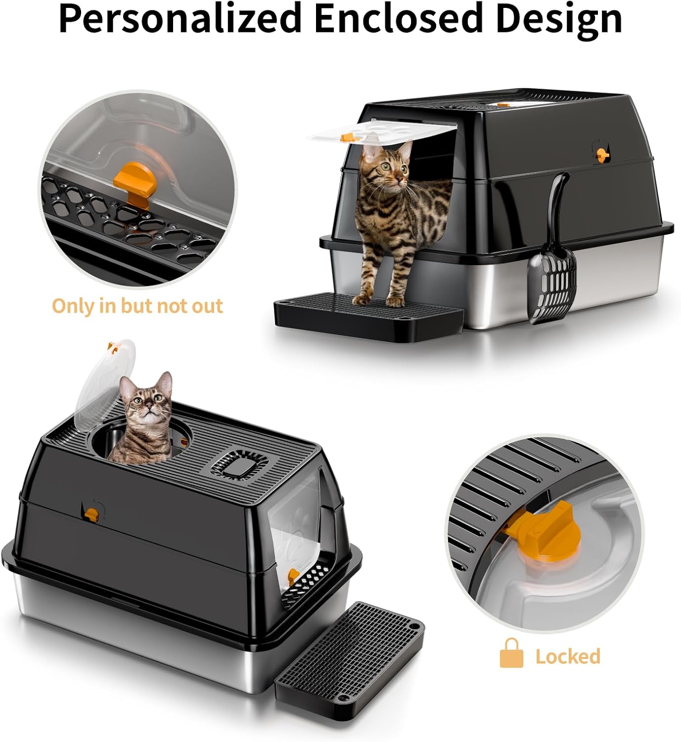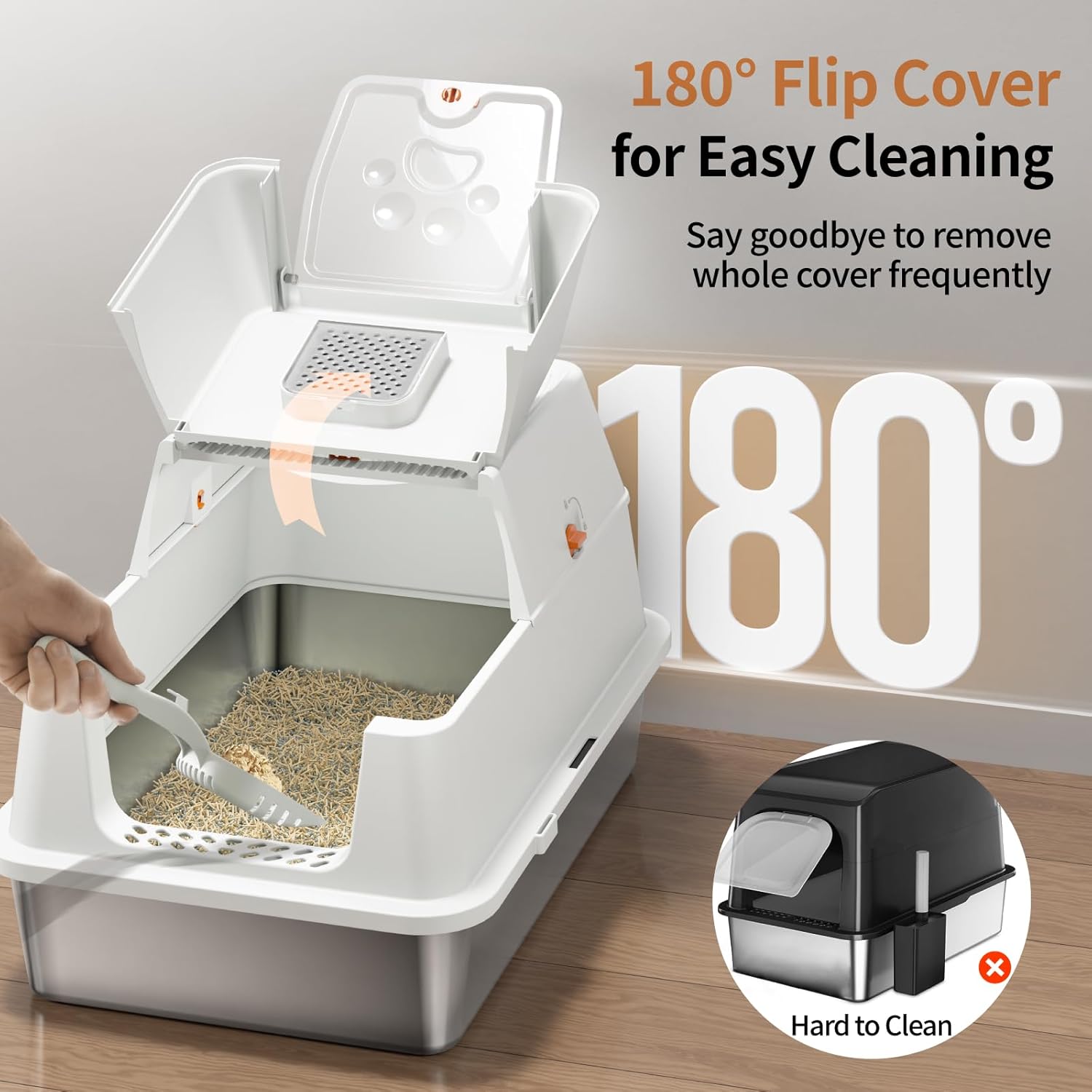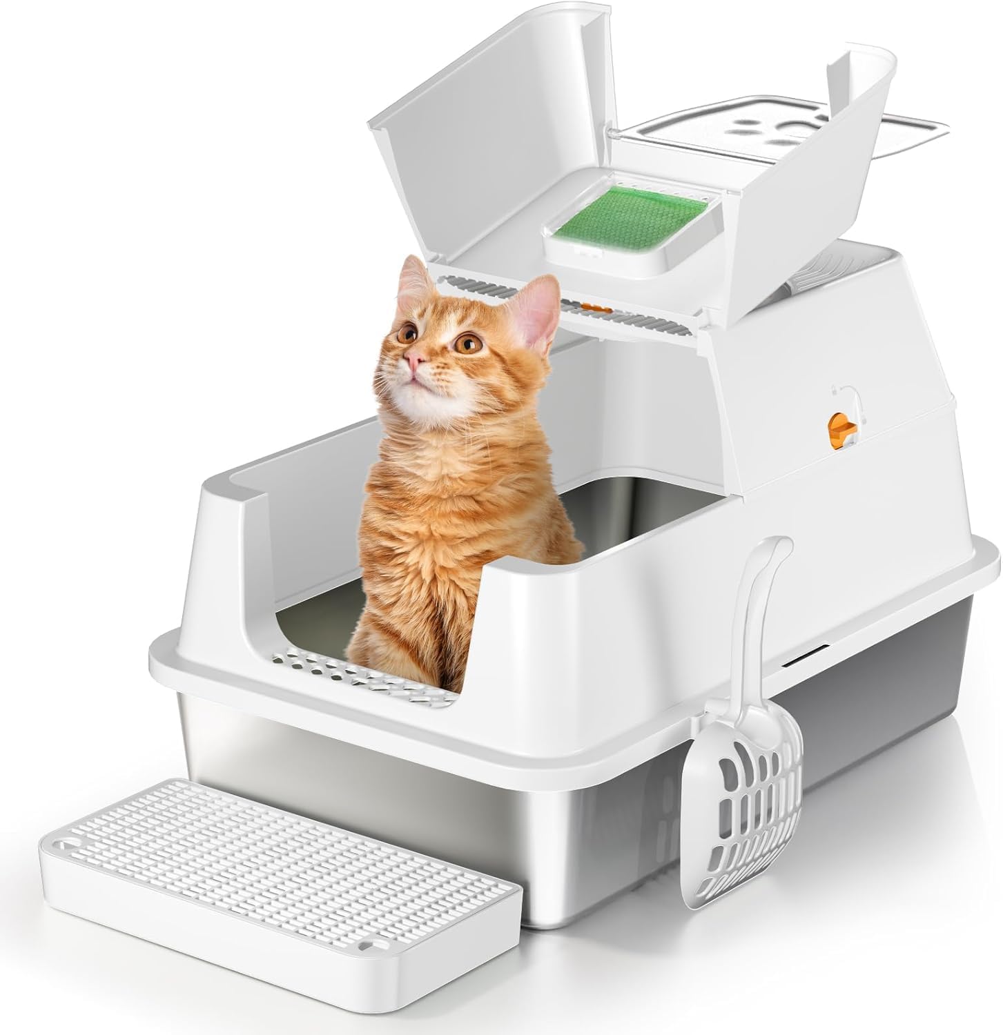 Feandrea Lettiera per Gatti in Acciaio Inossidabile con Coperchio Ribaltabile, Lettiera Chiusa XL Anti Perdite, Paletta, Spazzola, Doppio Ingresso, per Gatti fino a 15 kg, Beige Cappuccino PPT005K01