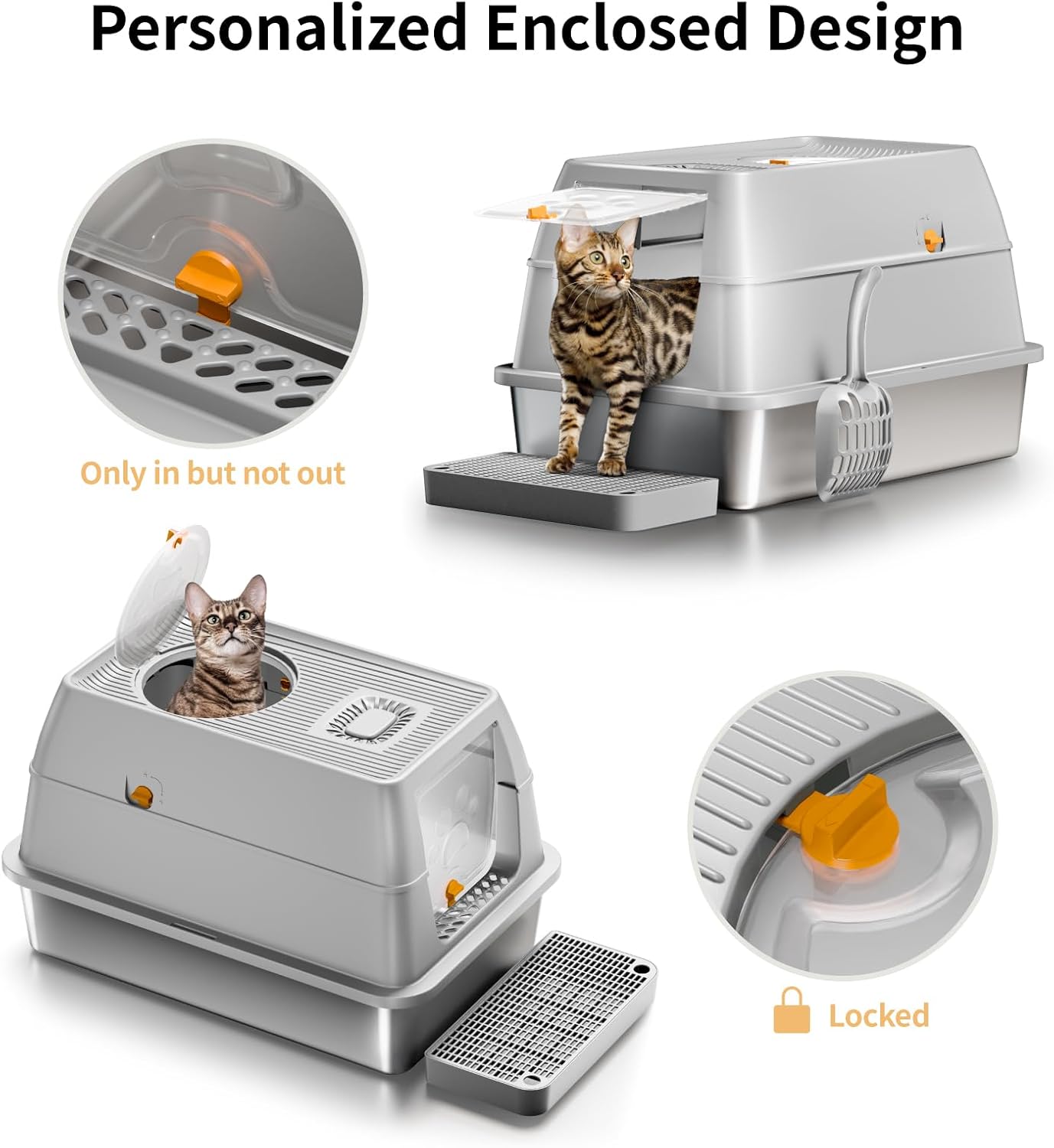 Lettiera per Gatti in Acciaio Inox, Lettiera Gatto Chiusa XXL, Lettiera Gatto Grande con Pala in Metallo, Doppio Strato Opaco Toilette per Gatti Grande - Grigio