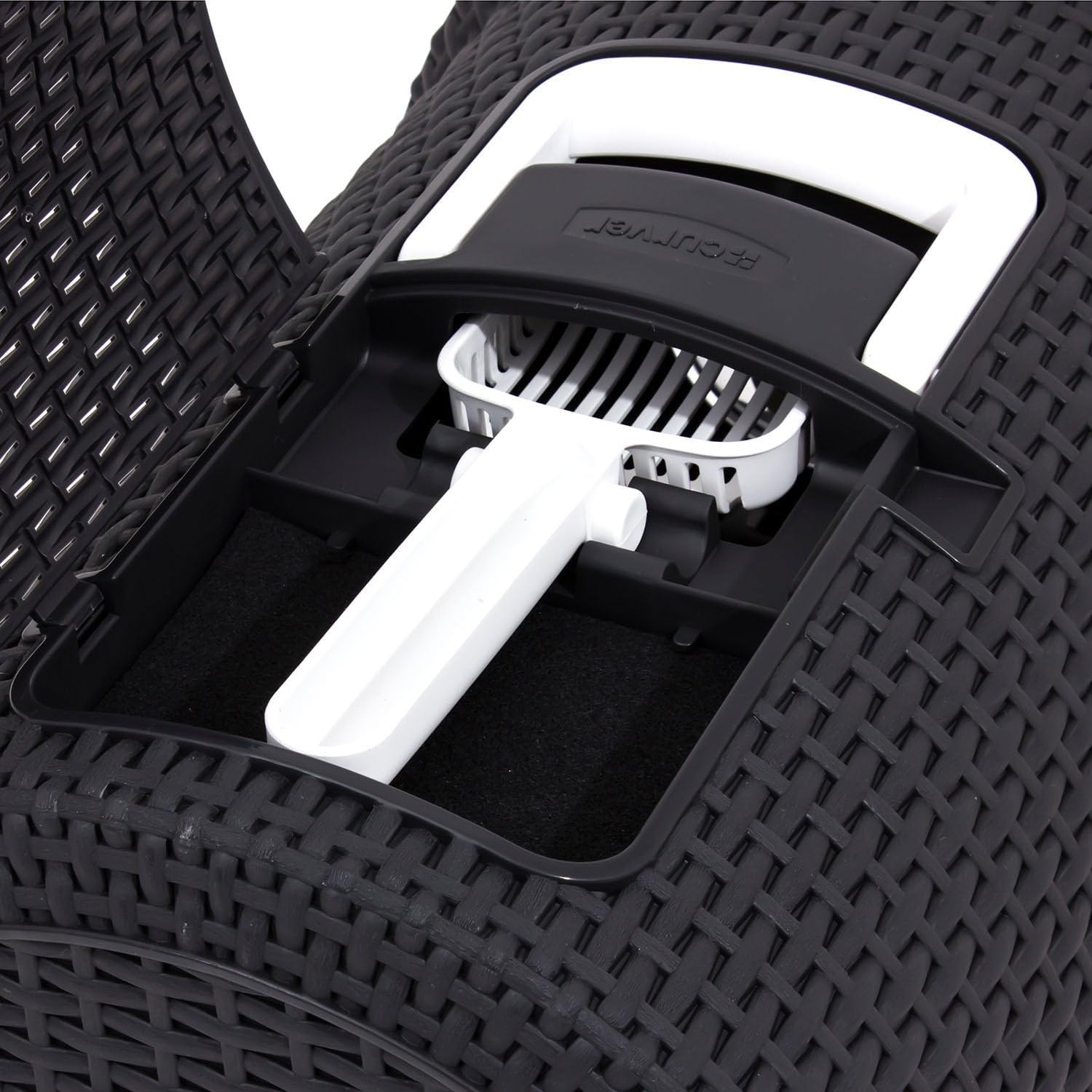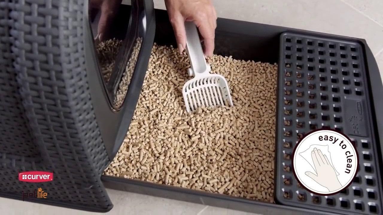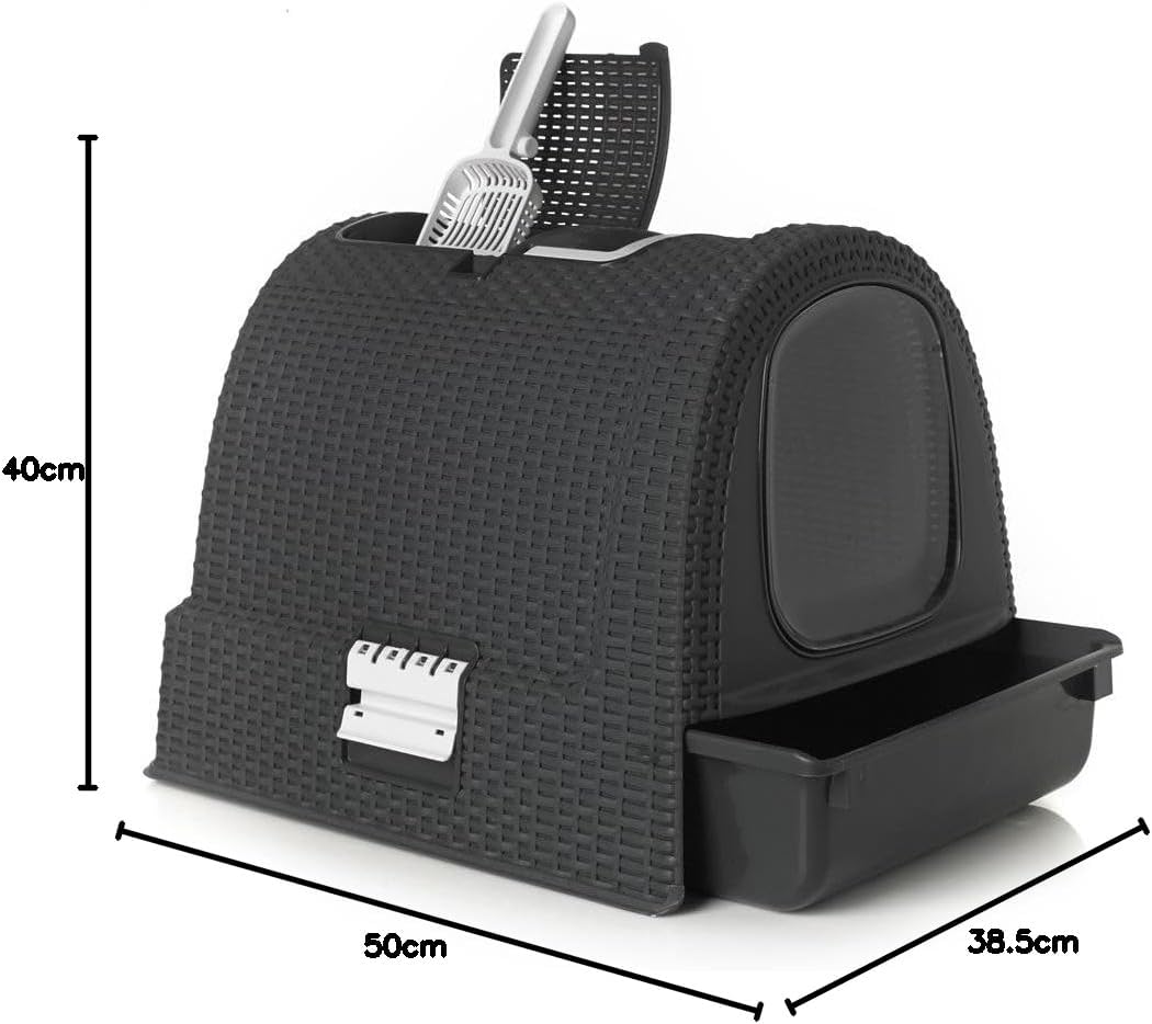 Curver 2068961 lettiera per gatti petlife con coperchio, lettiera con paletta, moderno effetto rattan intrecciato, antracite, 51,5 x 38,5 x 40 cm