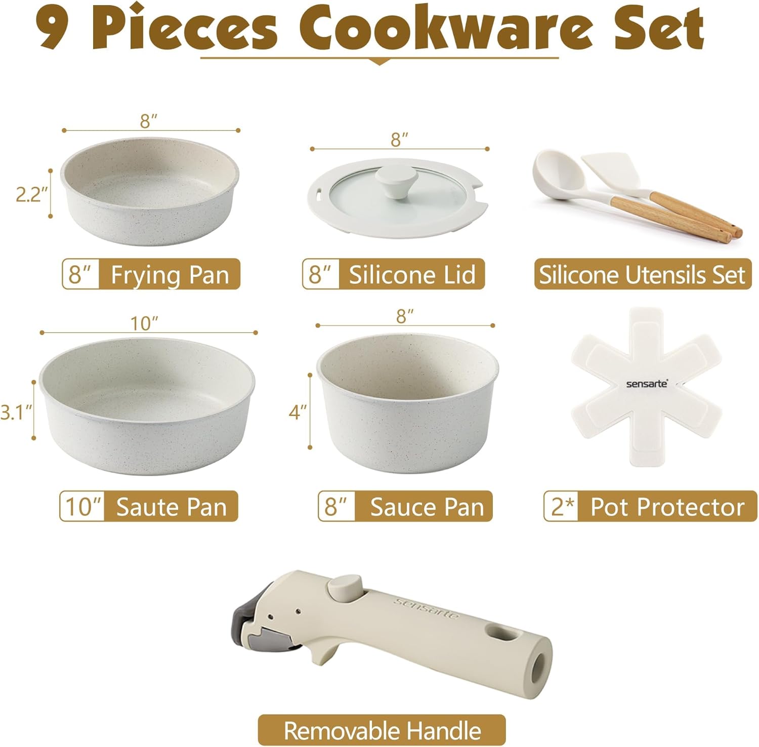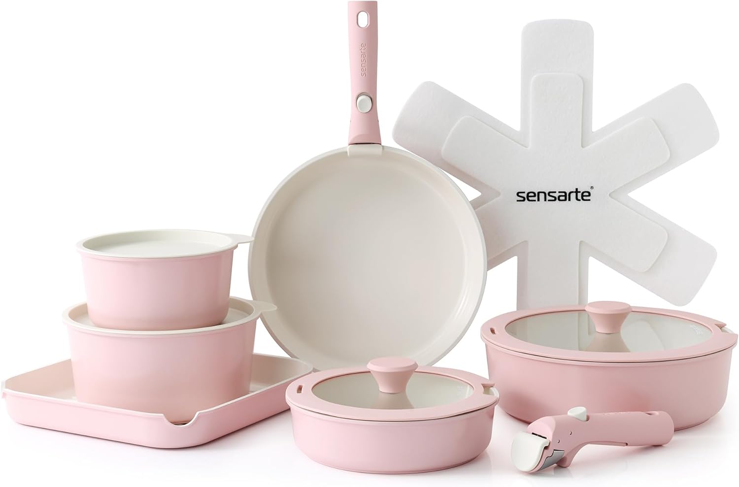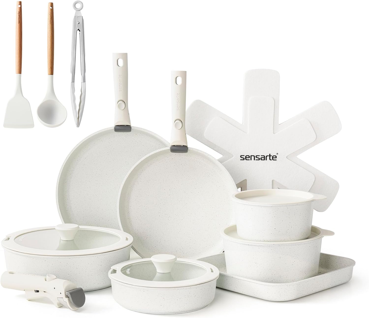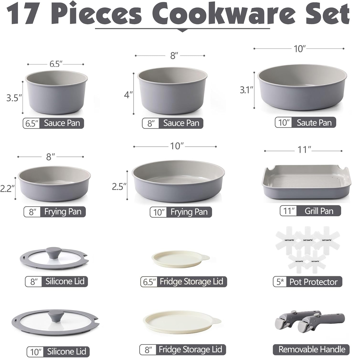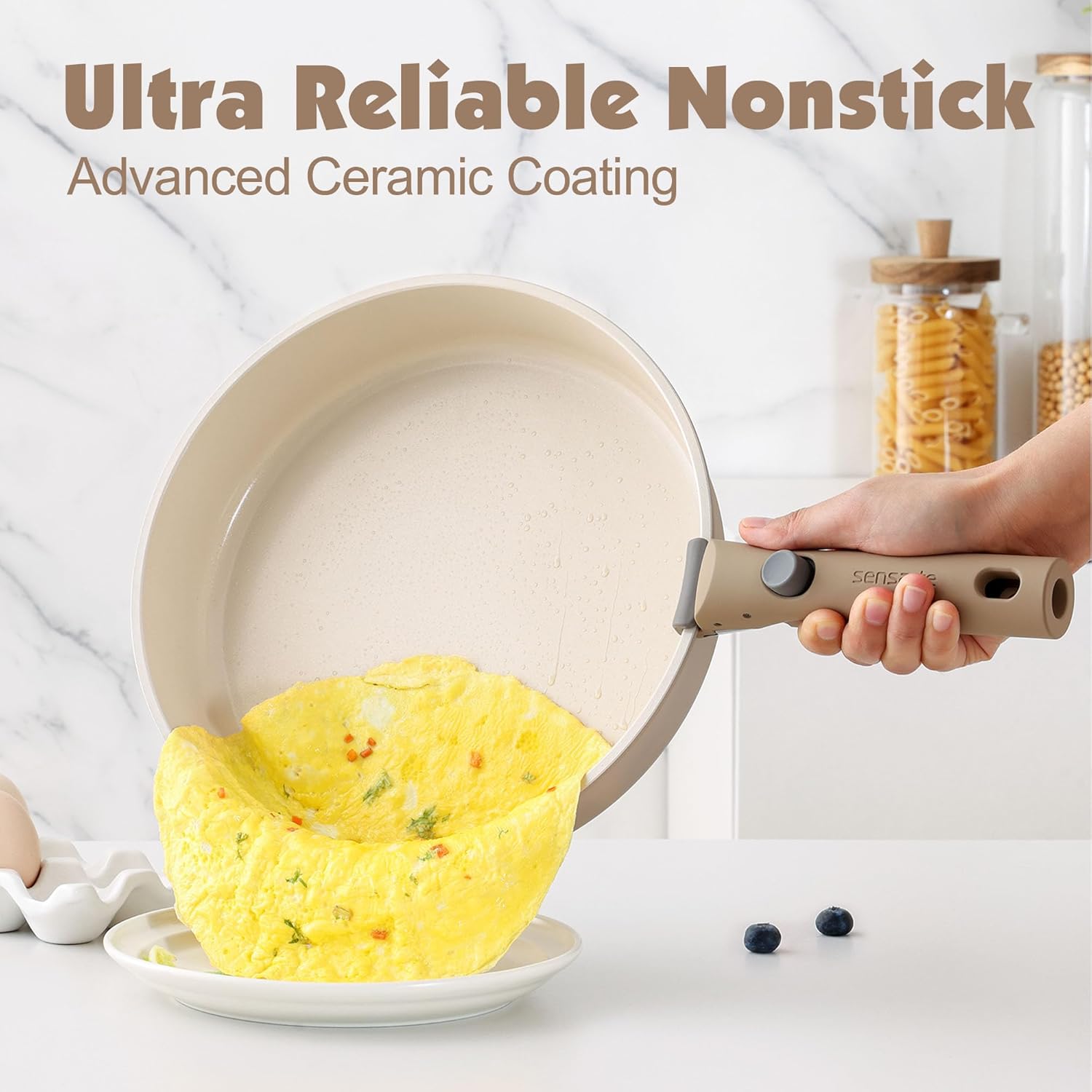 SENSARTE 17 Piece Non-Stick Granite Pan Set with Removable Handles Induction Frying Pan 20/26cm Saucepans 16.5/20cm Wok 26cm Grill Pans 26cm Stackable