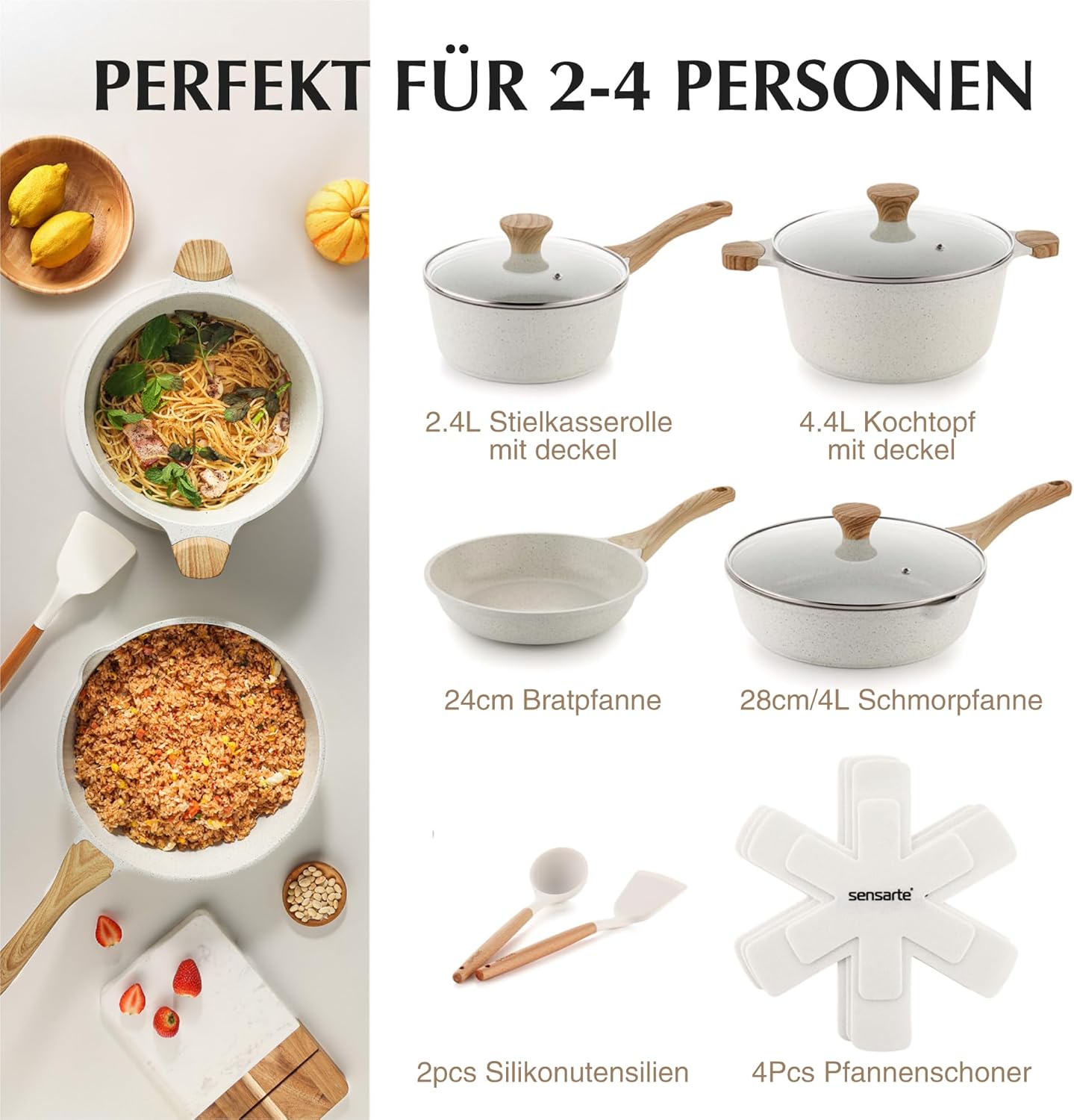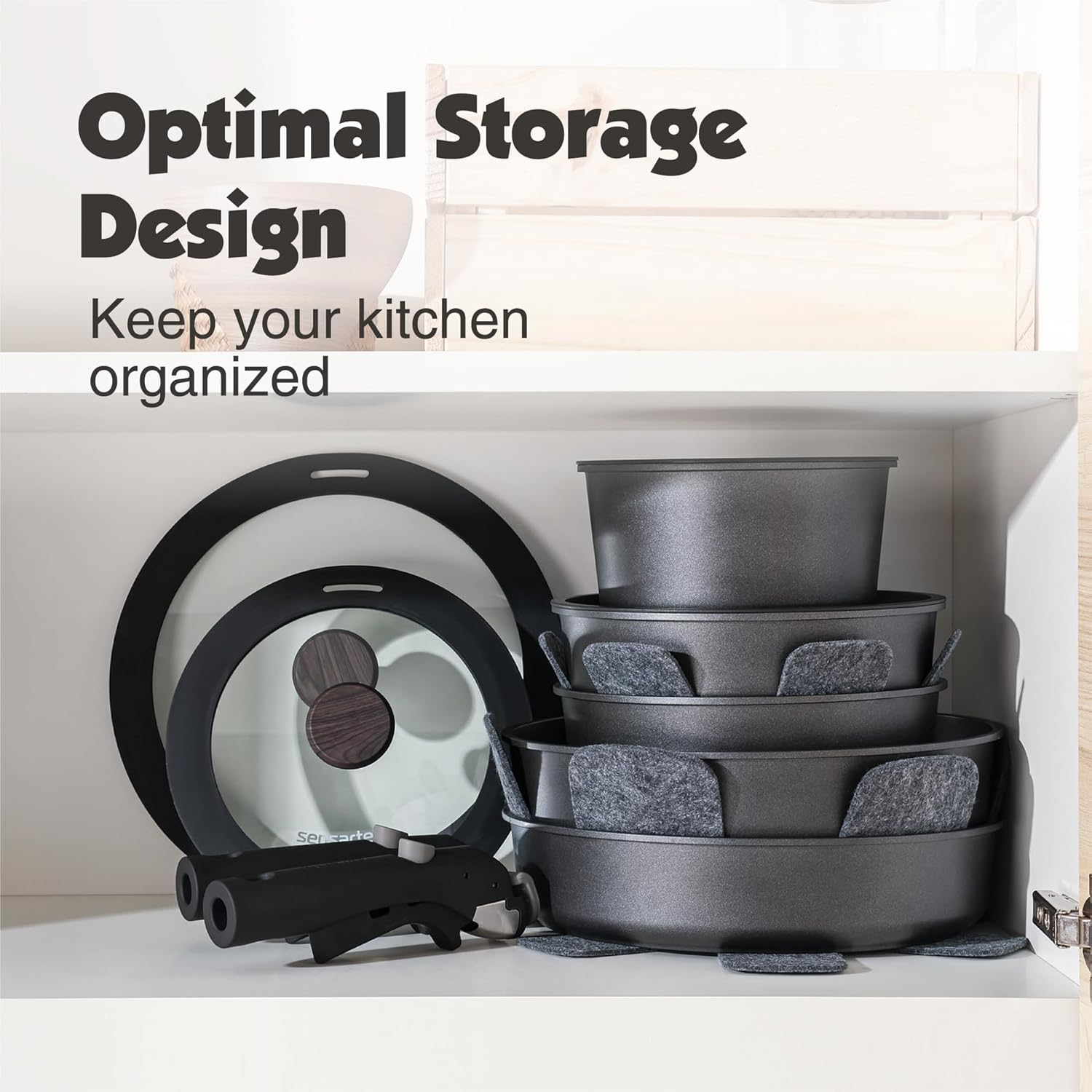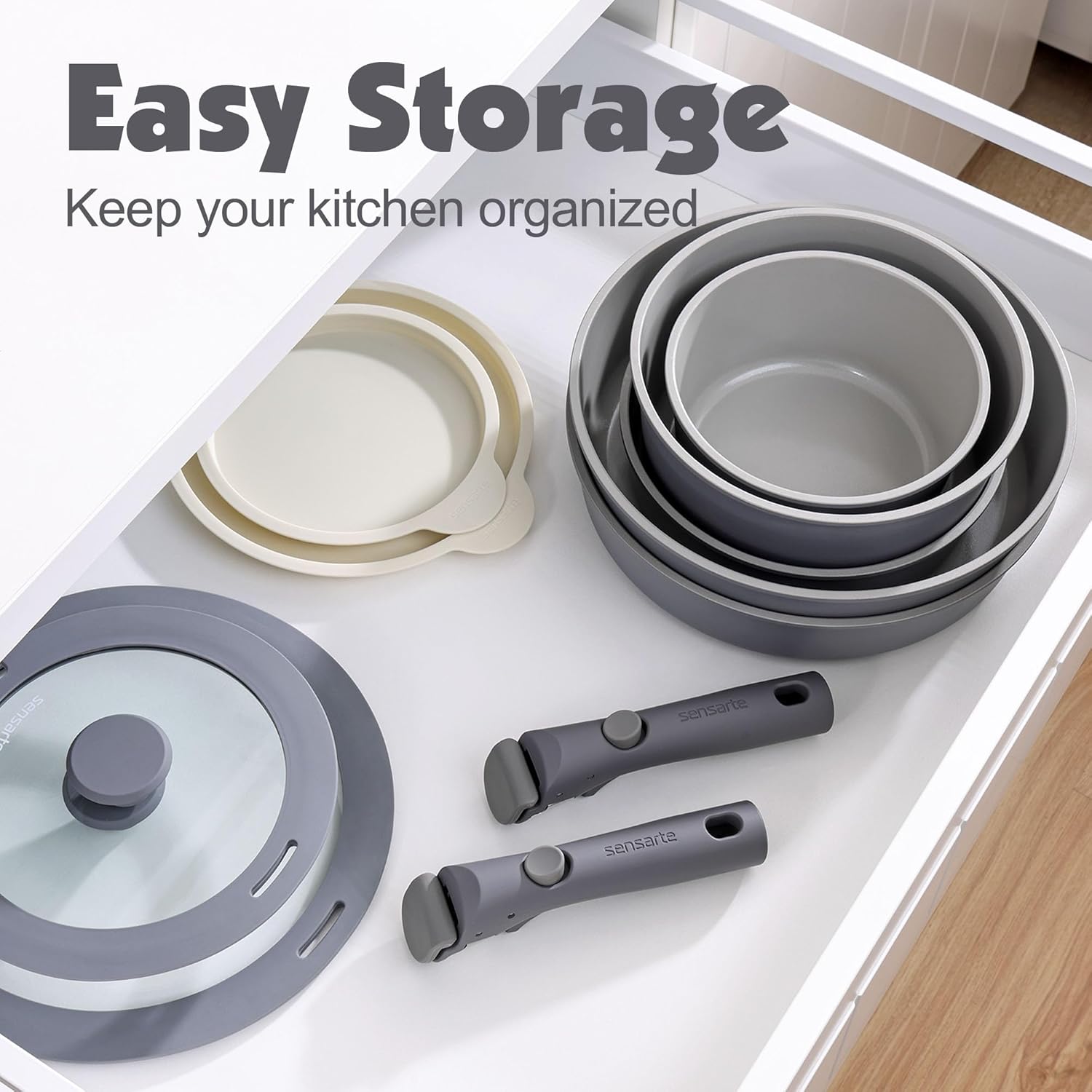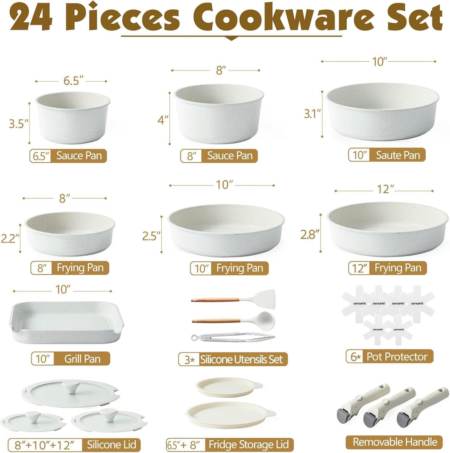 SENSARTE 17 Piece Non-Stick Granite Pan Set with Removable Handles Induction Frying Pan 20/26cm Saucepans 16.5/20cm Wok 26cm Grill Pans 26cm Stackable