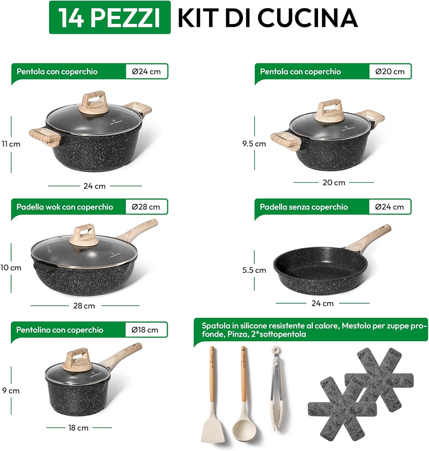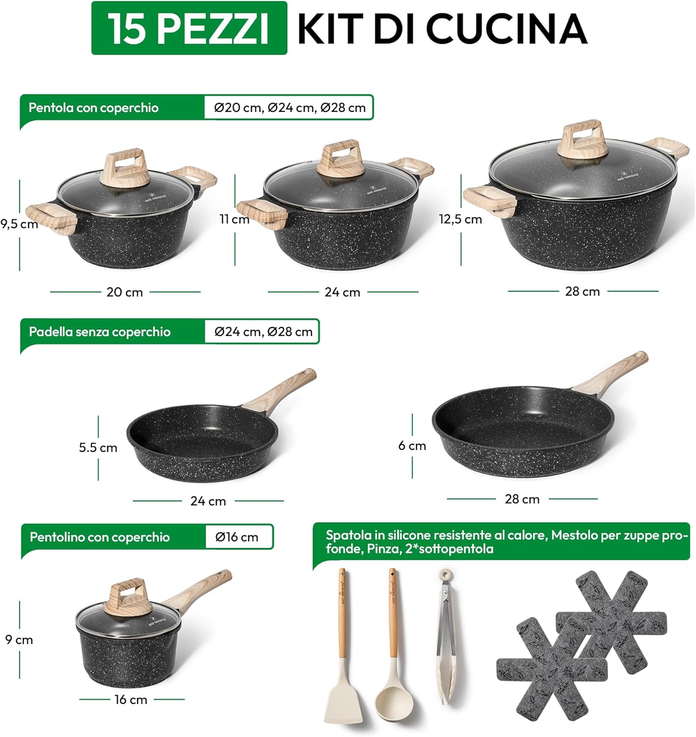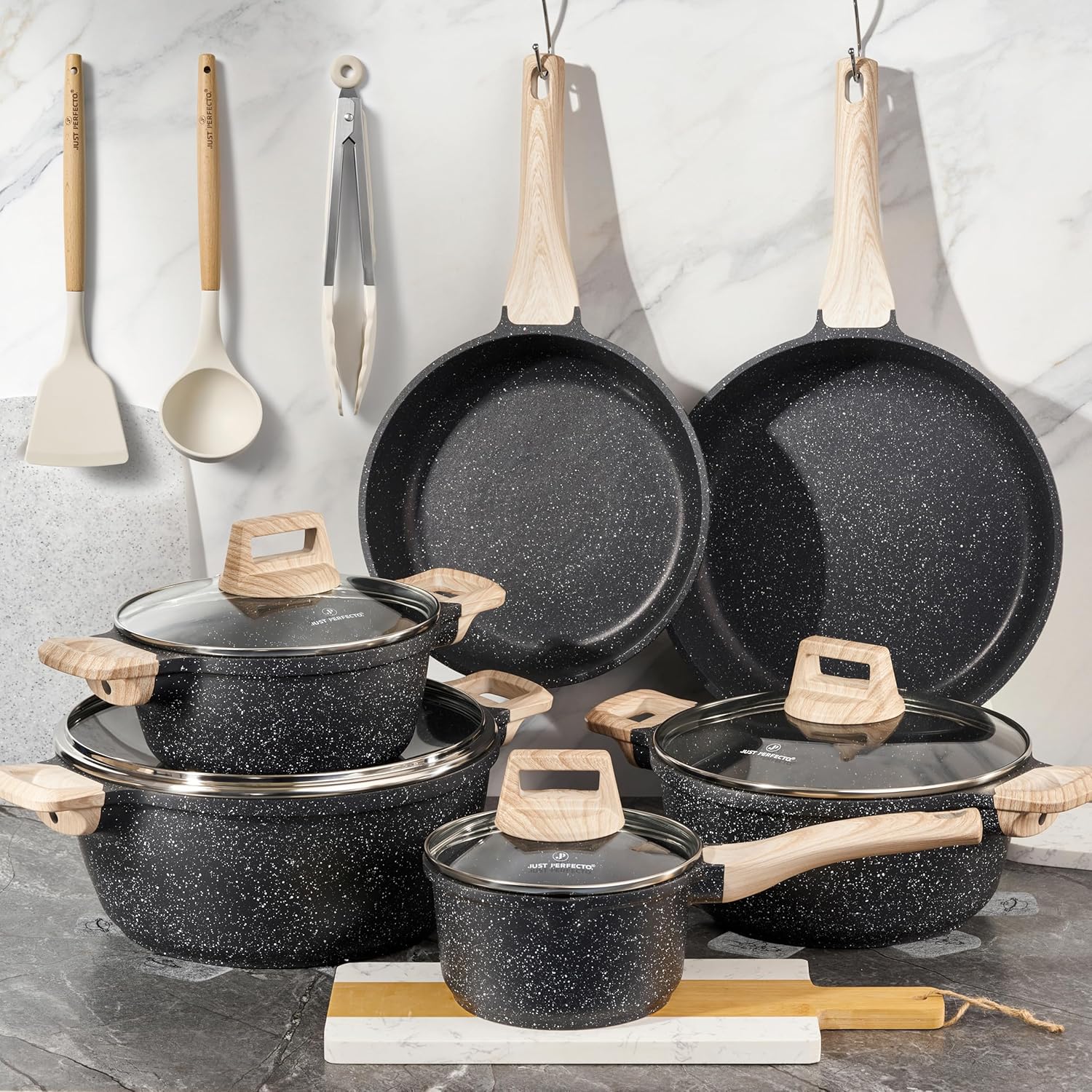 Just Perfect 15 Induction Cookware Set of Pans and Pans Non-Stick for All Hobs Non-Stick Cookware Set 24/28 cm with Lids Set of Induction PFOA and PTFE Free
