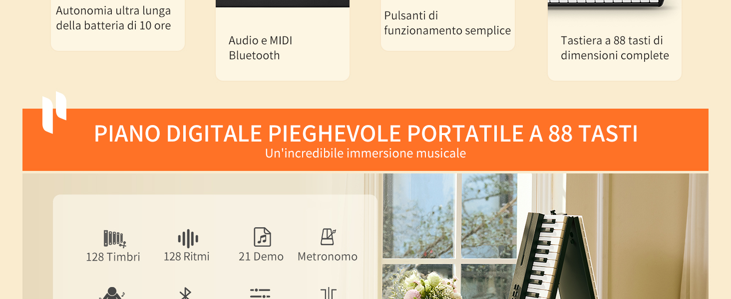 Informazioni su questo articolo 🎼【Pianoforte pieghevole ultraportatile】Tastiera per pianoforte Donner DP-10 a 88 tasti con un design leggero (7,8 lbs/3,5 kg), lunghezza compatta ripiegata (24,7"/62,8 cm). Il pianoforte digitale DP-10 a 88 tasti è una tastiera portatile, ideale per i viaggi e le esibizioni in movimento. 🎼【Collegare più dispositivi】Il pianoforte pieghevole Donner DP-10 supporta la connessione wireless e la connessione USB-MIDI. Per i principianti, è possibile collegare il software del telefono cellulare/iPad per l'insegnamento e la pratica. Per gli amanti della musica, la tastiera del pianoforte pieghevole DP-10 può essere utilizzata anche come dispositivo MIDI, collegato a un software di editing MIDI per la creazione. 🎼【Più funzioni, più divertimento】La tastiera per pianoforte portatile DP-10 è dotata di 128 ritmi, 128 toni, 21 brani dimostrativi, accordi automatici, divisione, registrazione, trasposizione, kit di batteria, ecc. 🎼【Ottimo per tutti i livelli】Il pianoforte digitale DP-10 a 88 tasti è dotato di una tastiera a 88 tasti di dimensioni standard, che offre un tocco delle dita e una profondità dei tasti simili a quelli di un pianoforte. Aiuta bambini e adulti a imparare a suonare il vero pianoforte. Inoltre, i pulsanti operativi di facile utilizzo aiutano gli utenti a cambiare le funzioni in modo più comodo e veloce. 🎼【10 ore di durata della batteria】Il tempo di ricarica del pianoforte a tastiera pieghevole DP-10 è di circa 4 ore e la prima ricarica richiede più di 6 ore. ❗ Il kit del pianoforte digitale DP-10 fornisce un cavo USB C, ma l'adattatore di alimentazione da 5 V/2A non è incluso. › Visualizza altri dettagli prodotto Informazioni su questo articolo 🎼【Pianoforte pieghevole ultraportatile】Tastiera per pianoforte Donner DP-10 a 88 tasti con un design leggero (7,8 lbs/3,5 kg), lunghezza compatta ripiegata (24,7"/62,8 cm). Il pianoforte digitale DP-10 a 88 tasti è una tastiera portatile, ideale per i viaggi e le esibizioni in movimento. 🎼【Collegare più dispositivi】Il pianoforte pieghevole Donner DP-10 supporta la connessione wireless e la connessione USB-MIDI. Per i principianti, è possibile collegare il software del telefono cellulare/iPad per l'insegnamento e la pratica. Per gli amanti della musica, la tastiera del pianoforte pieghevole DP-10 può essere utilizzata anche come dispositivo MIDI, collegato a un software di editing MIDI per la creazione. 🎼【Più funzioni, più divertimento】La tastiera per pianoforte portatile DP-10 è dotata di 128 ritmi, 128 toni, 21 brani dimostrativi, accordi automatici, divisione, registrazione, trasposizione, kit di batteria, ecc. 🎼【Ottimo per tutti i livelli】Il pianoforte digitale DP-10 a 88 tasti è dotato di una tastiera a 88 tasti di dimensioni standard, che offre un tocco delle dita e una profondità dei tasti simili a quelli di un pianoforte. Aiuta bambini e adulti a imparare a suonare il vero pianoforte. Inoltre, i pulsanti operativi di facile utilizzo aiutano gli utenti a cambiare le funzioni in modo più comodo e veloce. 🎼【10 ore di durata della batteria】Il tempo di ricarica del pianoforte a tastiera pieghevole DP-10 è di circa 4 ore e la prima ricarica richiede più di 6 ore. ❗ Il kit del pianoforte digitale DP-10 fornisce un cavo USB C, ma l'adattatore di alimentazione da 5 V/2A non è incluso. › Visualizza altri dettagli prodotto