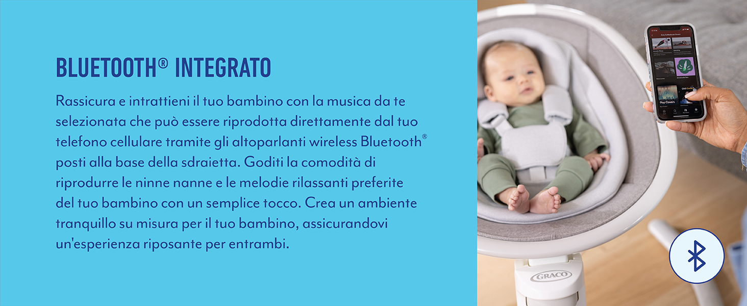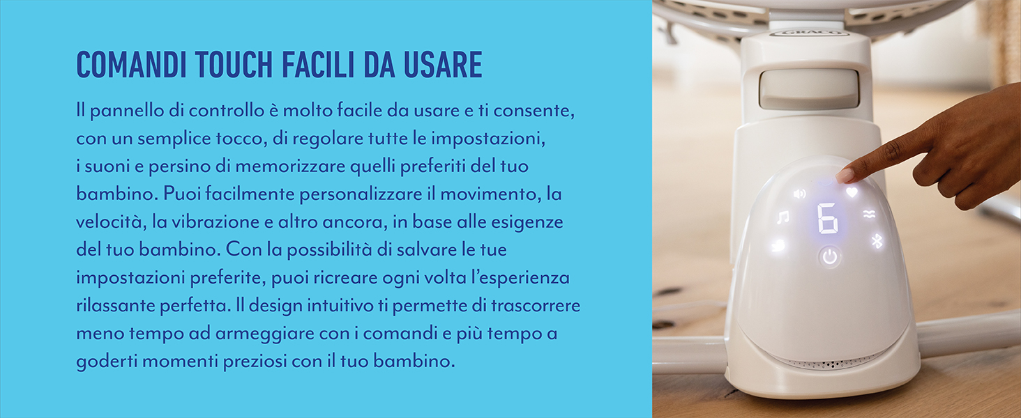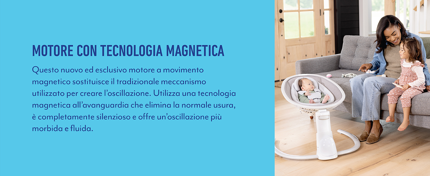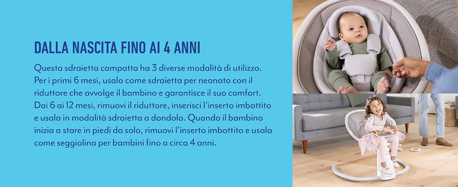 Informazioni su questo articolo 3 modalità: sdraietta per neonato: dalla nascita fino a ca. 6 mesi (massimo 9 kg); sdraietta a dondolo dalla nascia fino ai 12 mesi circa (max. 11 kg); seggiolina (stazionaria) da 12 mesi a 4 anni ca. (11-18kg) Tecnologia del motore a ovimento magnetico per un'oscillazione silenziosa e fluida; Bluetooth integrato per lo streaming di musica personalizzata Semplici comandi touch per una facile regolazione e per il salvataggio delle impostazioni preferite; leggera, con 7,5 kg per trasportarla e riporla facilmente Vibrazione a 4 velocità; 6 velocità di oscillazione laterale; altezza regolabile in 4 posizioni; reclinazione in 3 posizioni; 9 melodie e 9 suoni della natura Seduta profonda e avvolgente; tessuti morbidi per un comfort ottimale; cintura a 5 punti per dondolare e rilassarsi in sicurezza; struttura robusta per un utilizzo affidabile › Visualizza altri dettagli prodotto Informazioni su questo articolo 3 modalità: sdraietta per neonato: dalla nascita fino a ca. 6 mesi (massimo 9 kg); sdraietta a dondolo dalla nascia fino ai 12 mesi circa (max. 11 kg); seggiolina (stazionaria) da 12 mesi a 4 anni ca. (11-18kg) Tecnologia del motore a ovimento magnetico per un'oscillazione silenziosa e fluida; Bluetooth integrato per lo streaming di musica personalizzata Semplici comandi touch per una facile regolazione e per il salvataggio delle impostazioni preferite; leggera, con 7,5 kg per trasportarla e riporla facilmente Vibrazione a 4 velocità; 6 velocità di oscillazione laterale; altezza regolabile in 4 posizioni; reclinazione in 3 posizioni; 9 melodie e 9 suoni della natura Seduta profonda e avvolgente; tessuti morbidi per un comfort ottimale; cintura a 5 punti per dondolare e rilassarsi in sicurezza; struttura robusta per un utilizzo affidabile › Visualizza altri dettagli prodotto