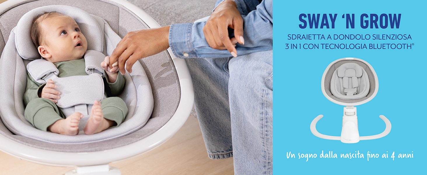 Ti presentiamo Sway ‘n Grow, la nuova sdraietta a dondolo progettata per crescere con il tuo bambino dalla nascita fino all'età di 4 anni. Questa innovativa sdraietta offre tre diverse modalità di utilizzo, trasformandosi da sdraietta per neonati a sdraietta a dondolo per bebè e infine in una comoda seggiolina per bambini. Il design compatto è ricco di incredibili funzionalità, rendendolo il posto preferito del tuo bambino per dondolarsi e rilassarsi. Con la tecnologia Bluetooth® e semplici comandi touch, puoi facilmente riprodurre in streaming le canzoni preferite del tuo bambino per calmarlo e farlo felice. L'avanzata tecnologia del motore a movimento magnetico garantisce un'esperienza completamente silenziosa, consentendo al tuo bambino di rilassarsi senza essere distratto da alcun rumore. È la combinazione perfetta di funzionalità high-tech e comfort rilassante. Ulteriori funzionalità per questa sdraietta a dondolo 3 in 1 includono: 6 velocità di oscillazione laterale per adattarsi all'umore del tuo bambino; vibrazione rilassante a 4 velocità; e l’altezza regolabile in 4 posizioni per mantenere il tuo bambino comodo durante la crescita. Con 3 posizioni di reclinazione, il sedile profondo e i morbidi tessuti, il tuo bambino starà sempre comodo e sicuro. Arricchisci la sua esperienza sensoriale con 9 melodie rilassanti e 9 suoni della natura, creando un'atmosfera serena per i momenti di riposo. Sway ‘n Grow unisce perfettamente lusso e funzionalità, assicurando che tu e il tuo bambino possiate godervi momenti di pace insieme.