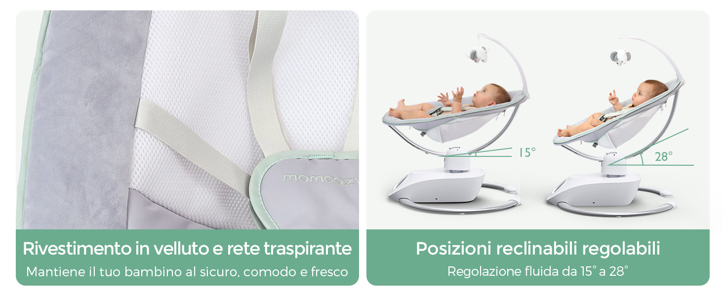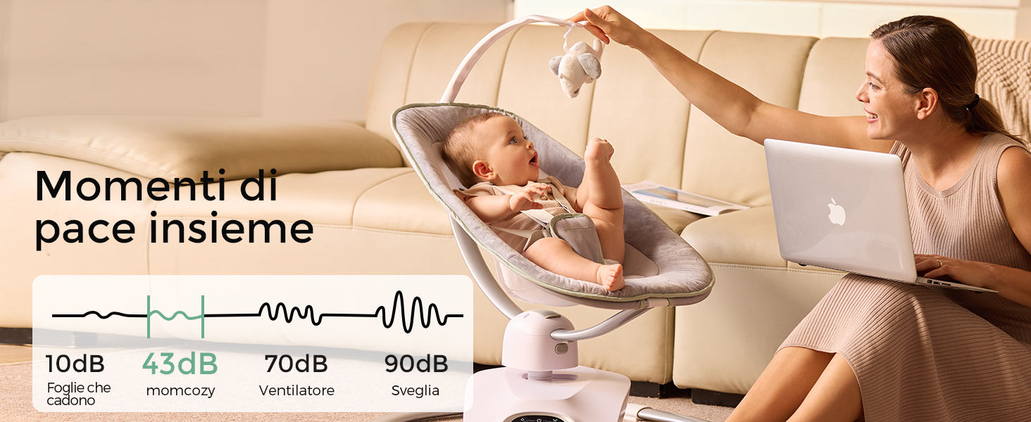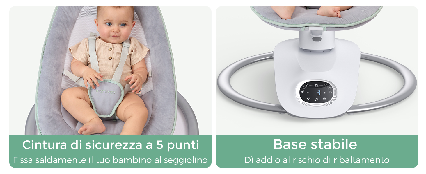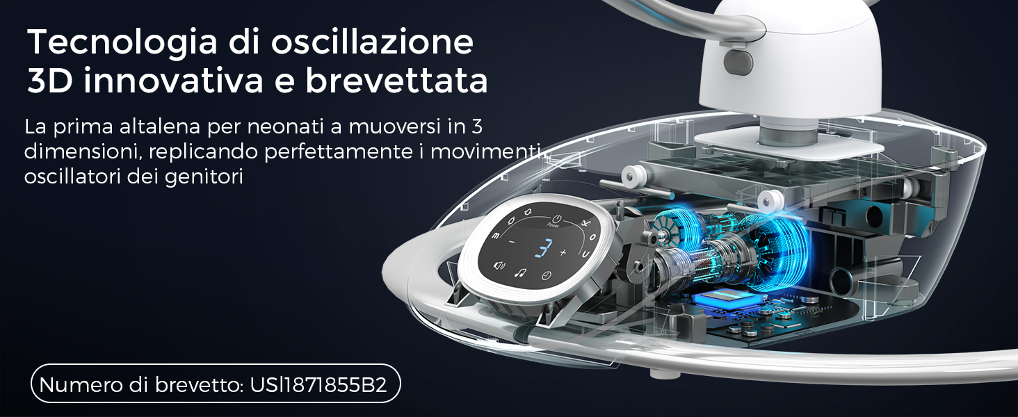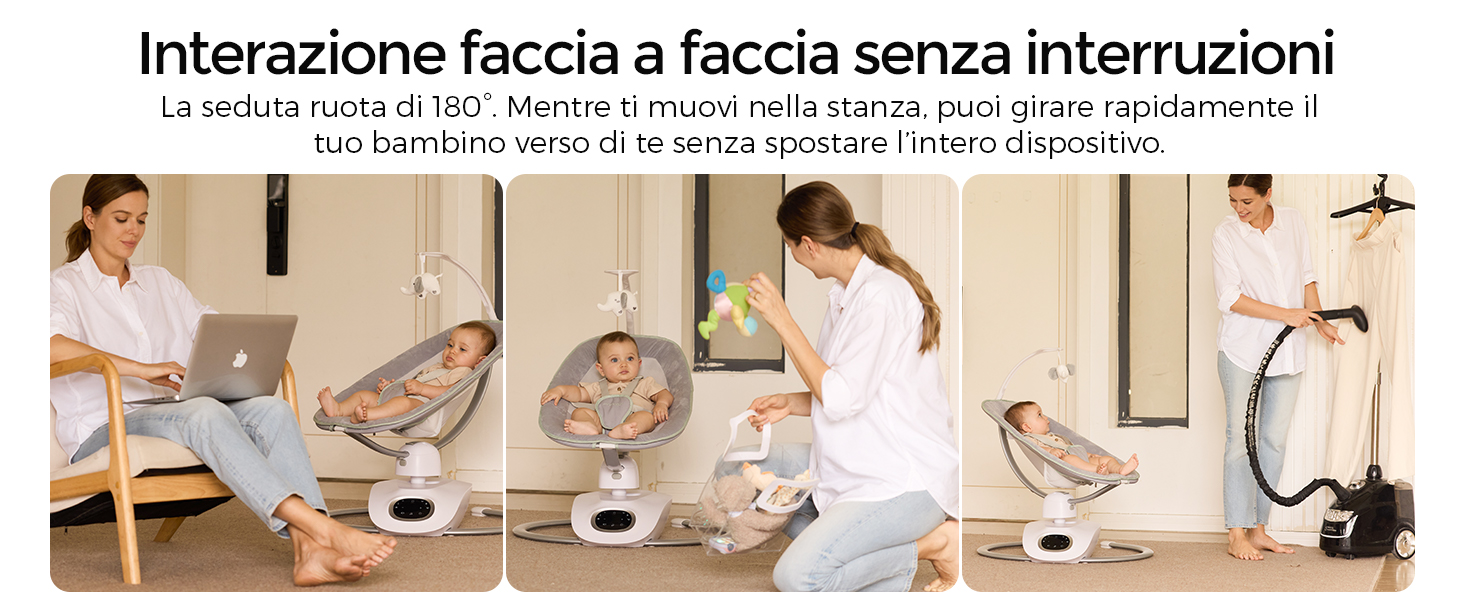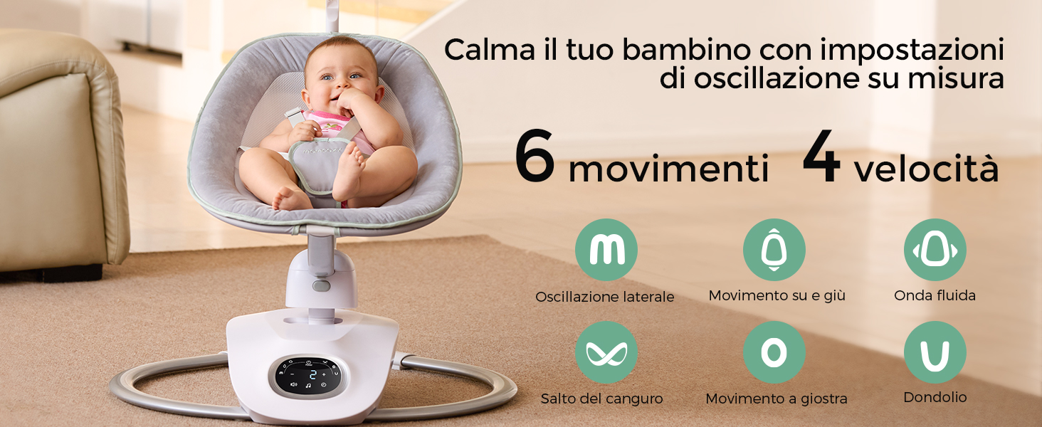 Informazioni su questo articolo Calma e intrattieni il tuo bambino con facilità: La nostra esclusiva tecnologia brevettata per l'altalena 3D aggiunge una nuova dimensione al movimento oscillante, eliminando il monotono dondolio laterale e offrendo al tuo bambino più modalità di divertimento 6 movimenti rilassanti con 4 velocità: Ispirata dai veri genitori. L'altalena elettrica per neonati offre movimenti laterali, rimbalzi delicati e forme uniche come 8, M, O e U. Scegli tra 4 velocità di oscillazione per adattarsi al ritmo unico del tuo bambino Rimani in contatto con il tuo bambino: Il seggiolino dell'altalena ruota facilmente di 180° – senza bisogno di spostare l'intero dispositivo. Mantieni il contatto visivo e interagisci con il tuo bambino mentre ti muovi nella stanza Sicurezza migliorata per la tua tranquillità: Un'imbracatura a 5 punti mantiene il tuo bambino al sicuro sul seggiolino. La base in metallo robusta dell'altalena evita il rischio di ribaltamento Seduta comoda e reclinabile: Seduta ampia e soffice con tessuto in velluto morbido ai bordi e rete traspirante per offrire al tuo bambino un comfort superiore. Si reclina dolcemente da 15° a 28° › Visualizza altri dettagli prodotto Informazioni su questo articolo Calma e intrattieni il tuo bambino con facilità: La nostra esclusiva tecnologia brevettata per l'altalena 3D aggiunge una nuova dimensione al movimento oscillante, eliminando il monotono dondolio laterale e offrendo al tuo bambino più modalità di divertimento 6 movimenti rilassanti con 4 velocità: Ispirata dai veri genitori. L'altalena elettrica per neonati offre movimenti laterali, rimbalzi delicati e forme uniche come 8, M, O e U. Scegli tra 4 velocità di oscillazione per adattarsi al ritmo unico del tuo bambino Rimani in contatto con il tuo bambino: Il seggiolino dell'altalena ruota facilmente di 180° – senza bisogno di spostare l'intero dispositivo. Mantieni il contatto visivo e interagisci con il tuo bambino mentre ti muovi nella stanza Sicurezza migliorata per la tua tranquillità: Un'imbracatura a 5 punti mantiene il tuo bambino al sicuro sul seggiolino. La base in metallo robusta dell'altalena evita il rischio di ribaltamento Seduta comoda e reclinabile: Seduta ampia e soffice con tessuto in velluto morbido ai bordi e rete traspirante per offrire al tuo bambino un comfort superiore. Si reclina dolcemente da 15° a 28° › Visualizza altri dettagli prodotto