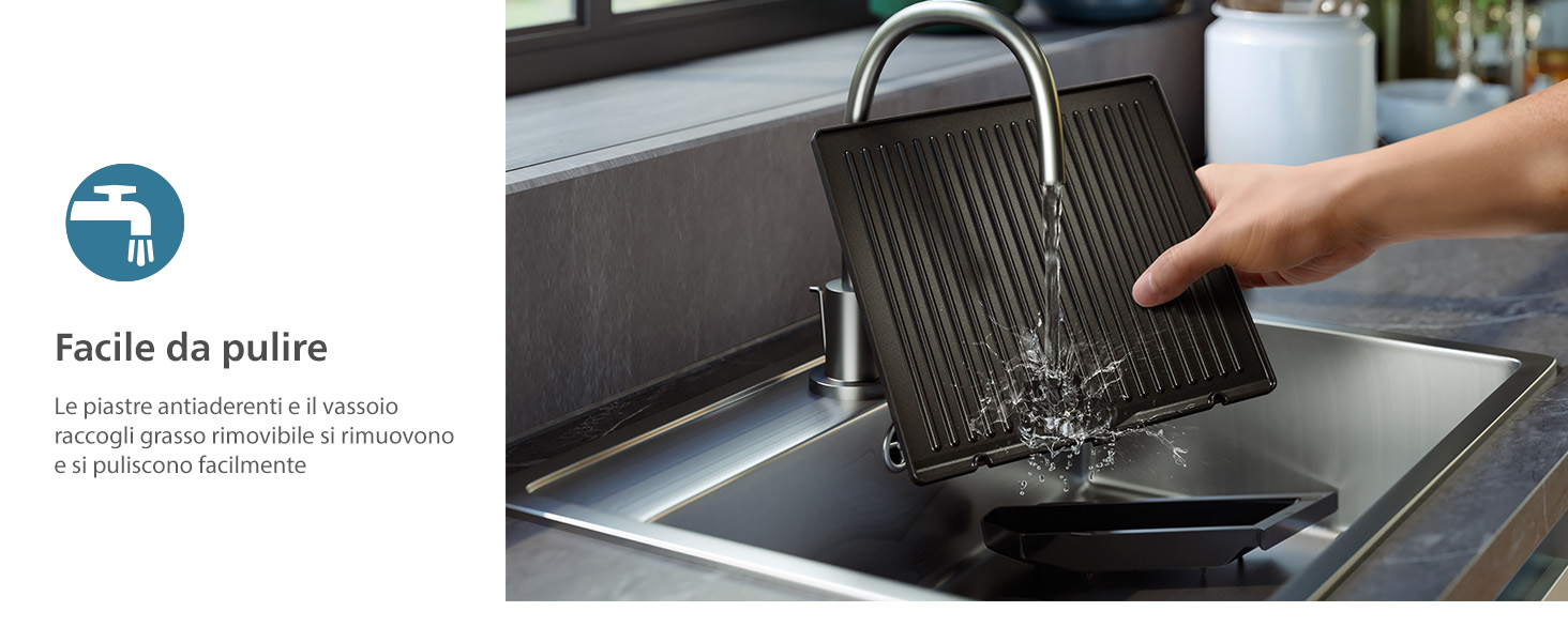 - Grill da tavolo: Si apre a 180° per trasformarsi in una griglia da tavolo, per grigliare carne e verdure su entrambi i lati contemporaneamente